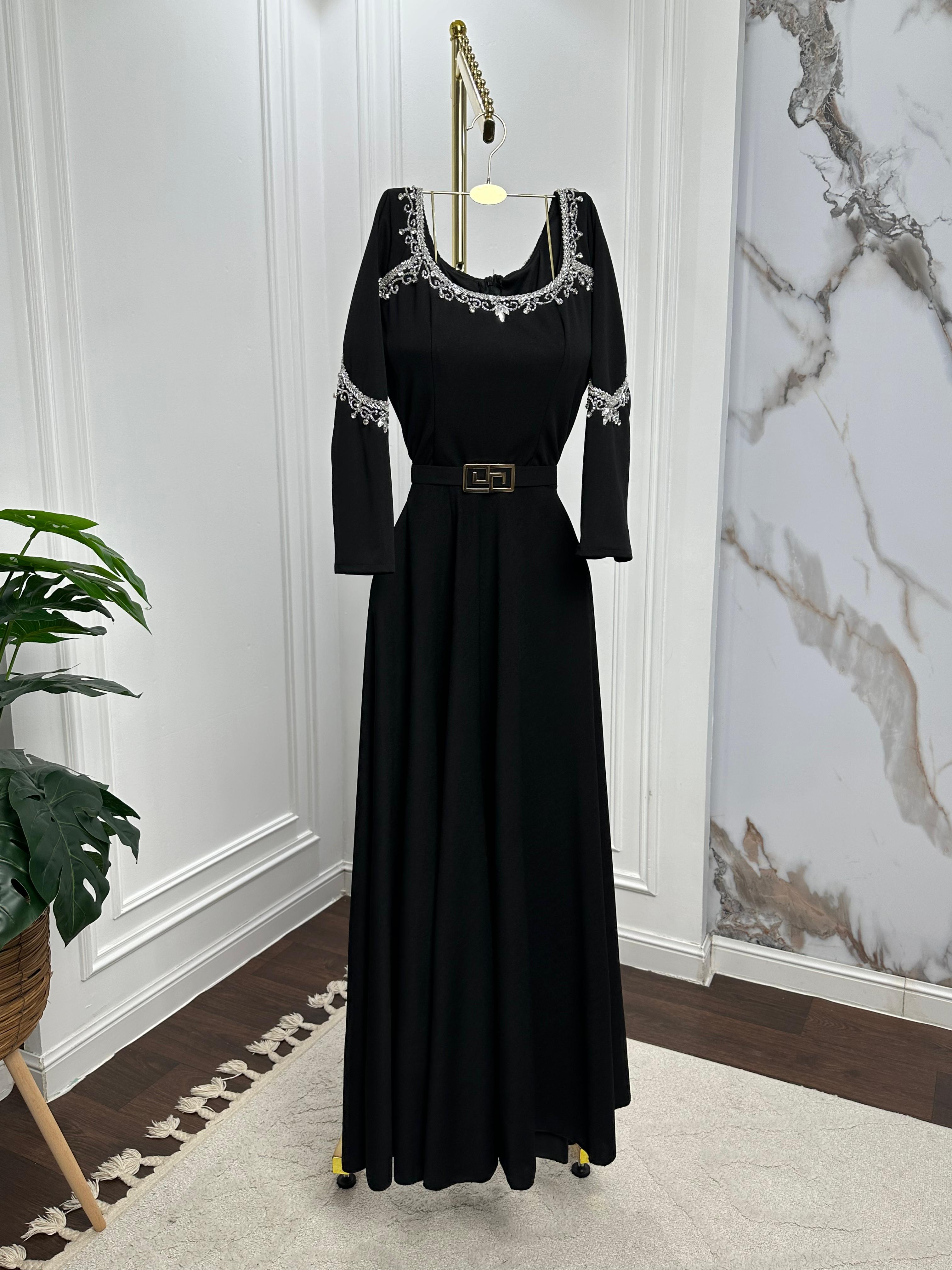 - فستان سهرة أسود أنيق بتصميم ملكي، يتميز بياقة واسعة تكشف الأكتاف وتطريزات فضية فاخرة تضيف لمسة من الفخامة. القماش السميك والانسيابي يمنح الفستان هيبة وجاذبية راقية، مع حزام بسيط على الخصر يعزز من جمال القوام. مثالي للمناسبات الرسمية والسهرات المميزة. .