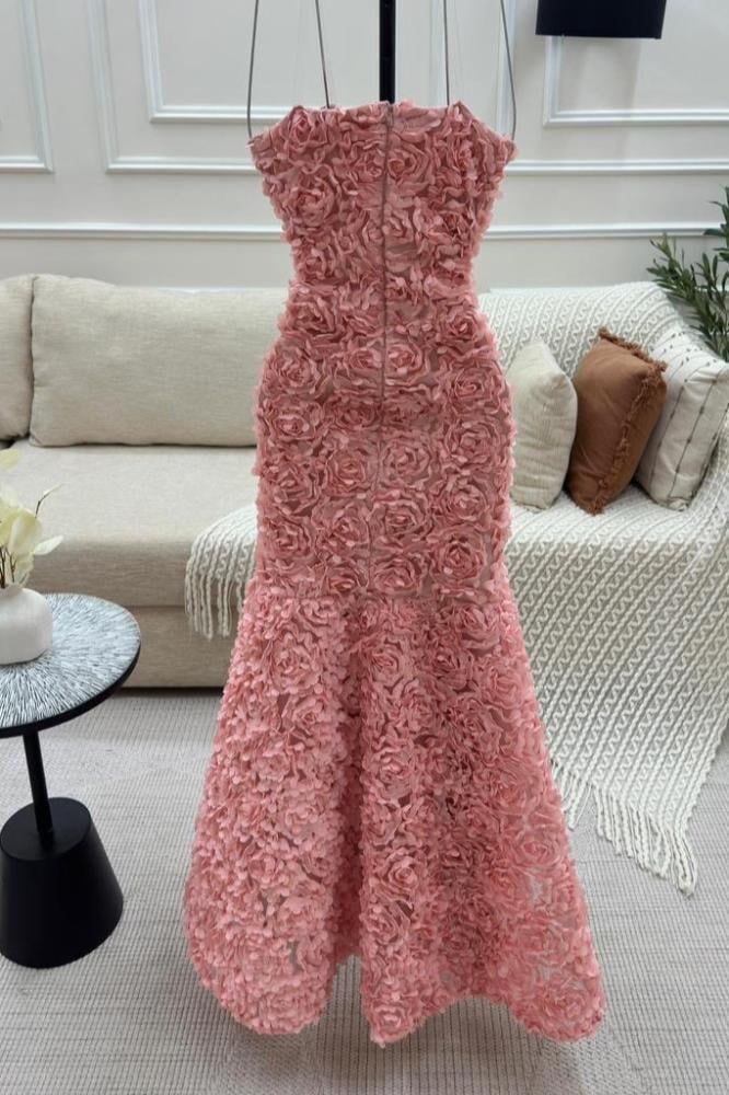 فستان وردي ملكي مطرّز بزهور ثلاثية الأبعاد يفيض بالرقة والأنوثة. قصّته الراقية تعانق الخصر برشاقة وتمنحك قوامًا ممشوقًا يلفت الأنظار. خامته الفاخرة ولمعانه الناعم يضيفان لمسة من السحر، لتتألقي كأميرة في كل مناسبة. إكسسوارات فضية أو ذهبية ستزيد من جمال الإطلالة وتجعلها أكثر إشراقًا