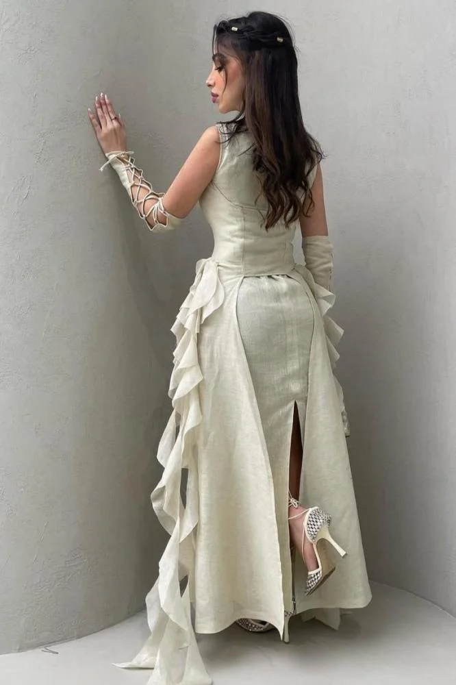 • نوع القماش: صُمم الفستان من قماش الكتان الطبيعي الفاخر (Linen)، وهو ما يمنحه مظهراً عضوياً راقياً يجمع بين القوة والراحة، مع الحفاظ على هيكل التصميم المعقد.