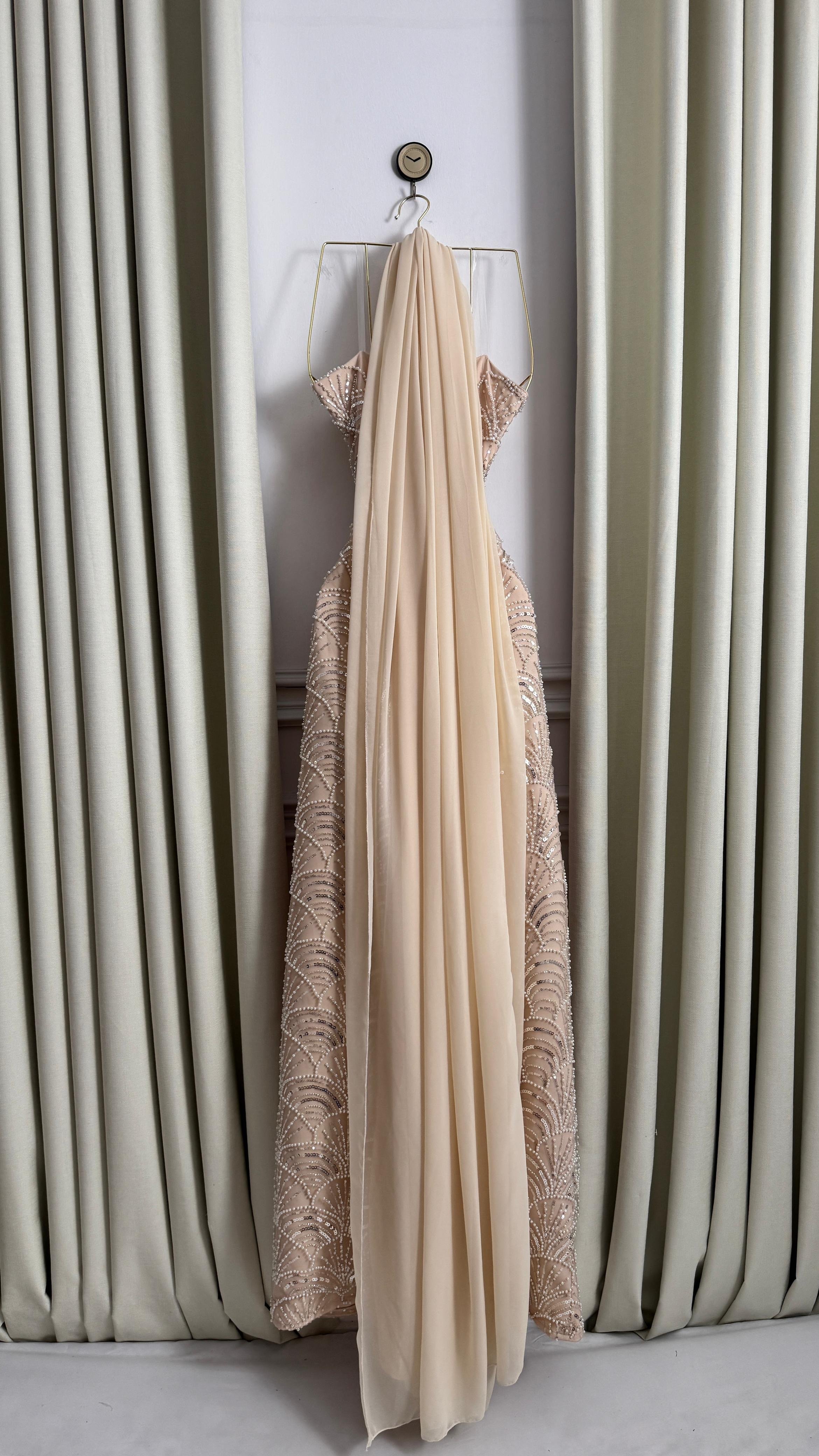 فستان سهرة فاخر باللون البيج المميز، يتميز بتطريز متقن بالترتر اللامع على كامل التصميم بنمط فني مستوحى من الزخارف الراقية. قصة الفستان مستقيمة ومحددة عند الخصر لتمنحك إطلالة أنثوية جذابة، بينما تضيف الطبقات الخفيفة لمسة انسيابية أنيقة. مناسب للسهرات، حفلات الخطوبة والمناسبات الخاصة التي تحتاج إلى إطلالة تلفت الأنظار