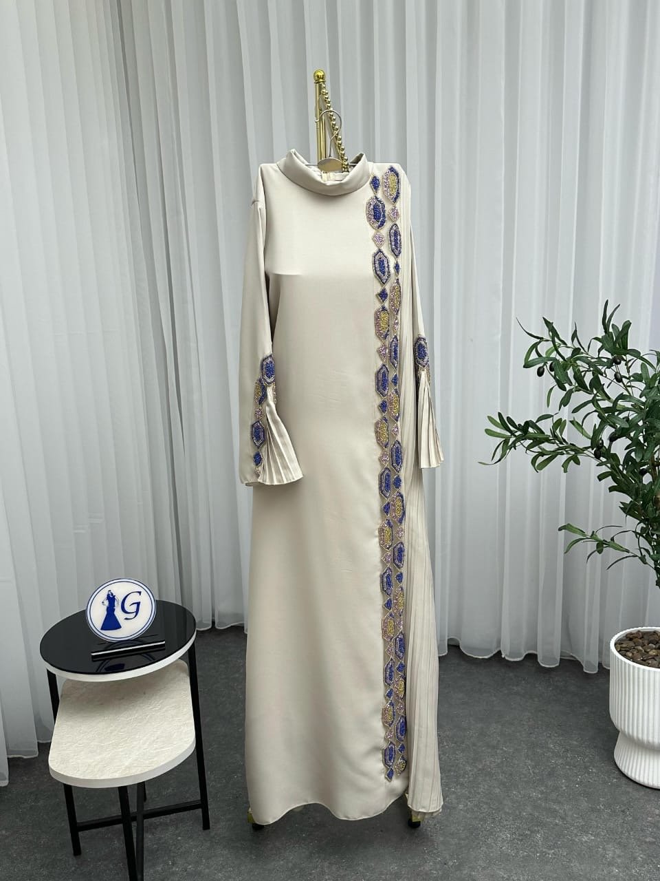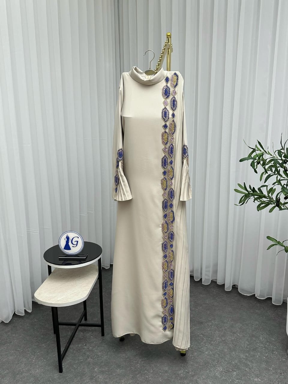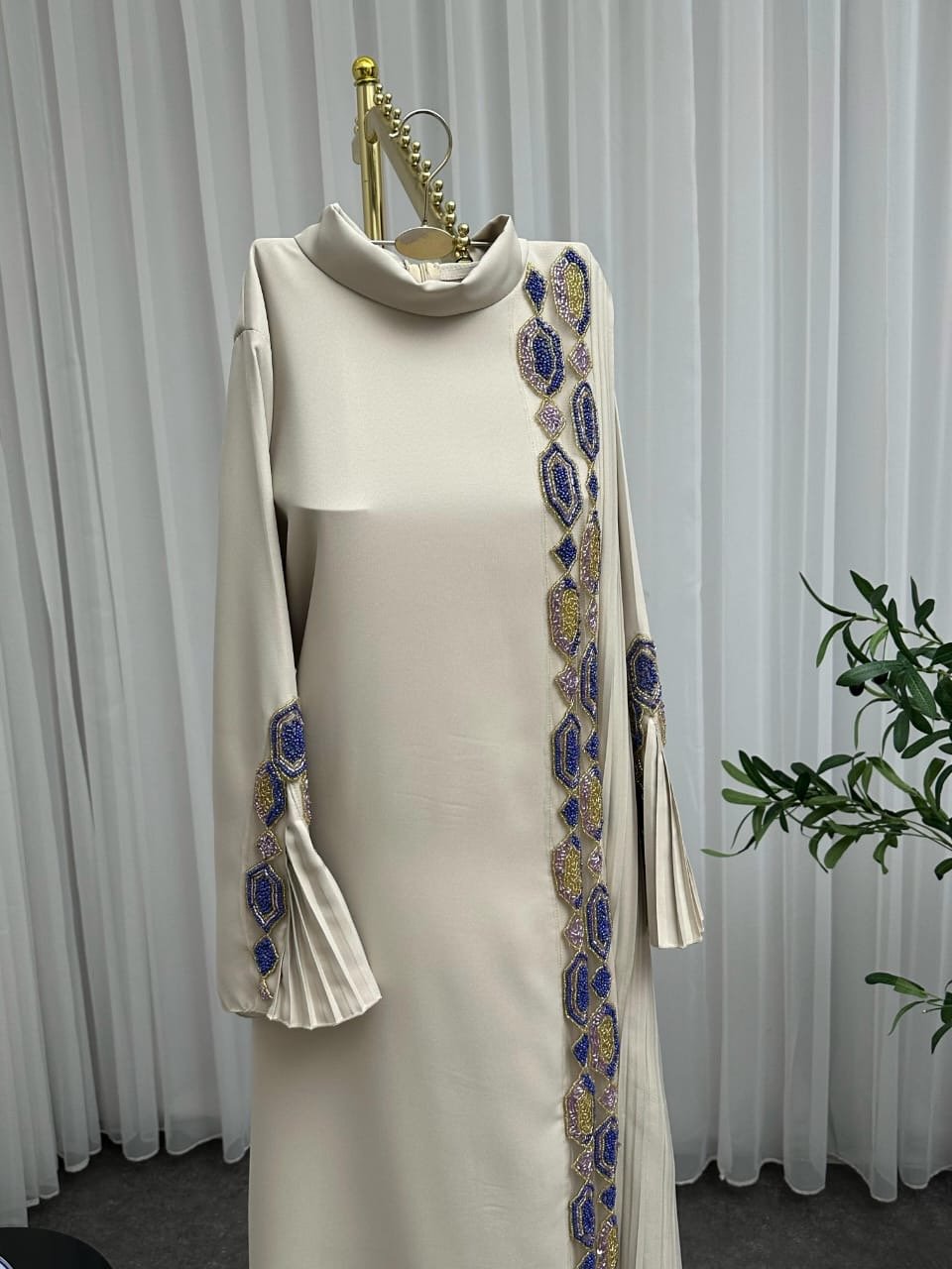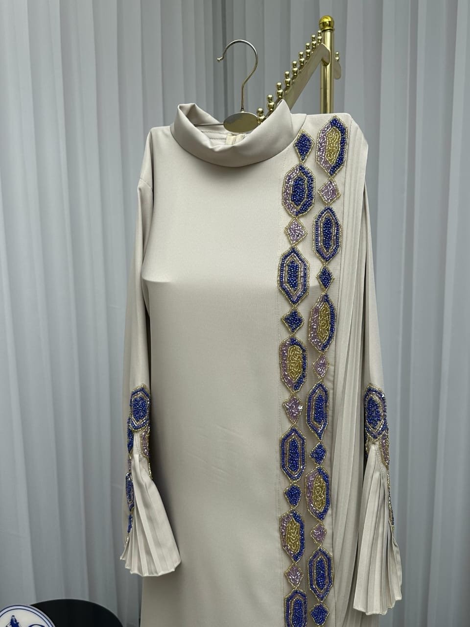 جلابية راقية باللون البيج الناعم، تتميز بتطريز يدوي فاخر باللونين الأزرق والذهبي على طول الصدر والجانب، مع لمسات متناسقة على الأكمام. القصة الكلاسيكية الواسعة تمنح الراحة، فيما يضفي التطريز لمسة من الفخامة والجاذبية. مثالية للمناسبات الخاصة واللقاءات الراقية، حيث تجمع بين الأصالة والأناقة العصرية.