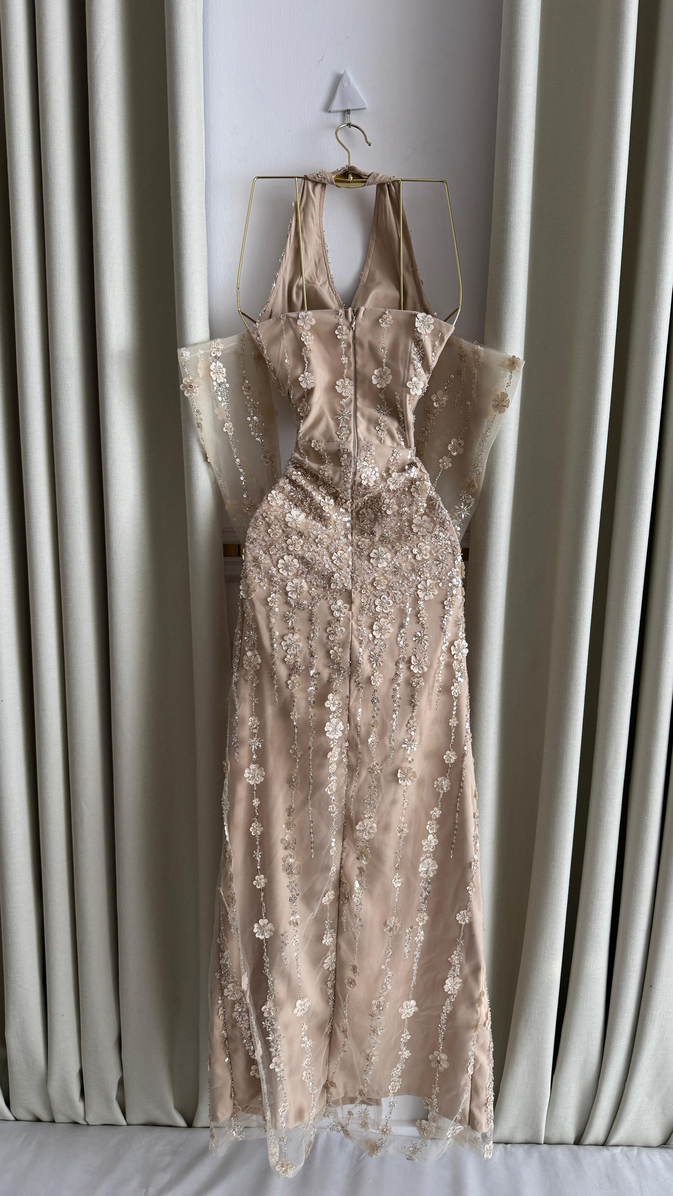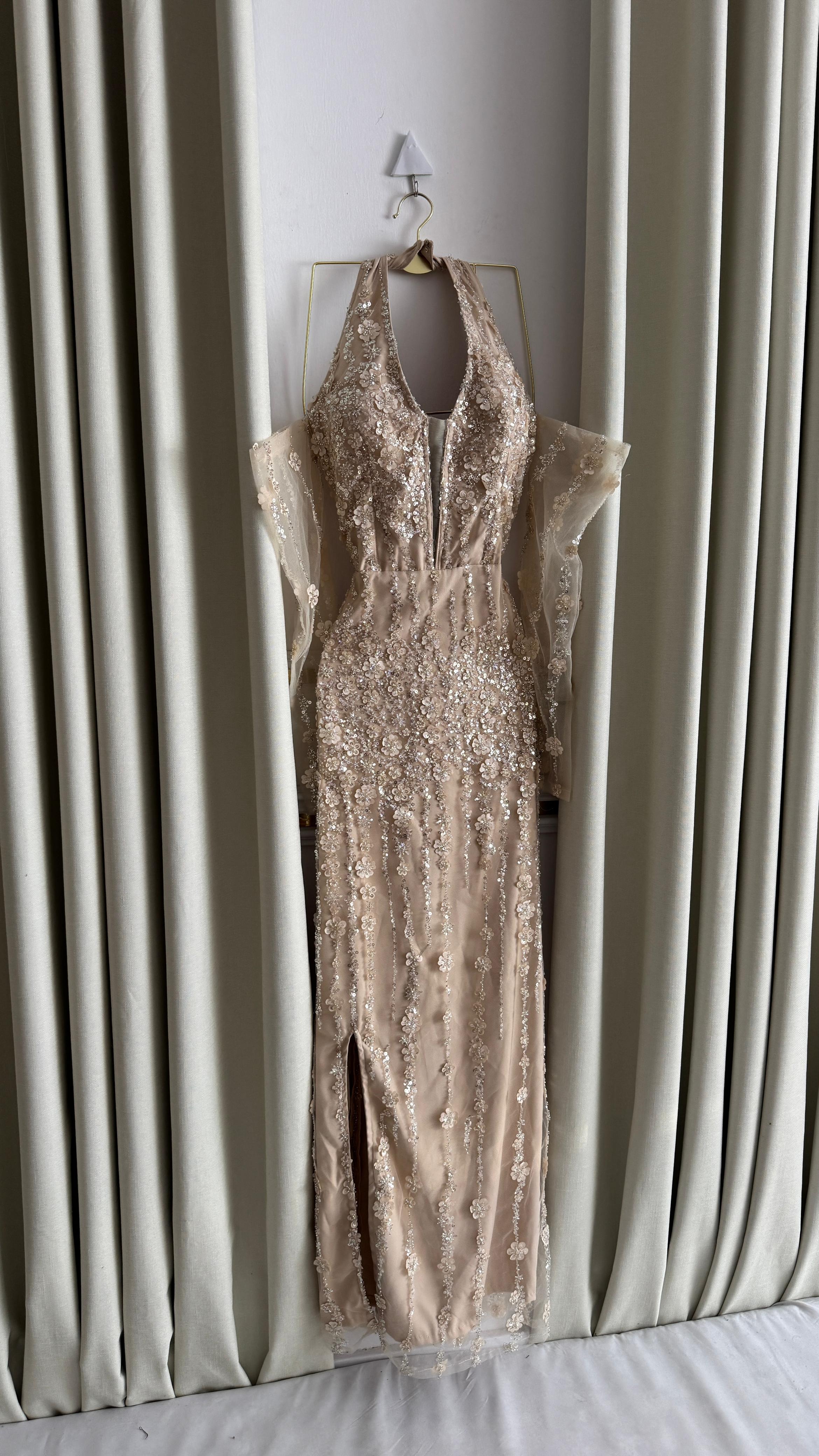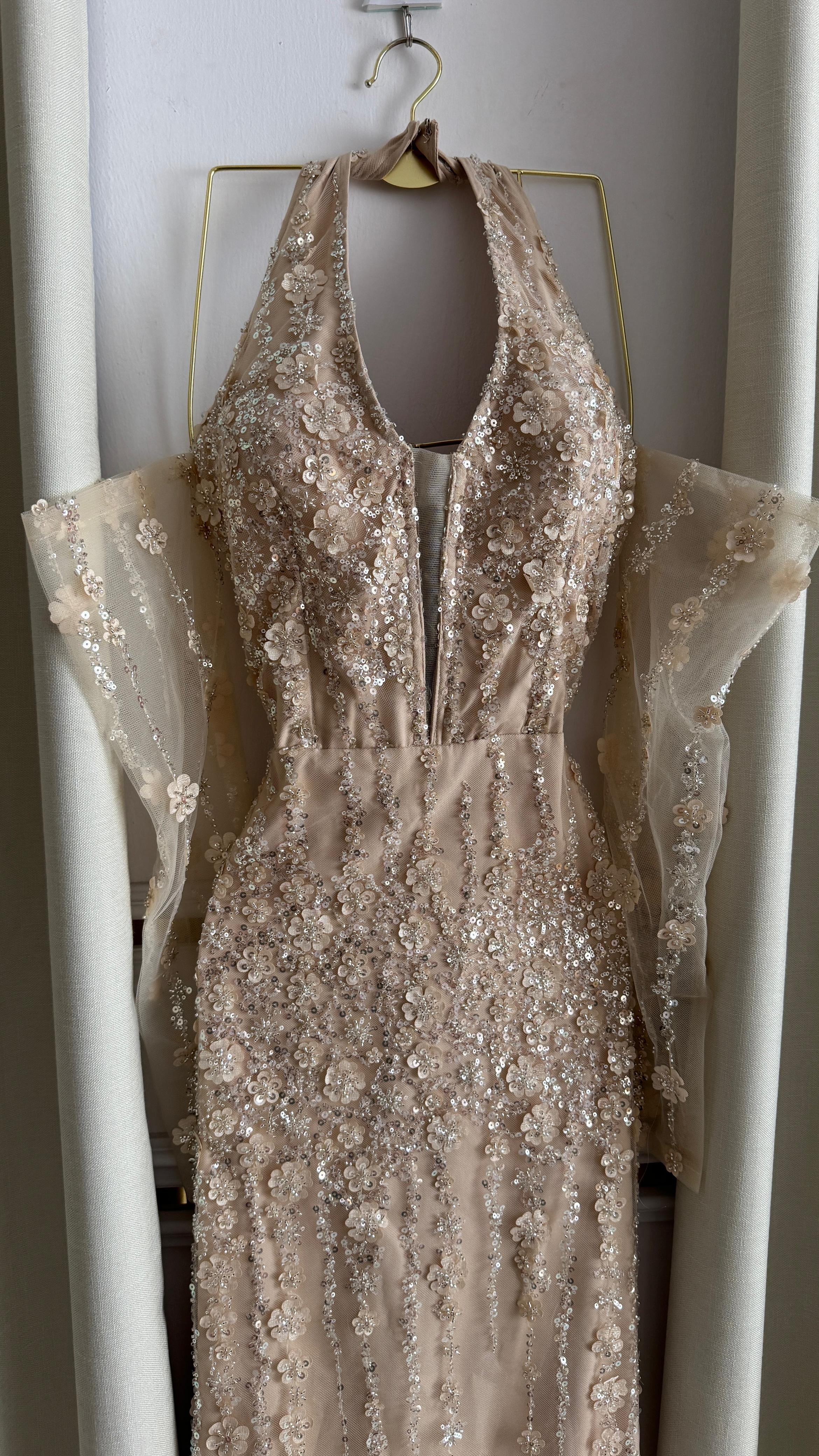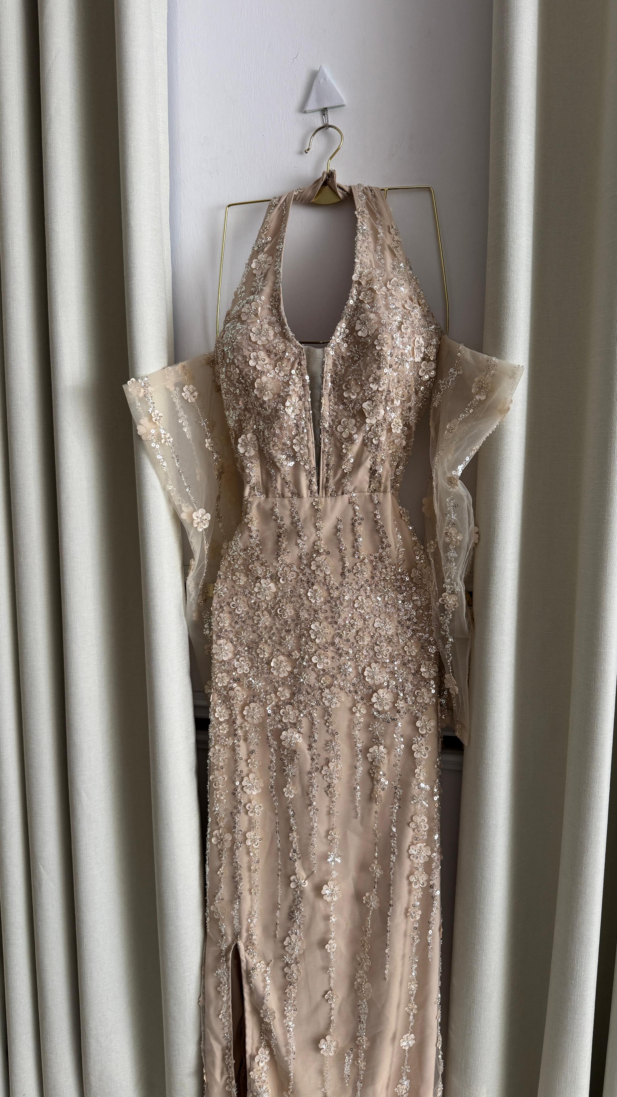 هذا الفستان الأزرق الملكي المزين بالكريستالات ي radiates فخامة وأناقة، مثالي للحفلات والمناسبات الراقية. تصميمه الفريد مع التطريز البراق يبرز جمال القوام ويجعل الإطلالة لافتة للنظر.