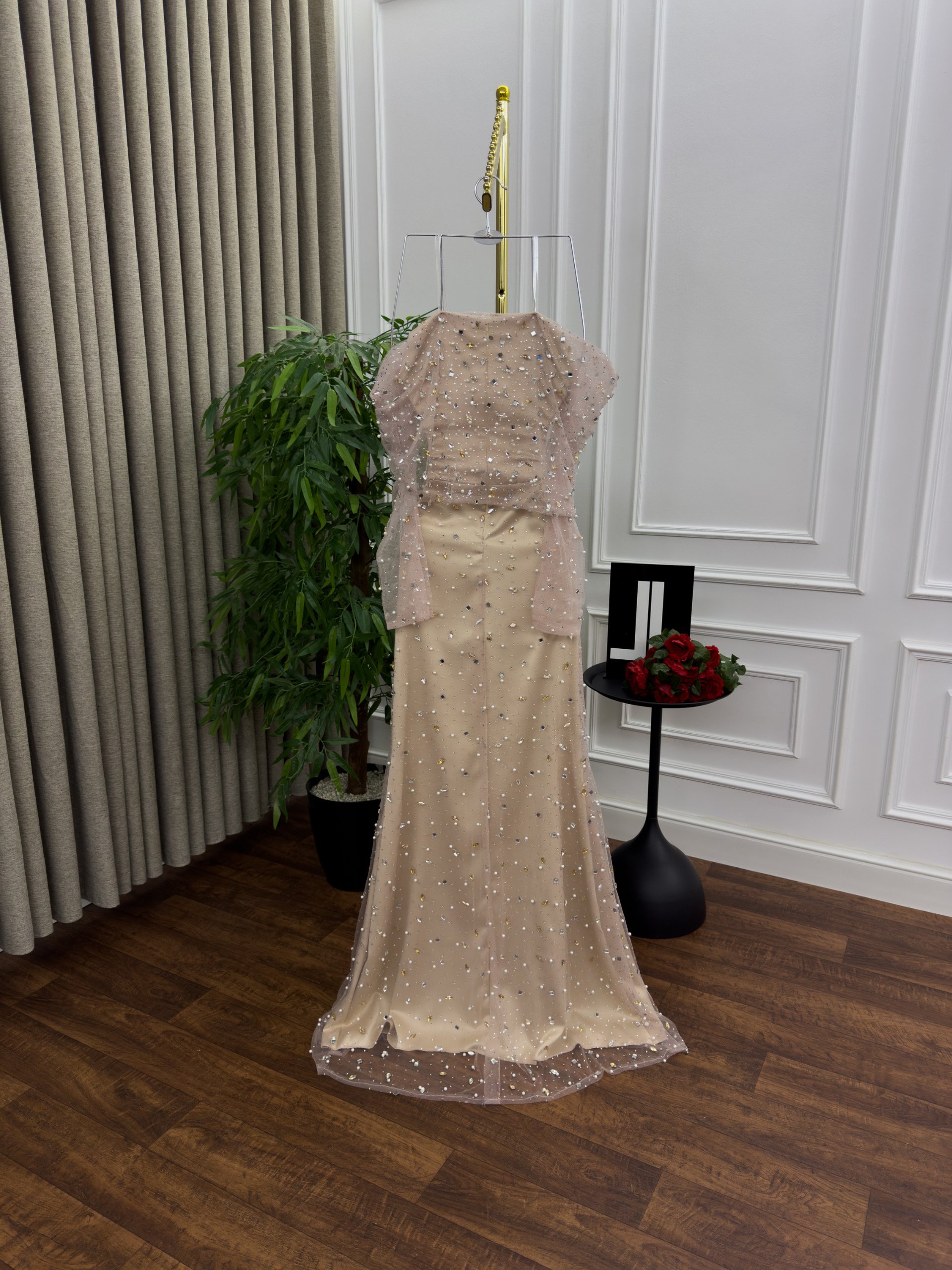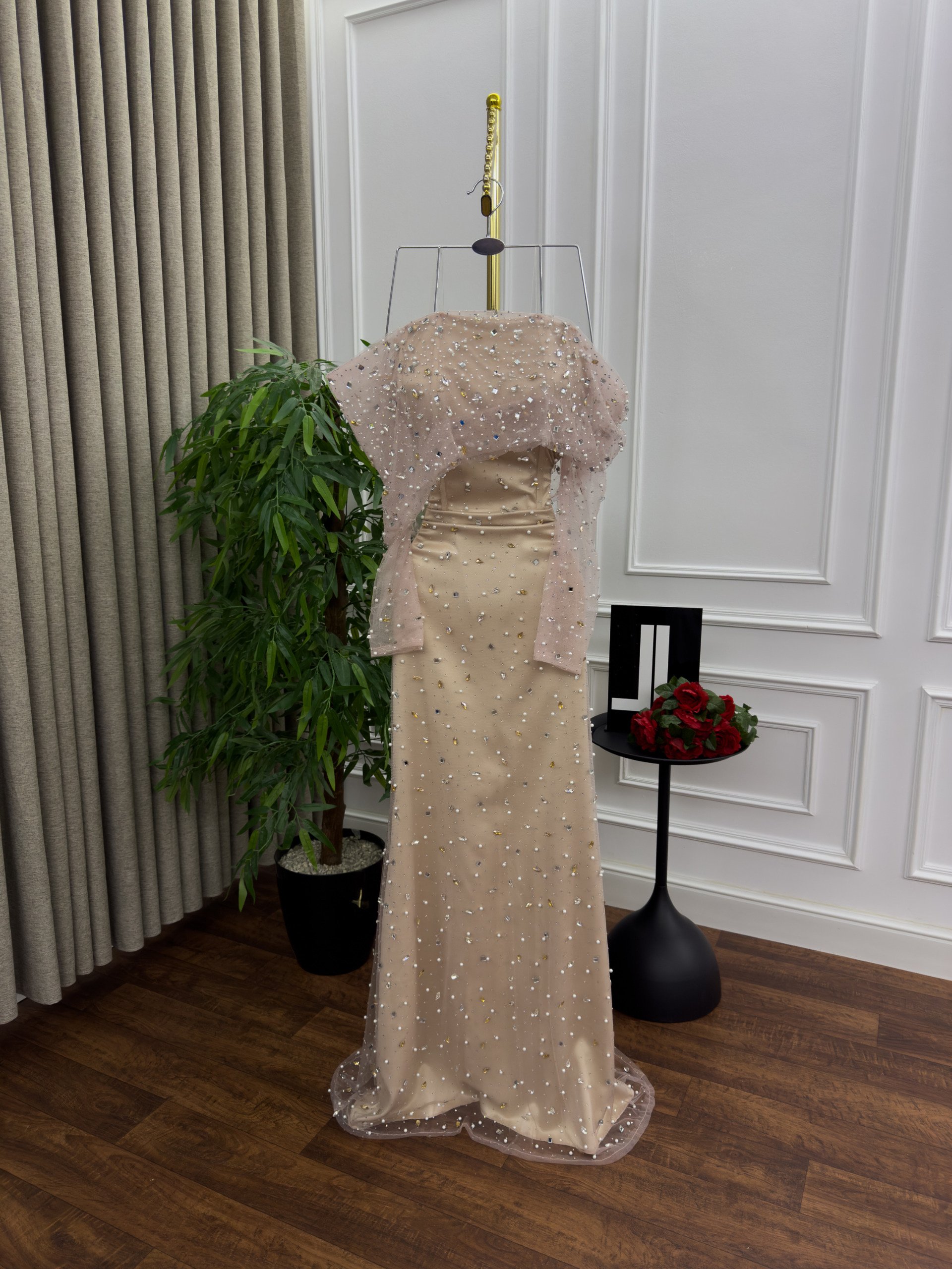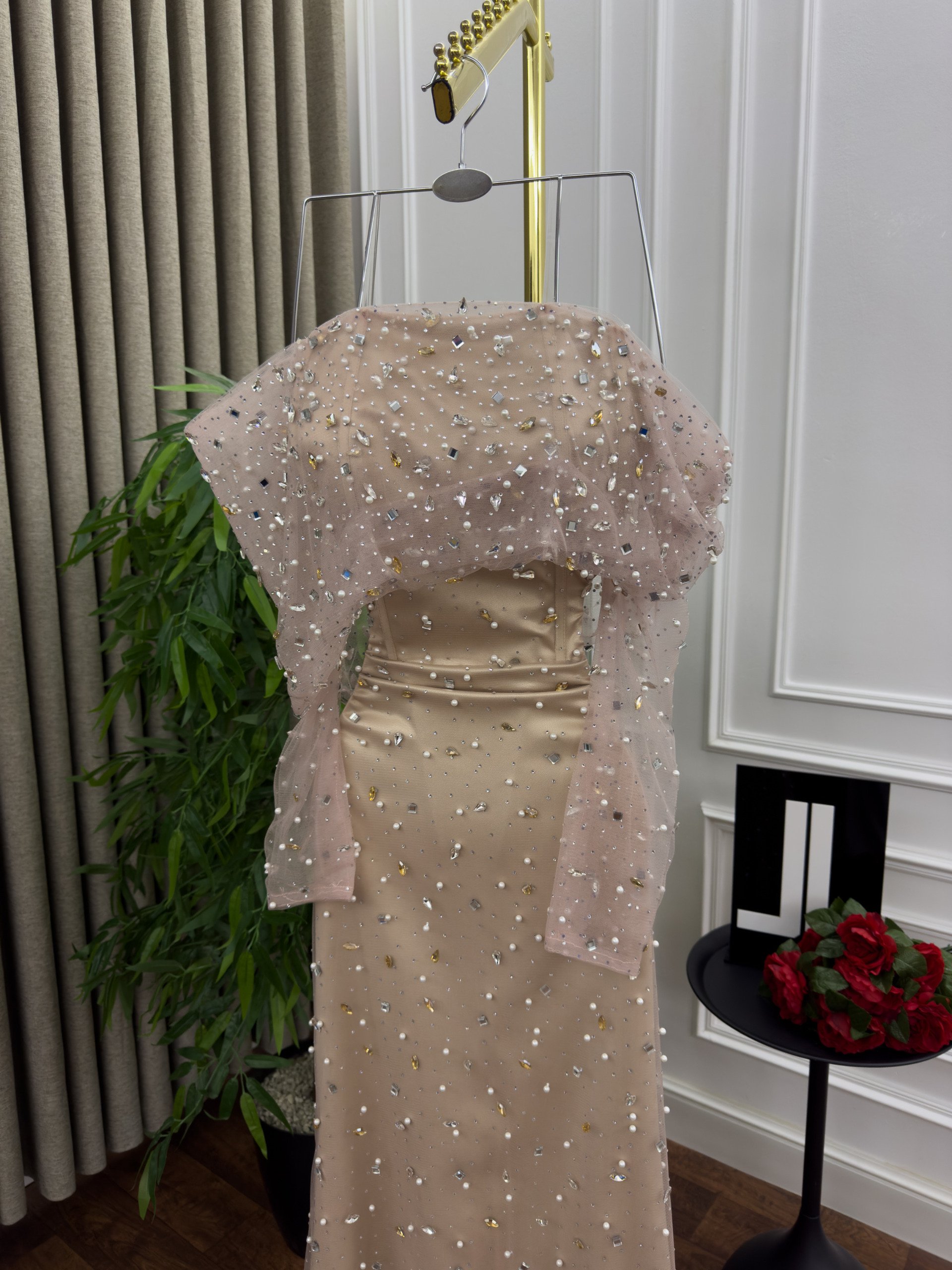 ارتدي الأناقة مع هذا الفستان البيج الراقي بتصميم أوف شولدر يفيض أنوثة. مرصّع بتطريز براق يلمع مع كل حركة ليمنحك حضوراً ملكياً يخطف الأنظار. الأكمام الشفافة المطرّزة تضيف لمسة رقيقة، بينما القصة المنسدلة تبرز الخصر وتزيد من جاذبيتك. خيار مثالي للأعراس، حفلات الخطوبة، والسهرات الفاخرة.