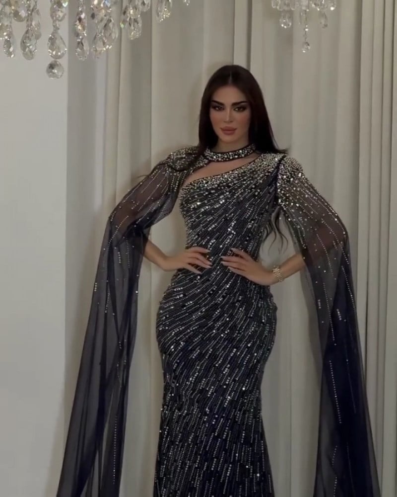 ما يميز هذا الفستان حقًا هو الكاب الطويل الشفاف المصنوع من التول الناعم، والمثبت على الأكتاف بأسلوب ملكي يضفي هالة من الفخامة والرقي في كل حركة. كما يزين الفستان فتحة تصميم أنيقة عند منطقة الصدر، تضيف لمسة عصرية راقية دون أن تخلّ بالوقار.