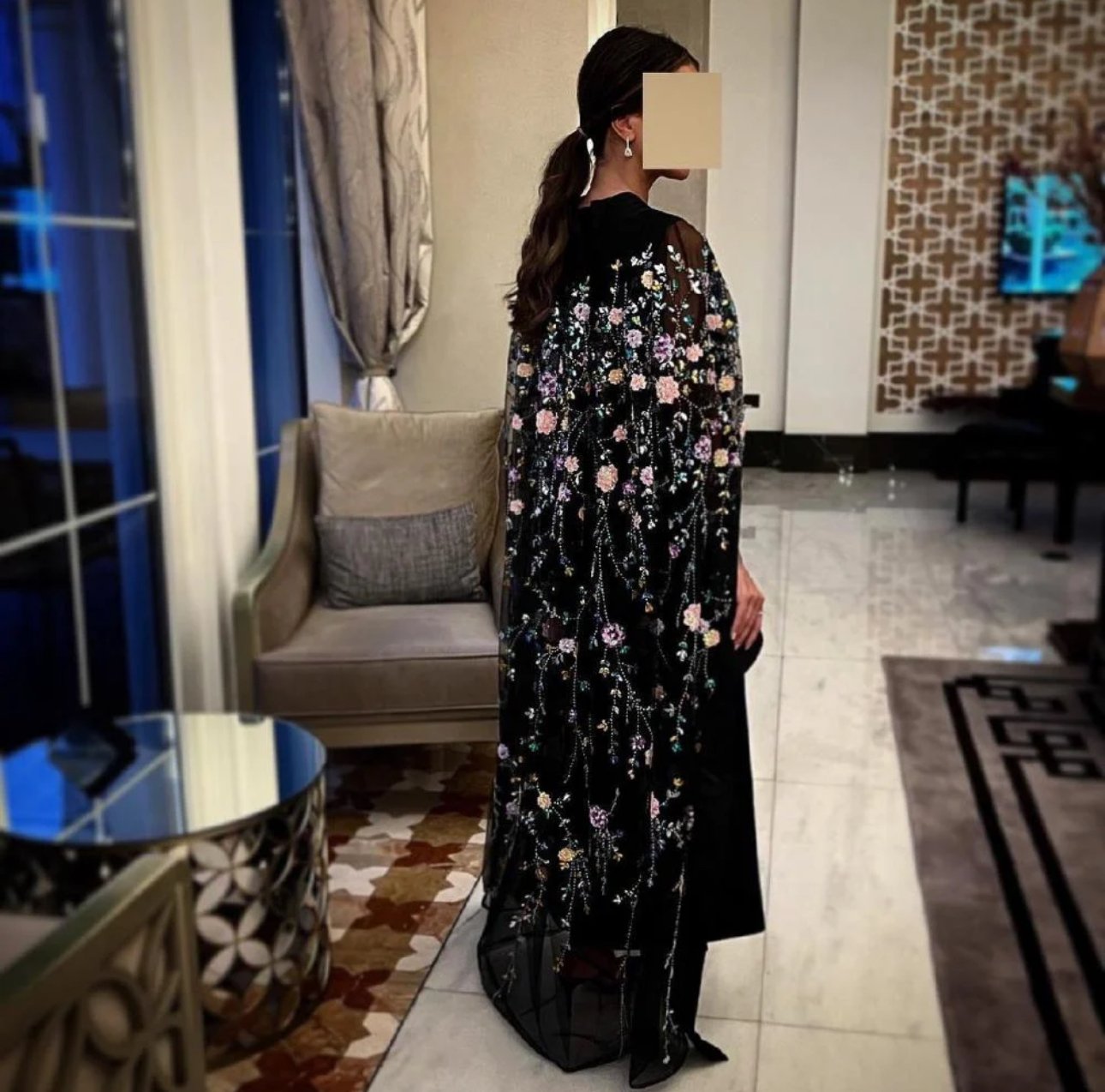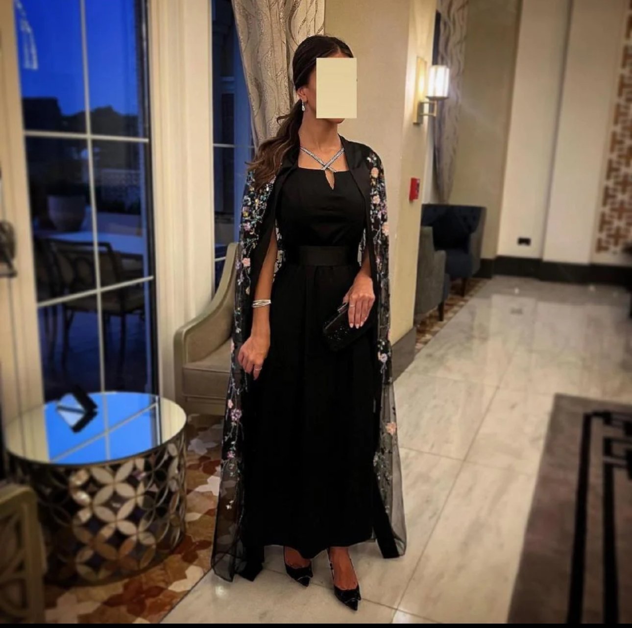 الكاب المطرز يضفي لمسة ملكية، فيما تمنحك الإكسسوارات الفضية اللامعة والكعب الأسود الرفيع توازناً أنيقاً بين الفخامة والأنوثة.
