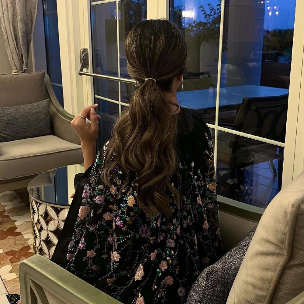 - الإطلالة: تسريحة شعر مرفوعة أو مموّجة مع مكياج ناعم يبرز العيون