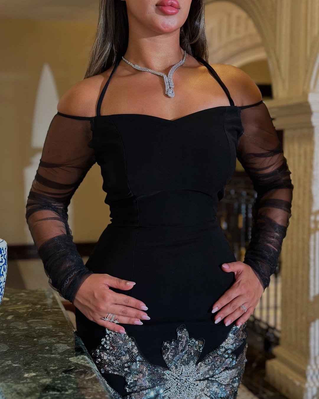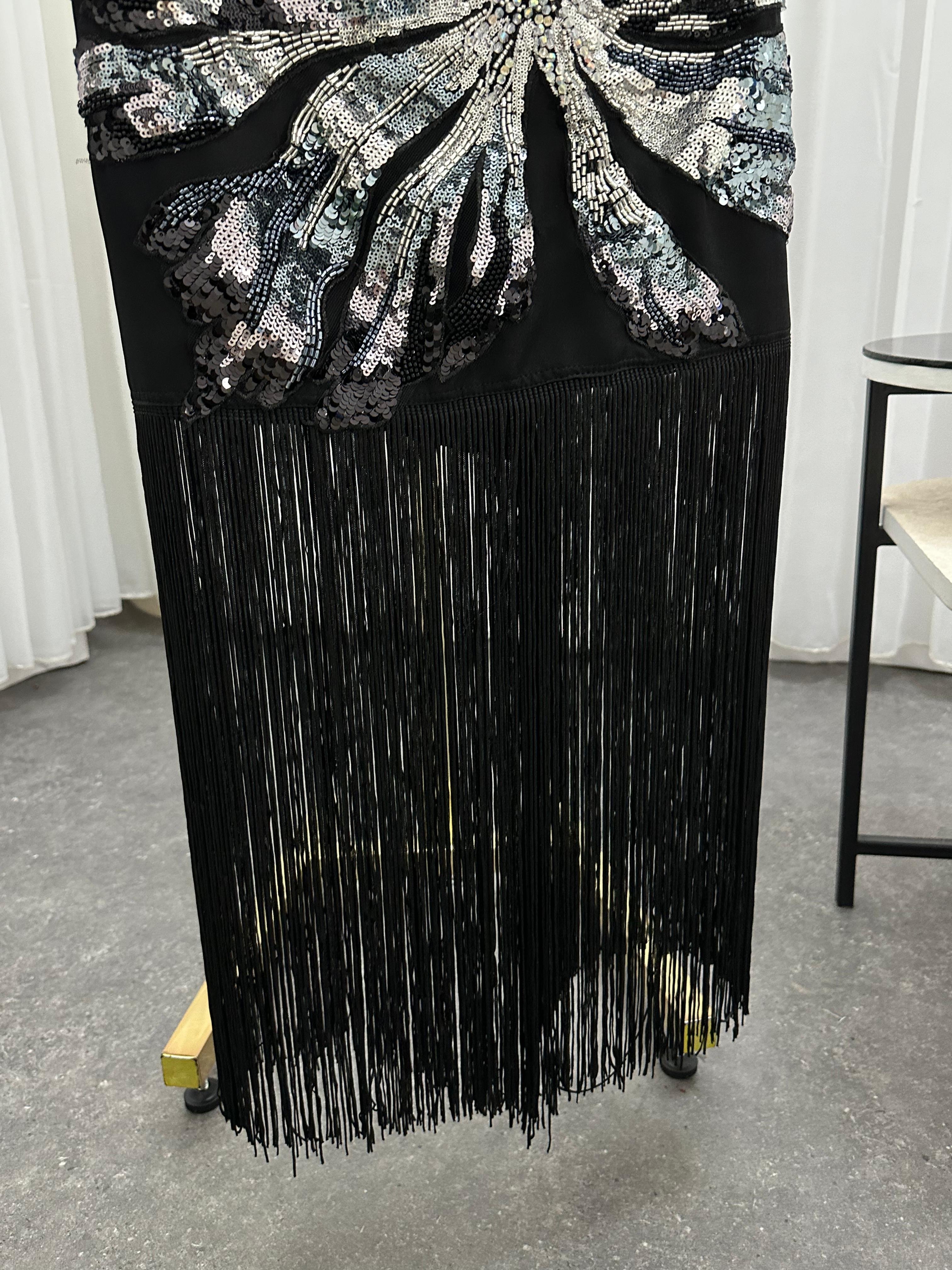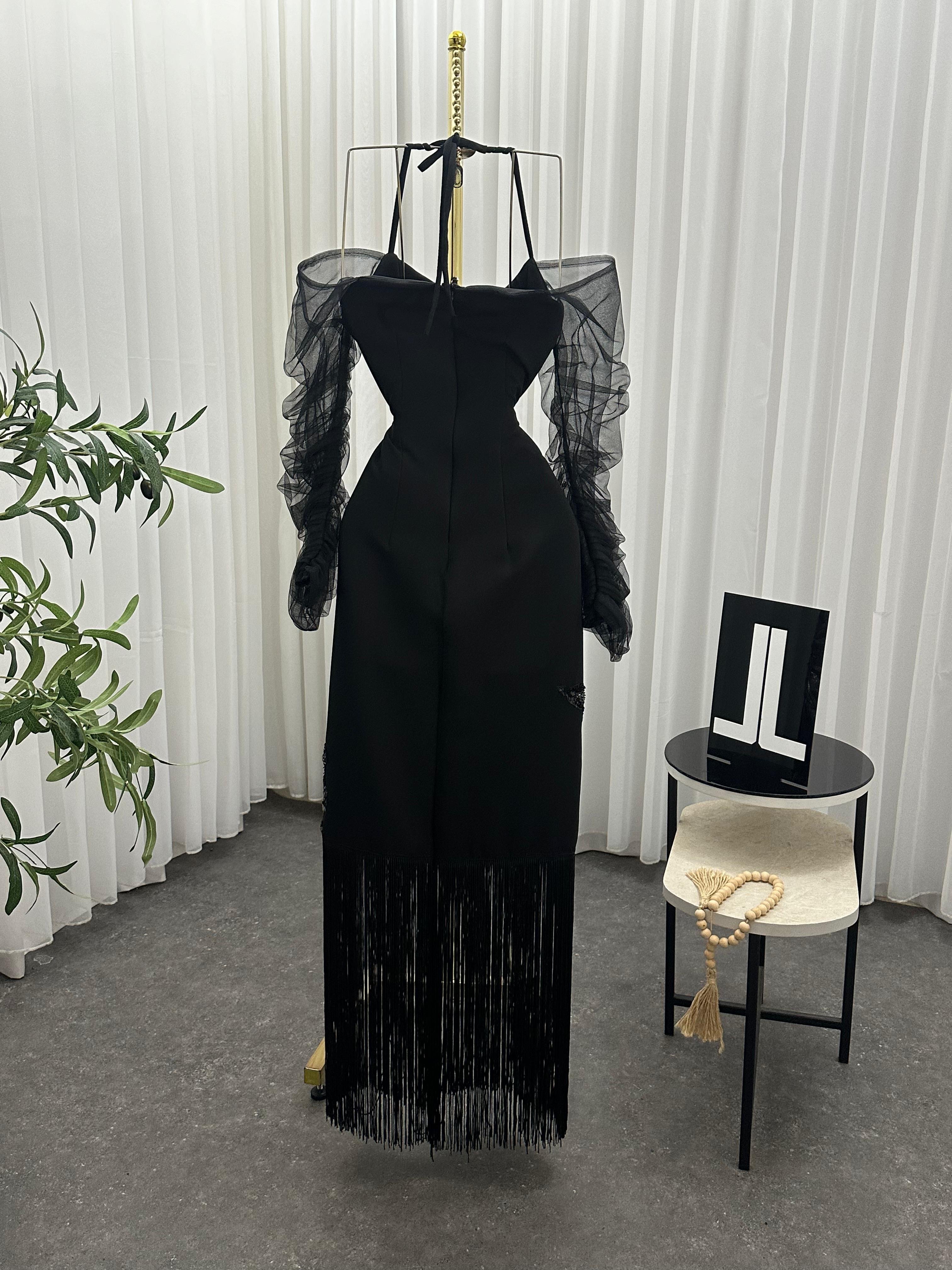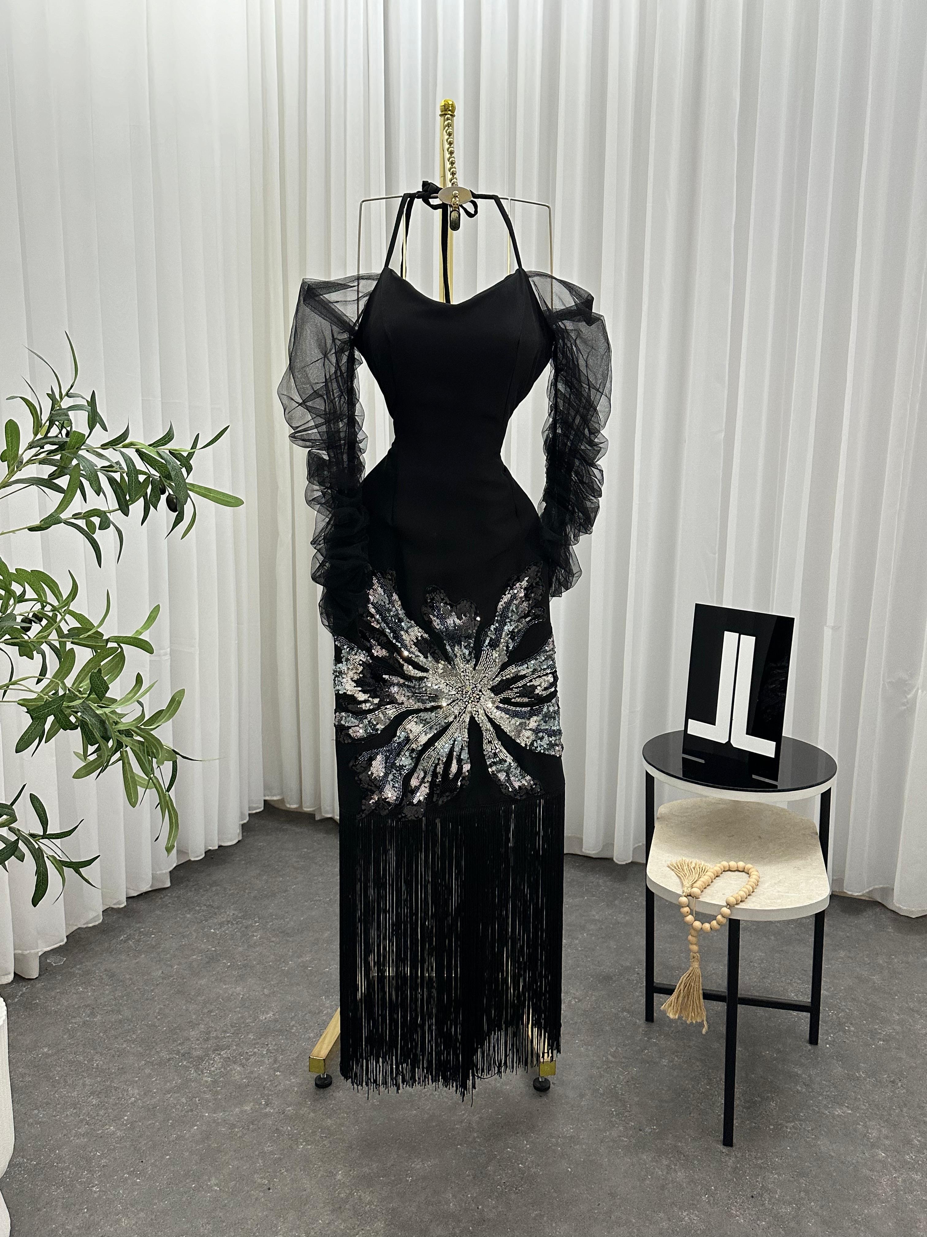 فستان سهرة فاخر باللون الأسود، يجمع بين الأناقة الكلاسيكية واللمسة العصرية. يتميز بقماش ضيق يبرز جمال القوام، وأكمام شفافة من التول تضيف جاذبية ناعمة. التصميم مزين بتطريز فضي لامع عند منطقة الخصر على شكل زخارف أنيقة تبرز جمال الفستان وتضفي لمسة براقة. الجزء السفلي يتزين بشراشيب طويلة تضفي حركة مبهرة مع كل خطوة. خيار مثالي لحفلات العشاء، المناسبات الرسمية، وحفلات الخطوبة.