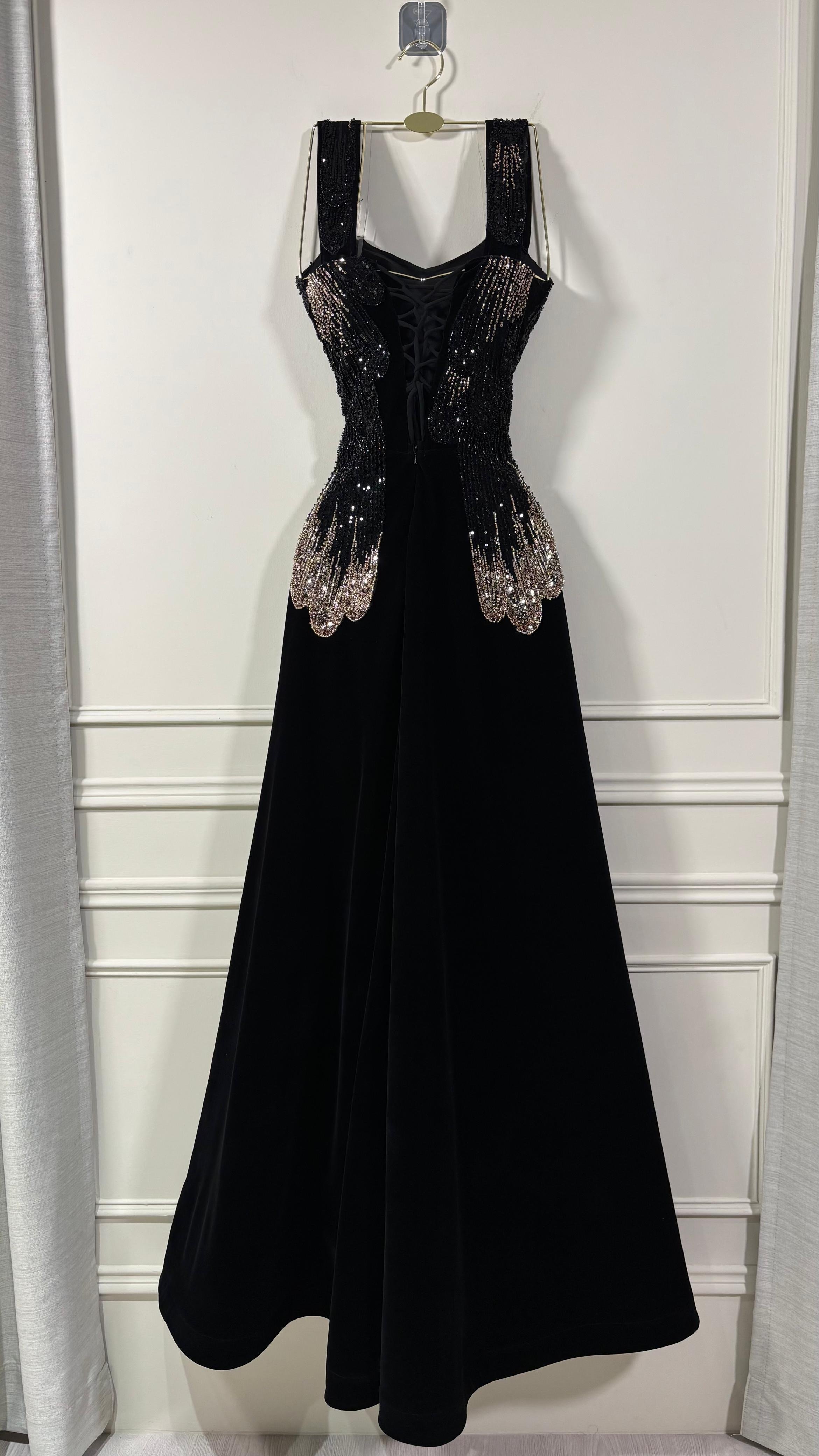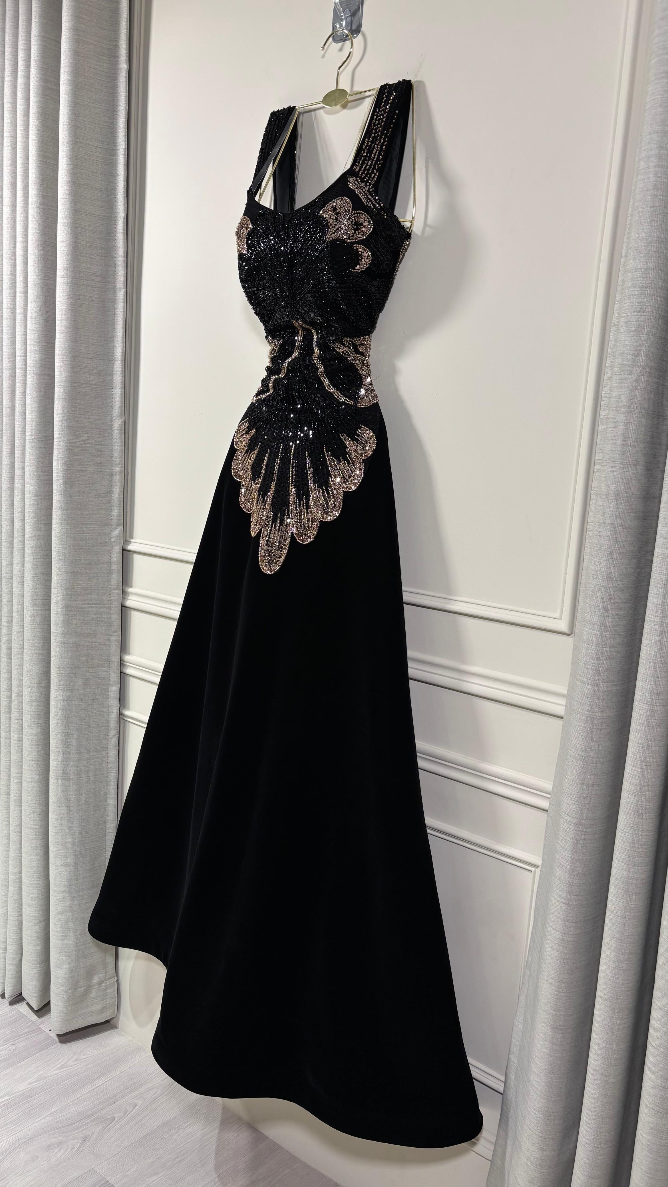 فستان سهرة أسود يجمع بين الهيبة والنعومة في توازن نادر.