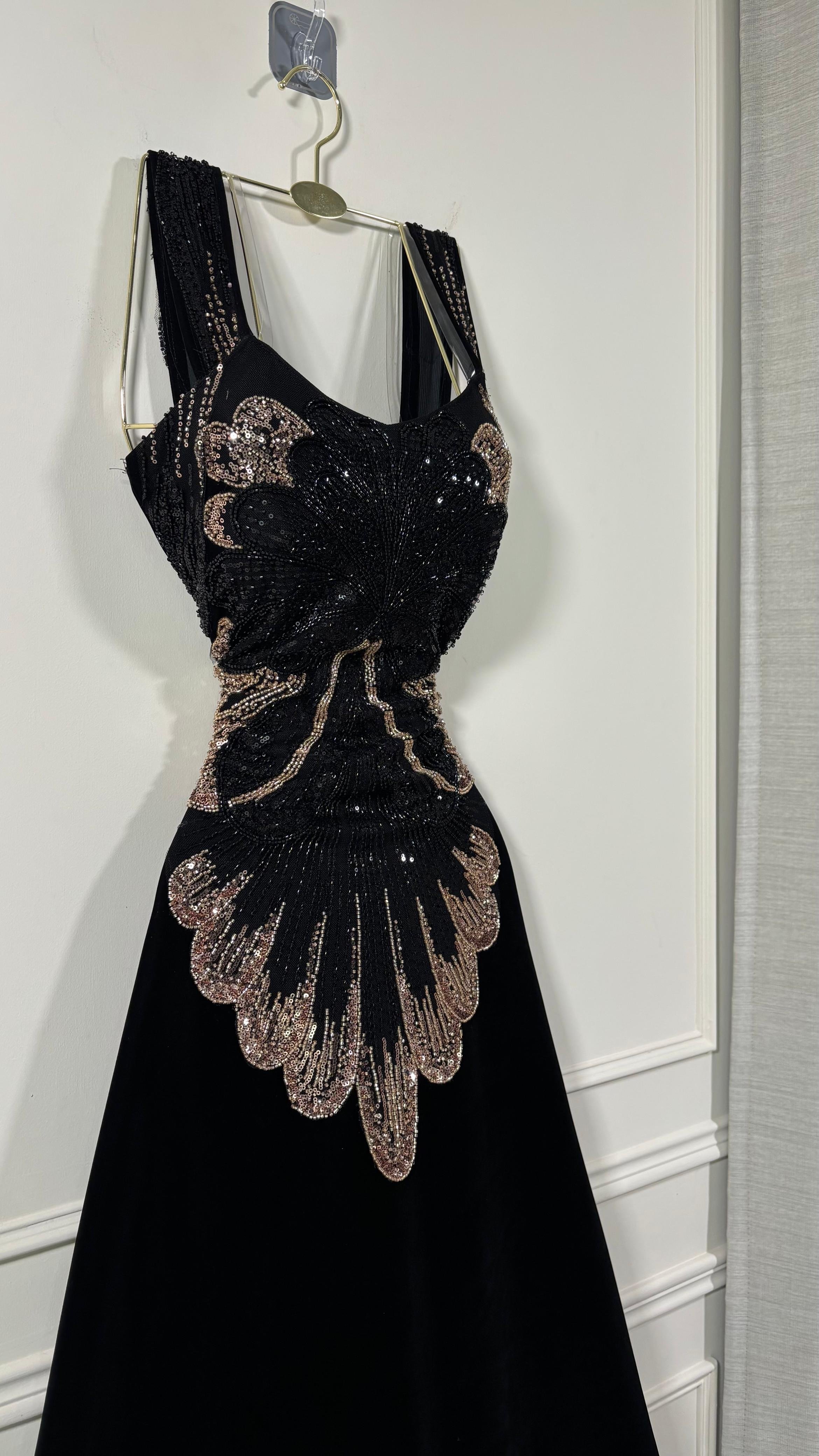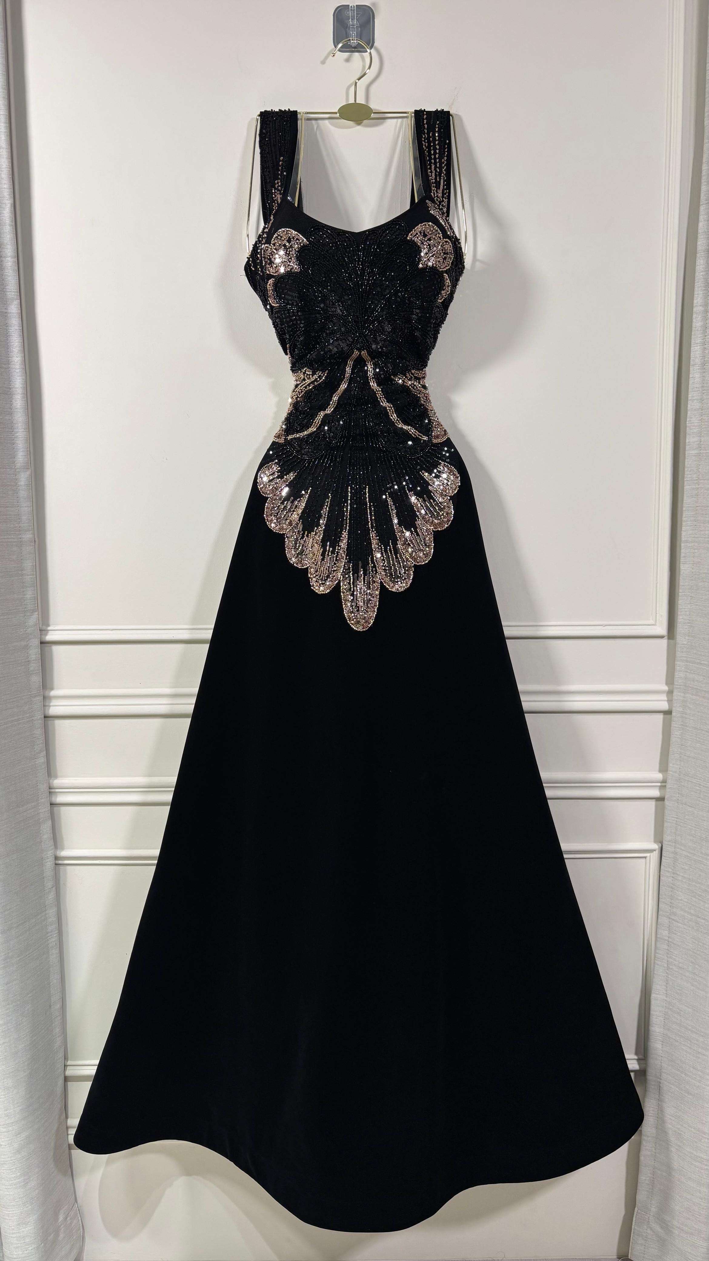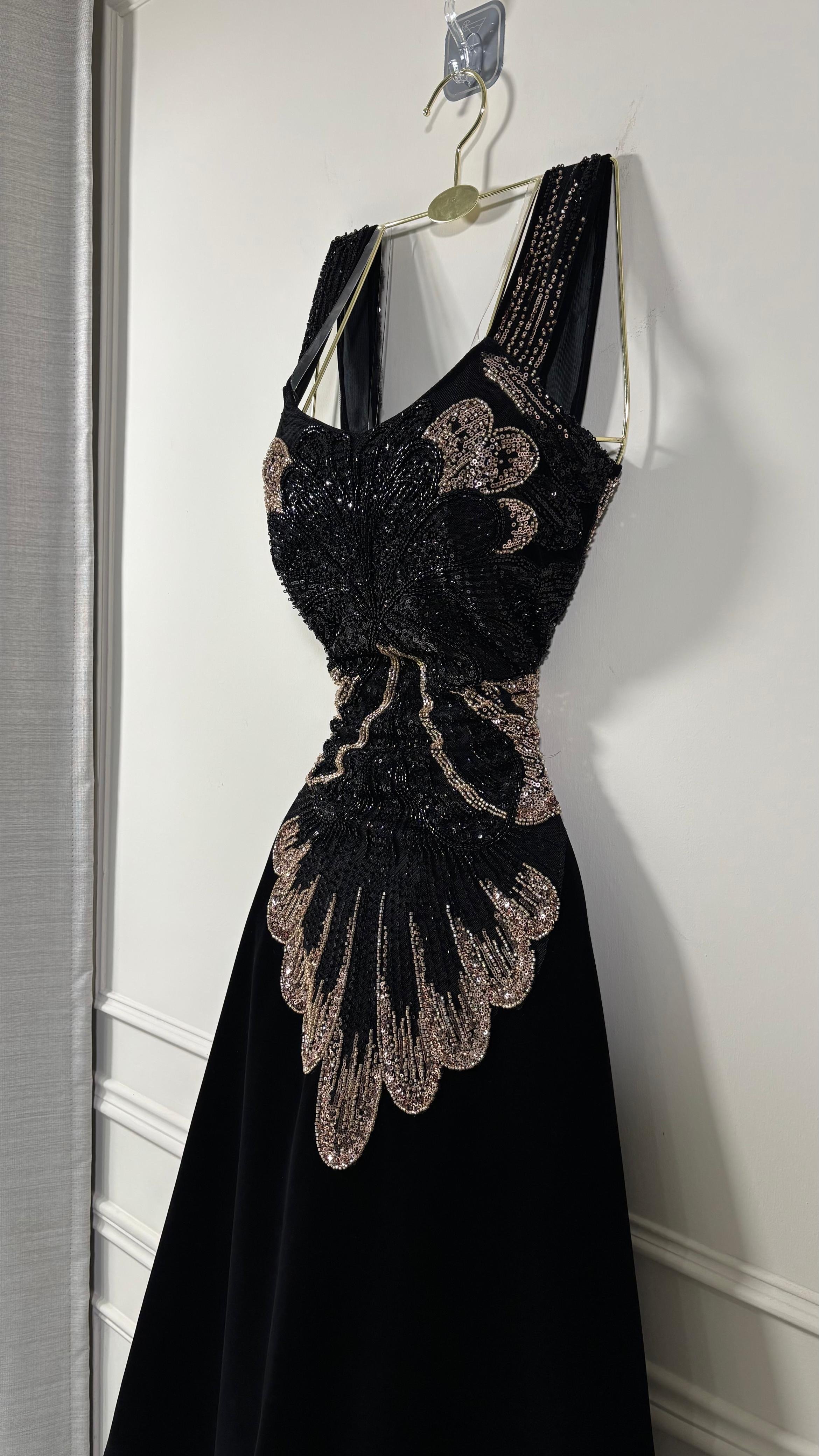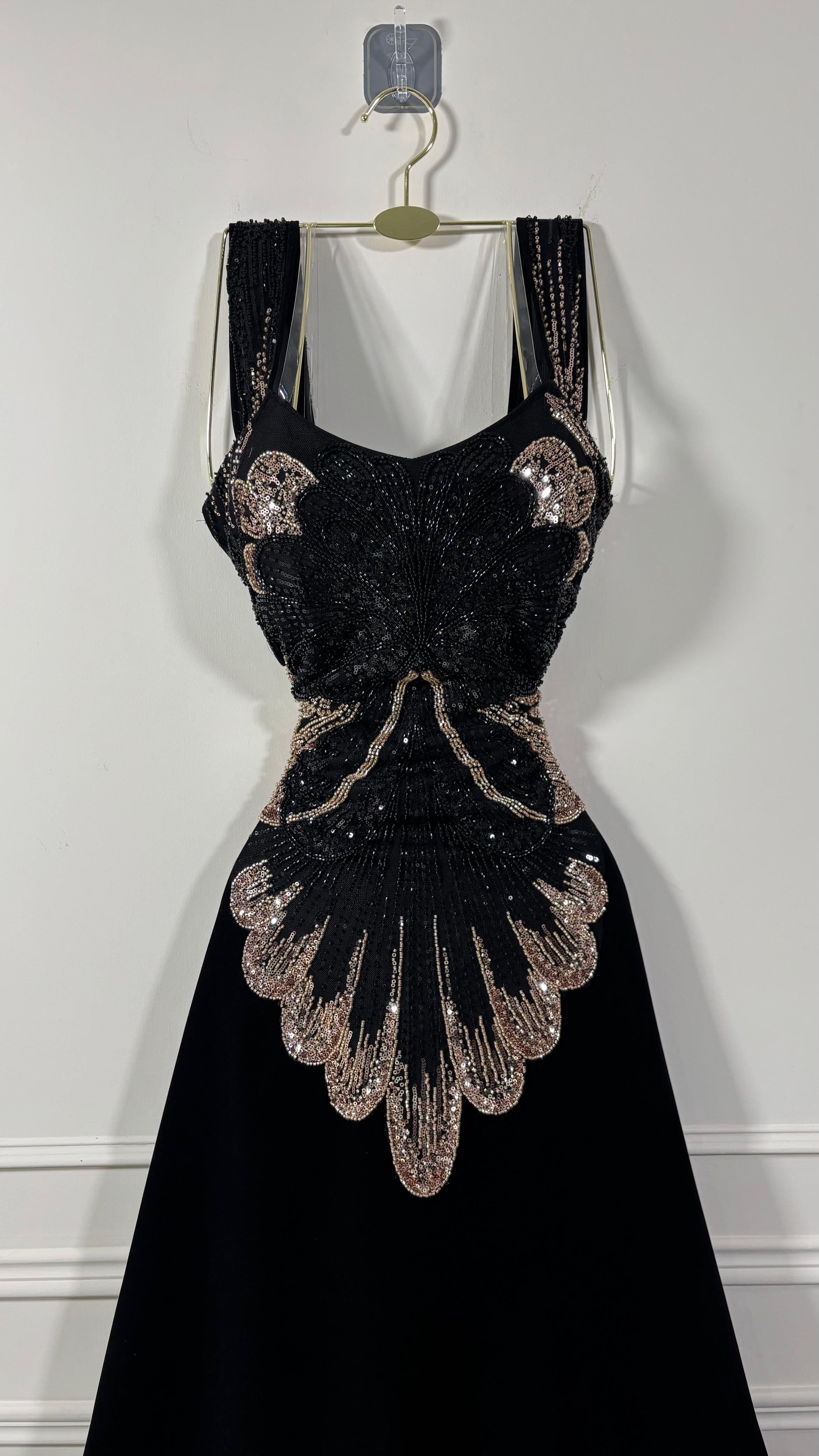الجزء العلوي يتزيّن بتطريز ذهبي لامع بتصميم يشبه أجنحة فاخرة تلتف حول الخصر وتنحته بشكل واضح، بينما يسقط القماش الأسود الثقيل بانسيابية راقية تعطي الفستان حضور ملكي من أول خطوة.