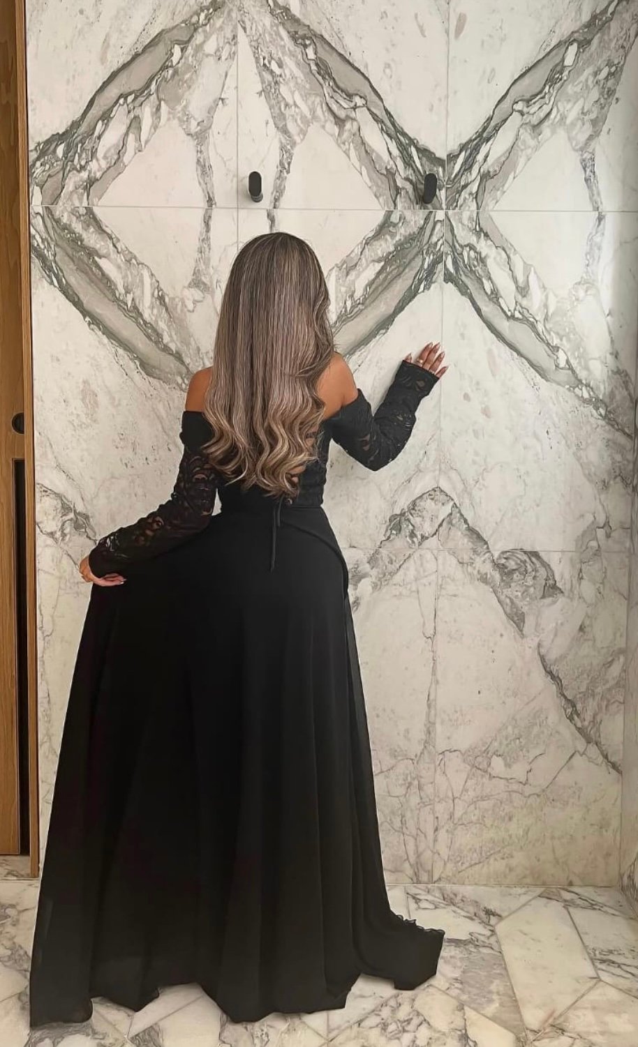 فستان سهرة فاخر باللون الأسود الكلاسيكي، يتميز بتوب دانتيل بكم طويل مع قصة أوف شولدر أنثوية تضفي لمسة راقية. التصميم المكون من قطعتين (توب وتنورة) يضيف لمسة عصرية ملفتة، بينما التنورة الطويلة الانسيابية تعكس حضورًا ملكيًا أنيقًا. خيار مثالي للسهرات الفاخرة والمناسبات الخاصة.