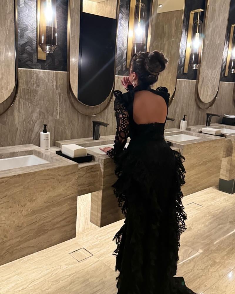فستان سهرة أسود أنيق بتفاصيل دانتيل فاخرة تمتد من الأكتاف حتى الأكمام الشفافة، مع كشكاش متدرّج يمنح حركة انسيابية تزيد من جمال القوام.