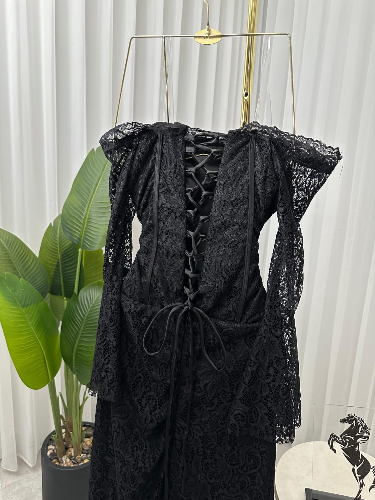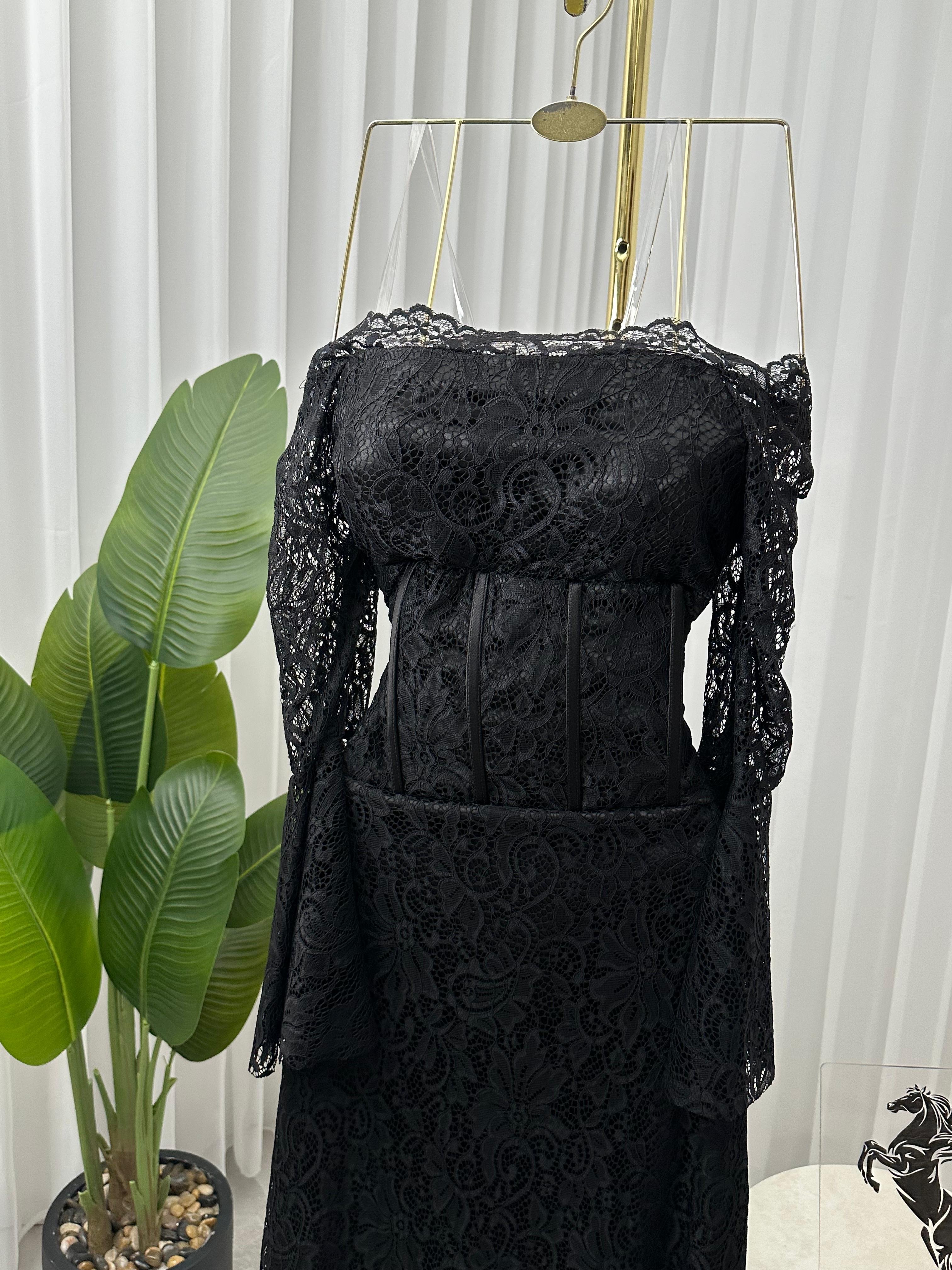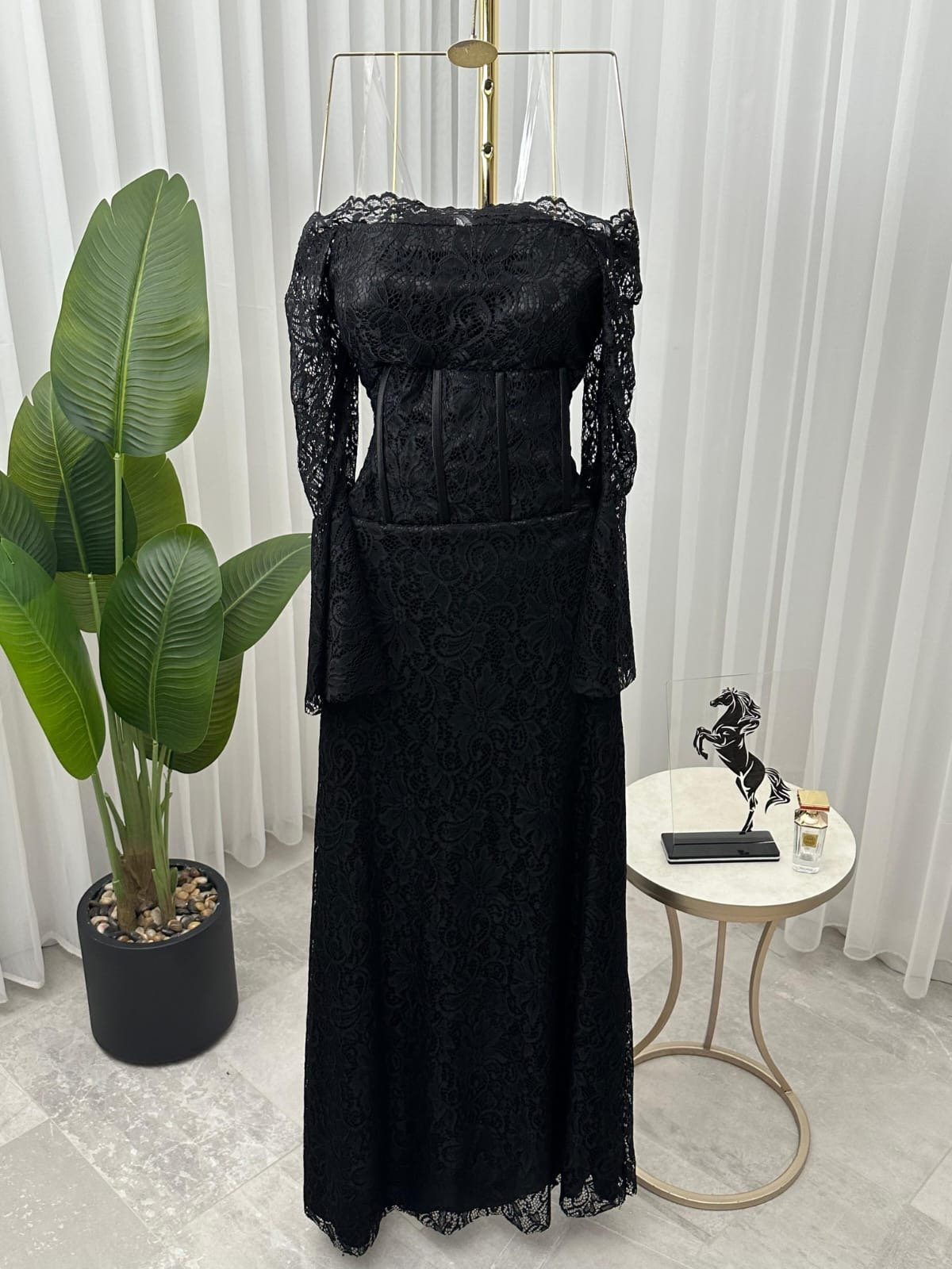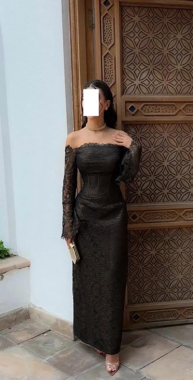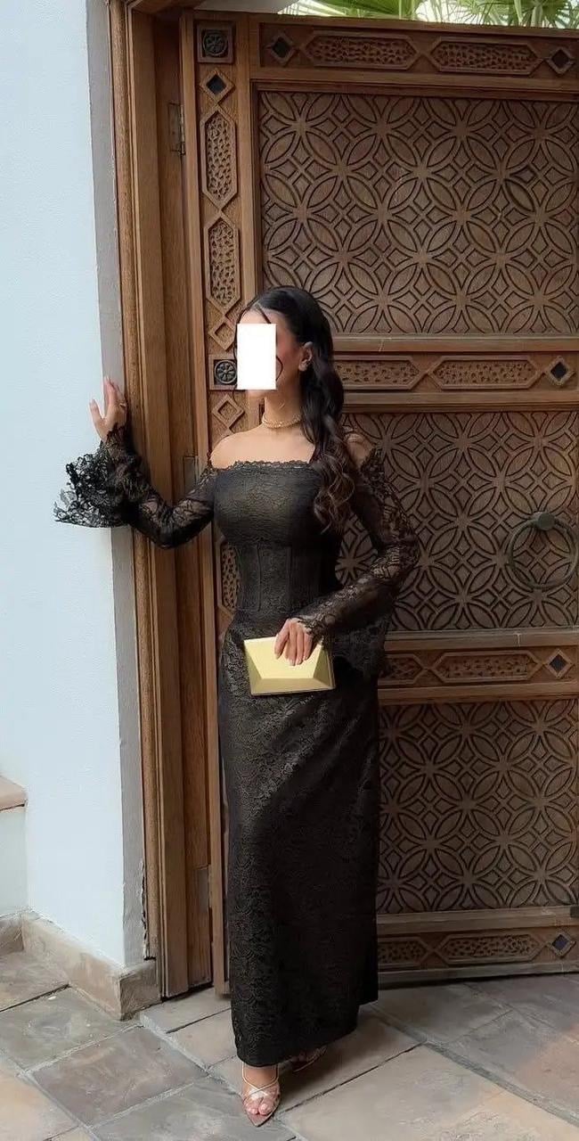 فستان سهرة فاخر باللون الأسود مصمم من قماش دانتيل أنيق مع قصة أوف شولدر تبرز أنوثتك برقي. يتميز بخصر ضيق يحدد القوام بأناقة مع أكمام طويلة شفافة تضيف لمسة من الجاذبية الكلاسيكية. الطول الانسيابي للفستان يمنح إطلالة راقية مثالية للسهرات والمناسبات الخاصة.