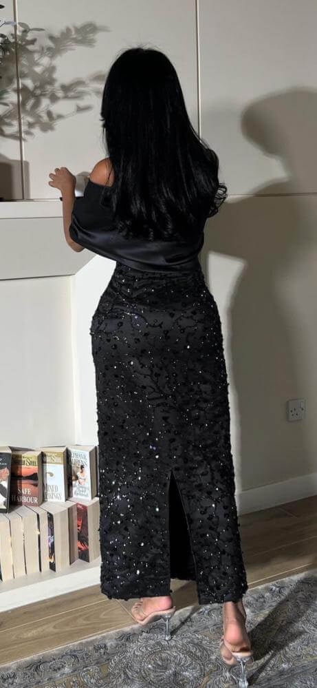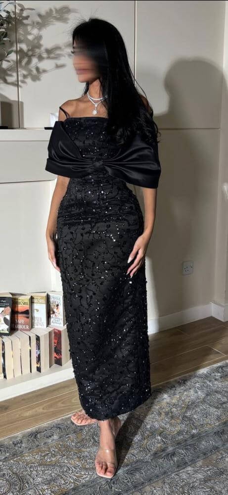 استمتعي بإطلالة ساحرة مع هذا الفستان الأسود الفخم، المصمم بقصة أوف شولدر عصرية وتطريز فاخر من الترتر اللامع يغطي القماش بالكامل ليمنح بريقاً جذاباً تحت الأضواء. يتميز بطول متوسط وقصة ضيقة تبرز جمال القوام، مع لمسة ساتان فاخرة على الأكتاف. مثالي للسهرات الفاخرة، حفلات العشاء، والمناسبات الخاصة. نسقيه مع عقد لامع، حقيبة كلاتش معدنية، وحذاء بكعب عالي لإطلالة متكاملة.