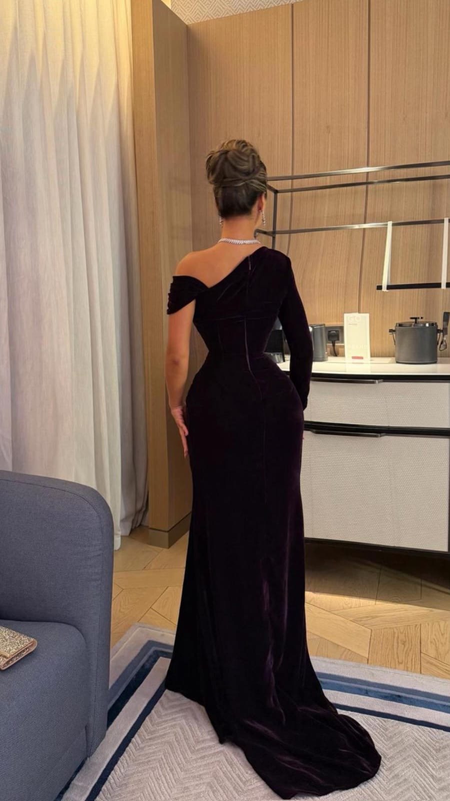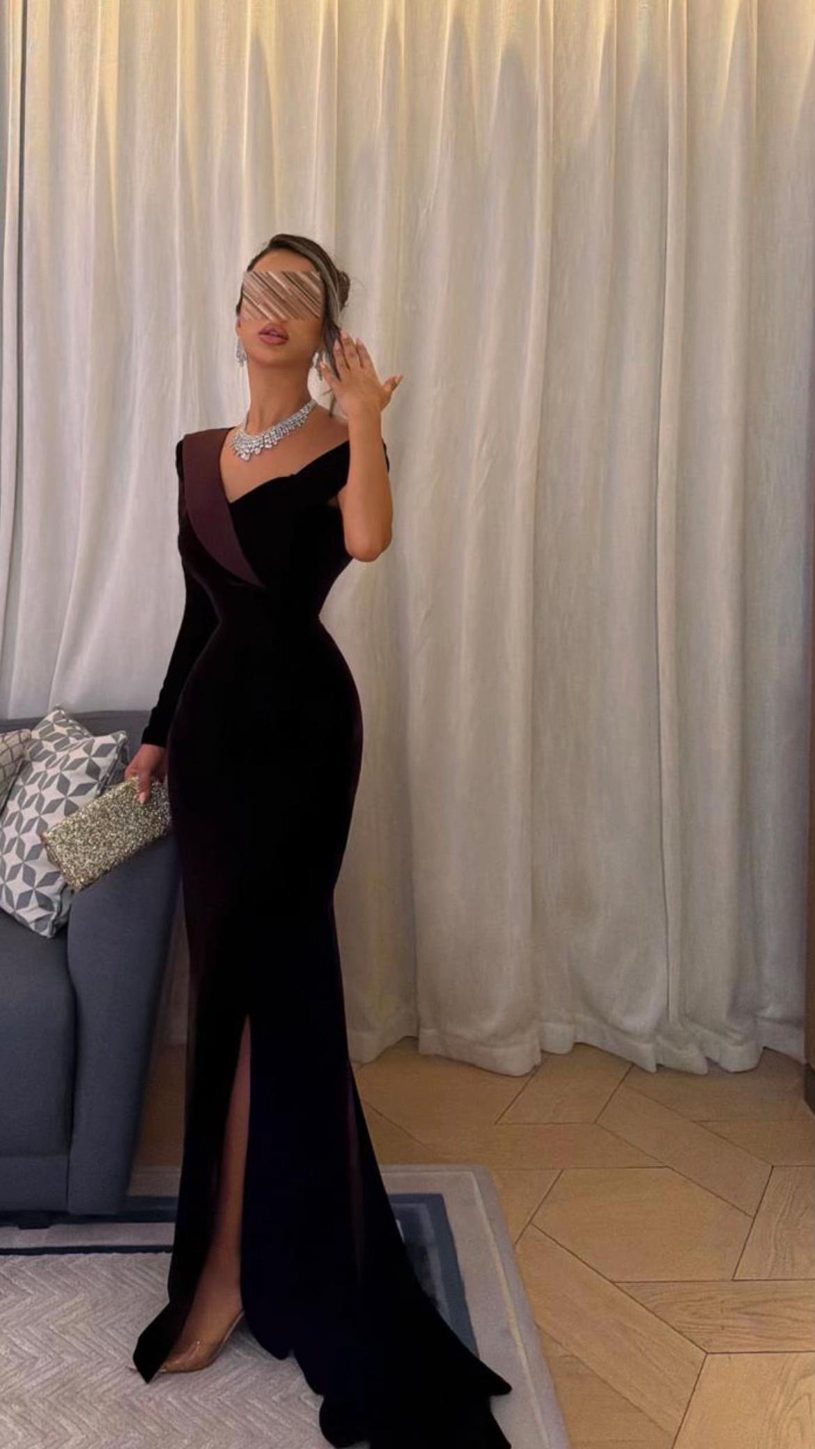 فستان سهرة مخملي باللون الأسود الساحر، يجمع بين البساطة الفاخرة والقصّة الذكية اللي تنحت الخصر وتبرز جمال القوام.