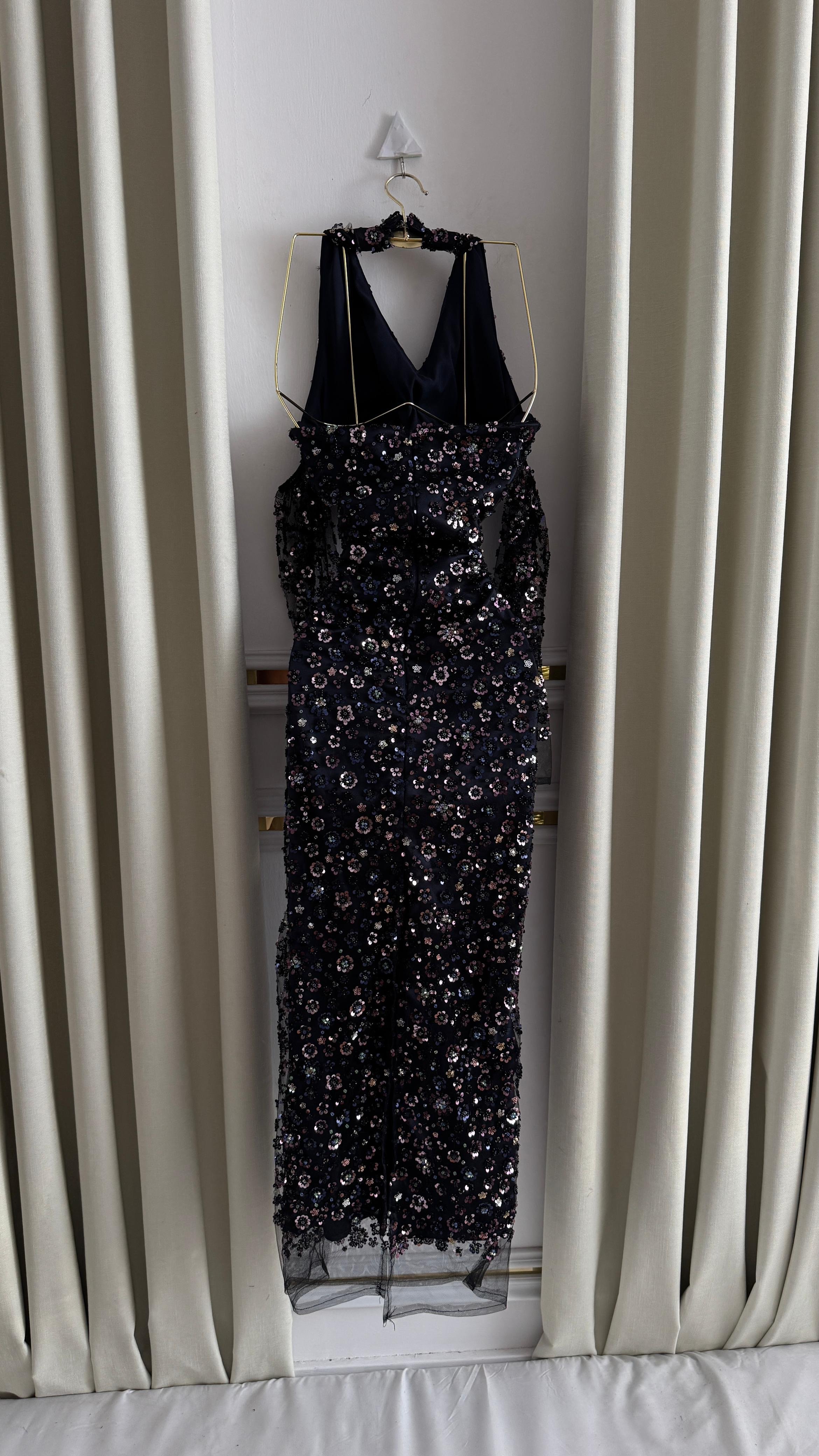الخامة: شيفون مطرز بالترتر عالي الجودة مع بطانة مريحة.