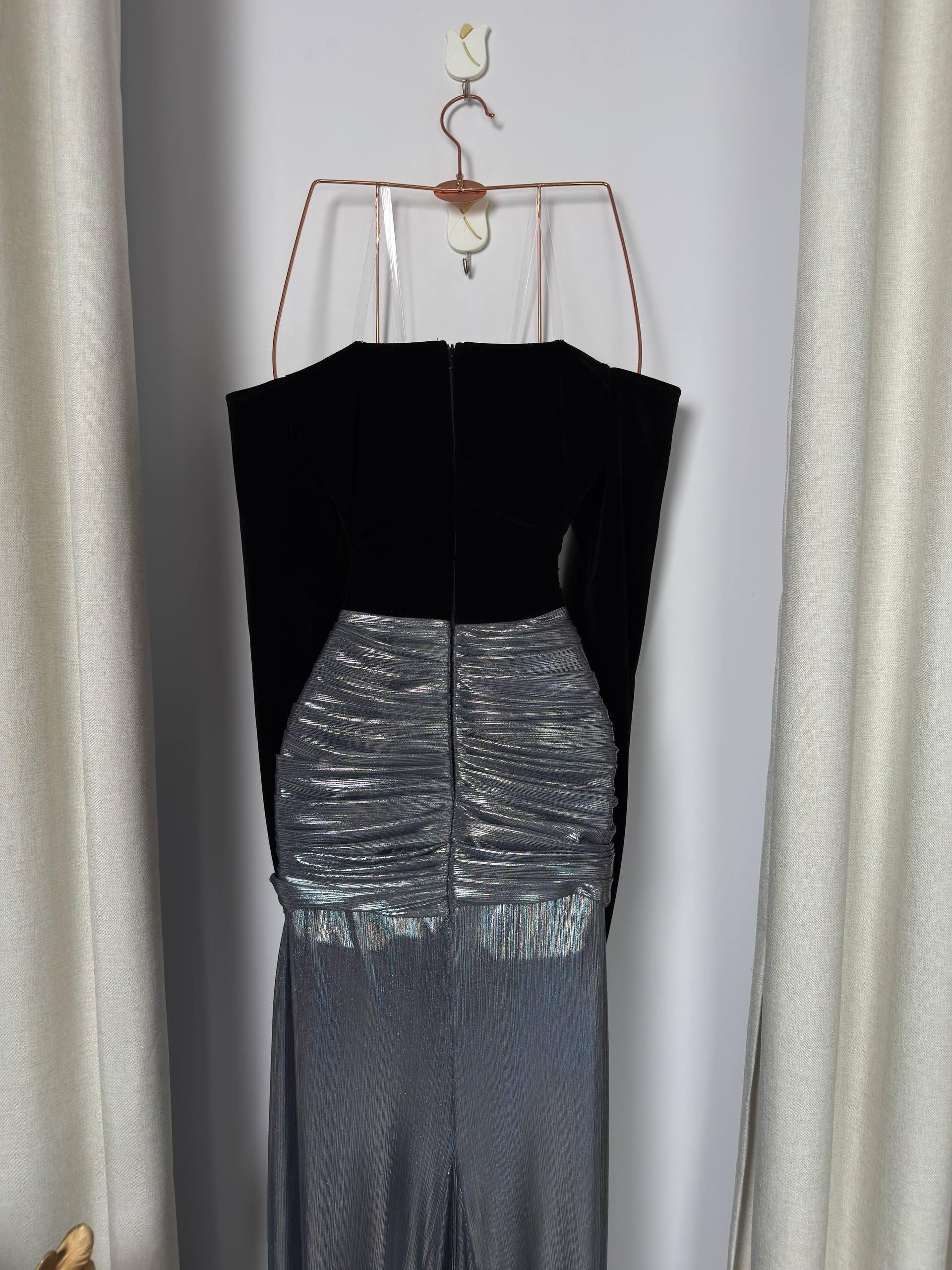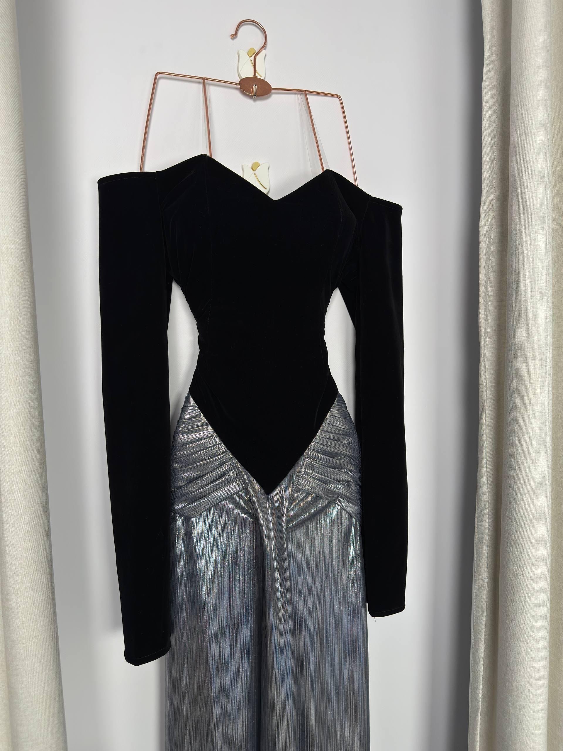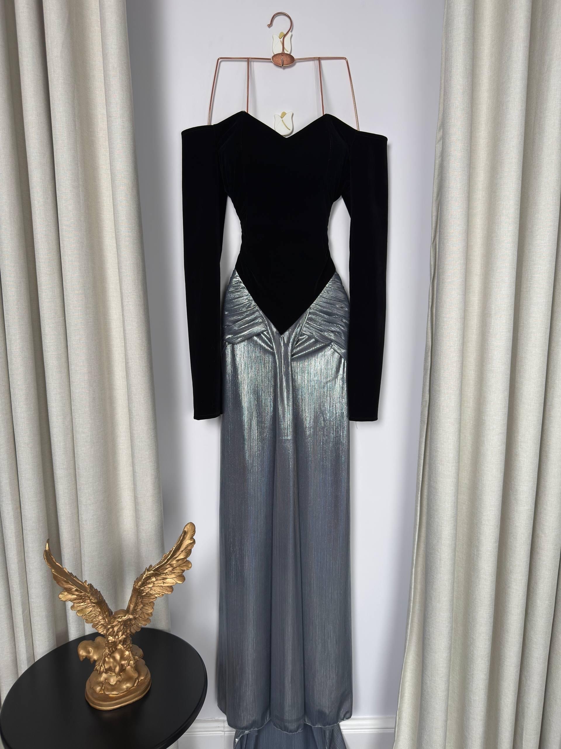 التصميم يجمع بين عمق الأسود وقوة الفضي، ليقدم إطلالة جريئة، راقية، ومثالية لسهرات تتطلب تميزًا لا يُنسى.