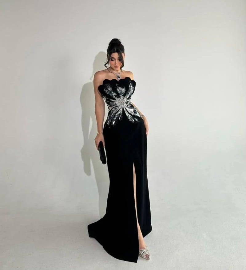 إطلالة تجمع بين الفخامة والجرأة… كلاسيكية بلون أسود راقٍ، ومبهرة بتفاصيل فضية تخلي حضورك مختلف.
