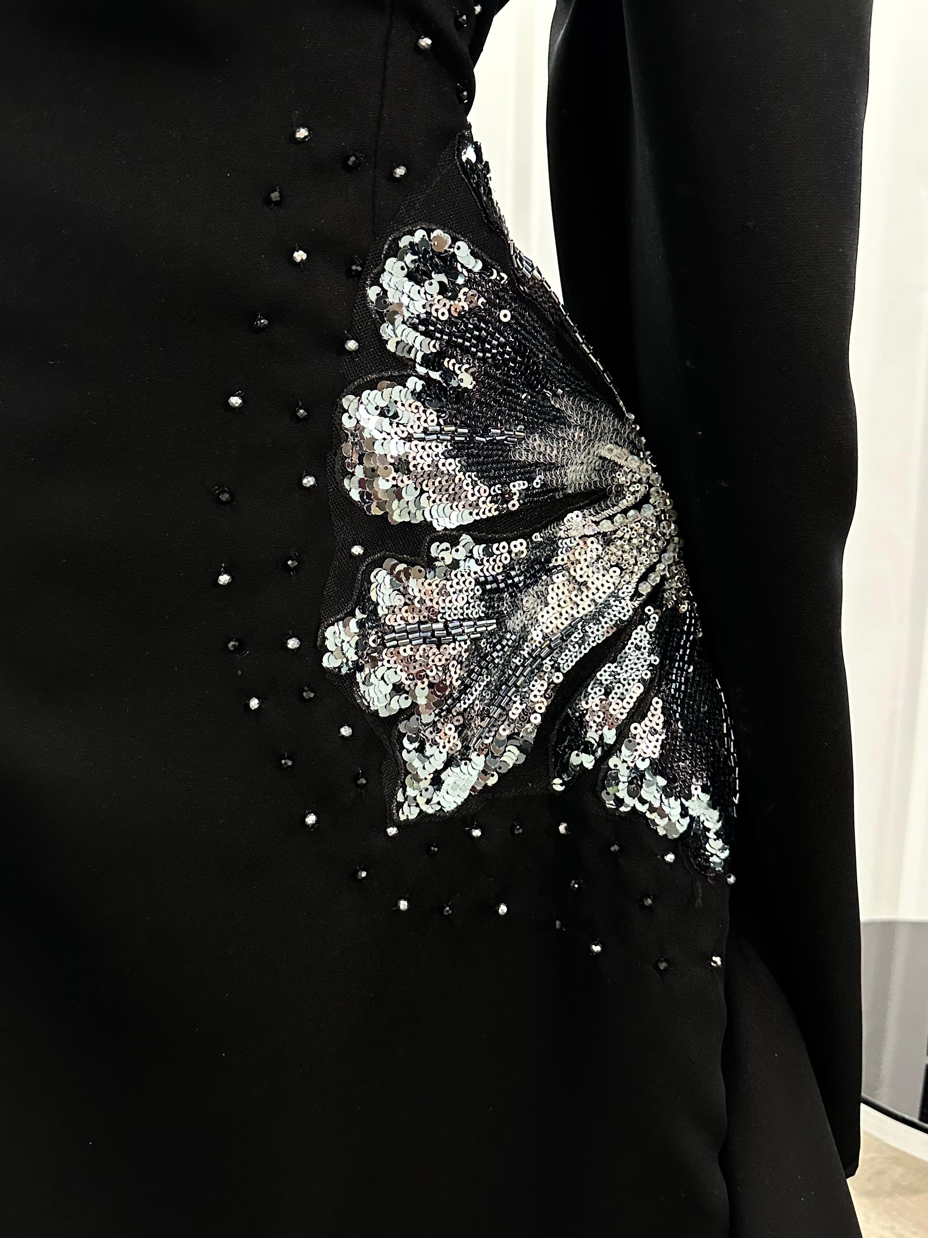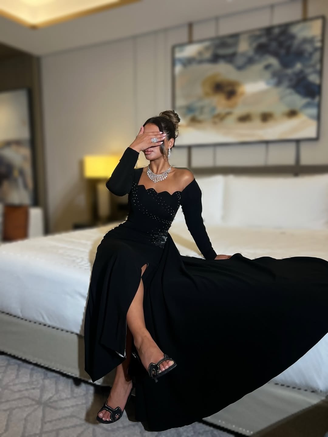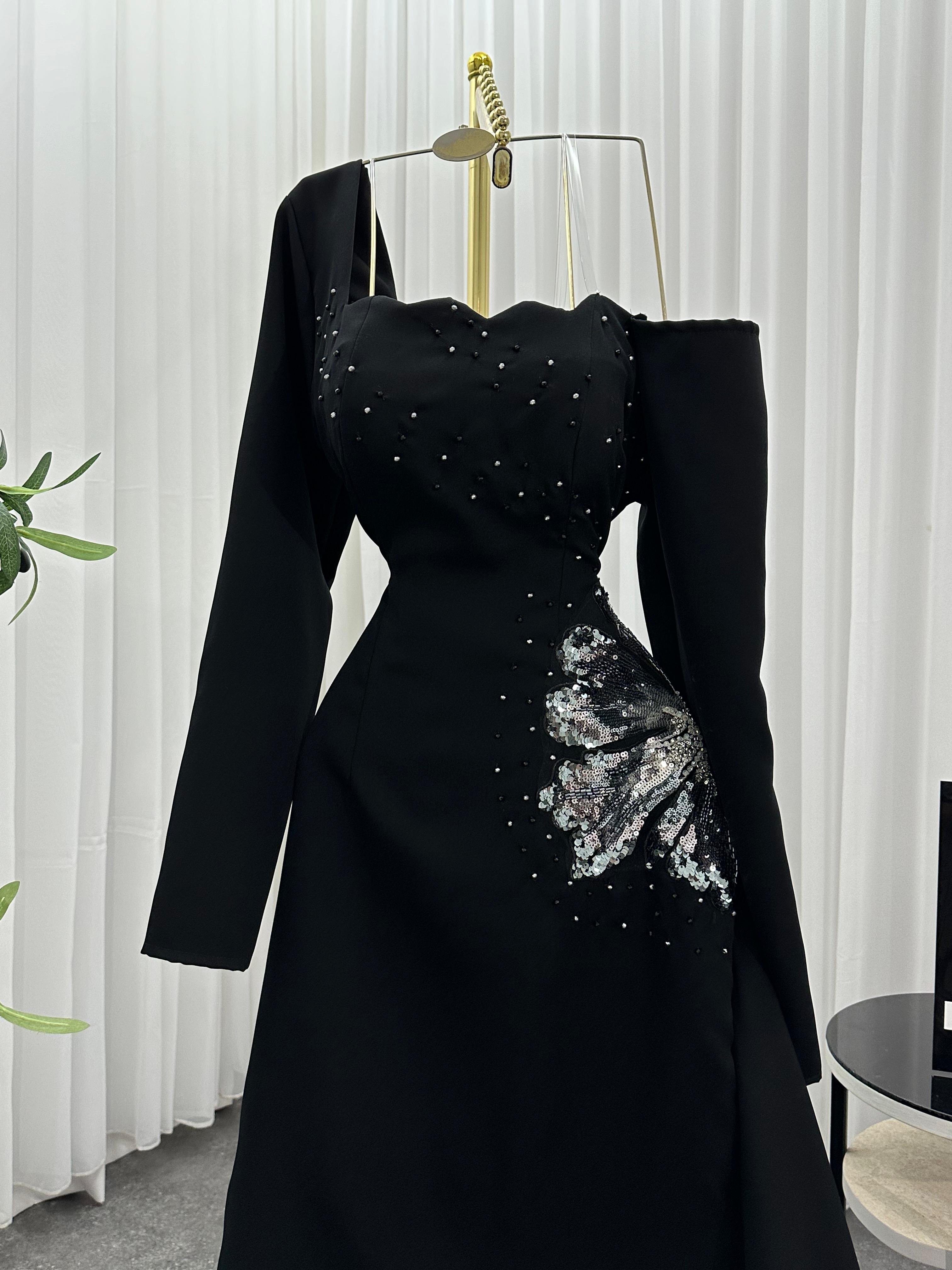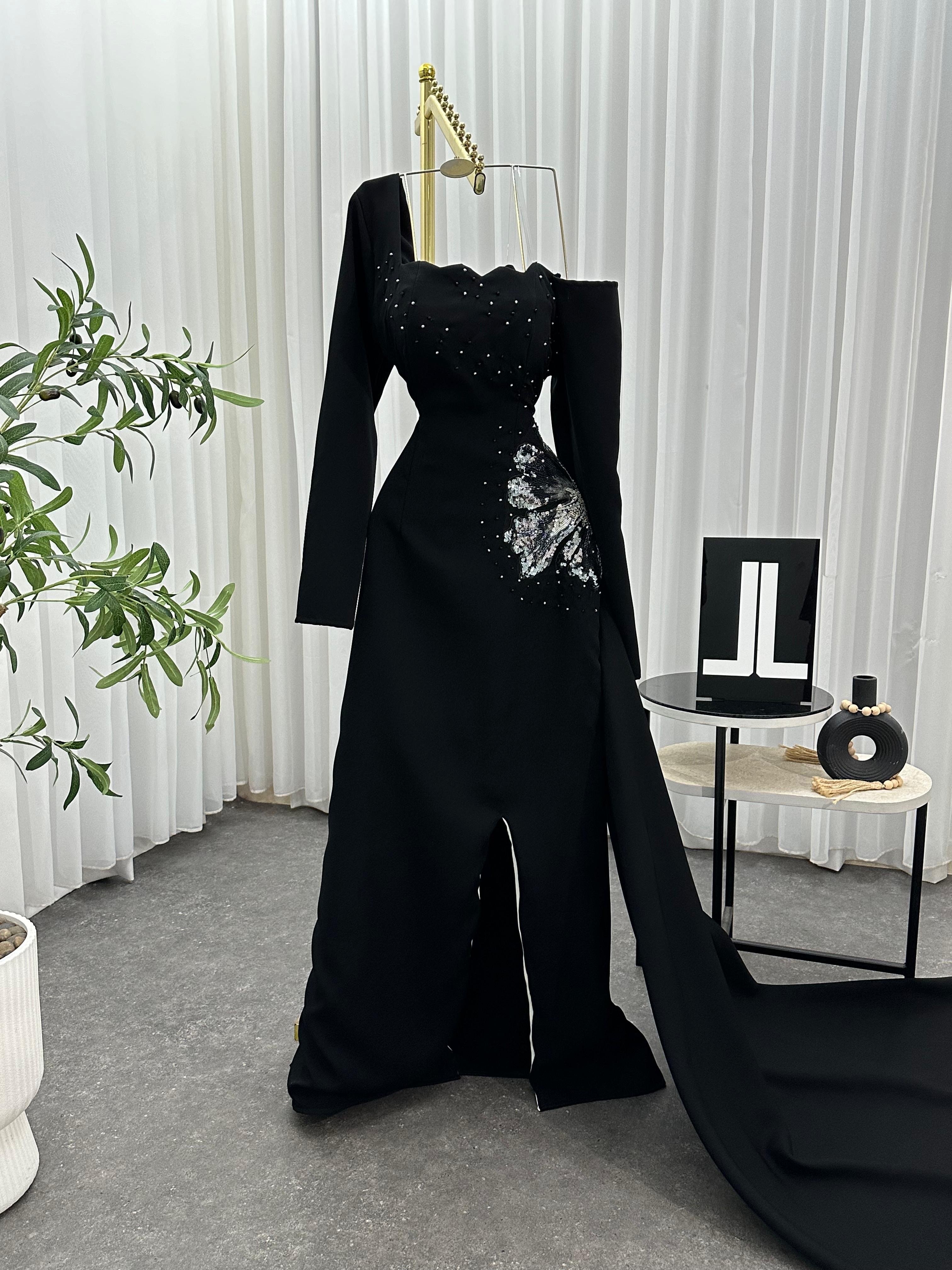 فستان أسود ملكي بقصة قلب أنيقة وكورسيه مشدود يعانق القوام بجاذبية راقية. تصميمه الانسيابي مع الشق الجانبي يُضفي لمسة جريئة تلفت الأنظار، بينما تبرز الأكمام الطويلة تفاصيلك بسحر آسر وأناقة مترفة. يزدان الفستان بترصيع ناعم على الصدر والخصر يلمع مع كل حركة، ليمنحك حضورًا فخمًا لا يُنسى في كل سهرة