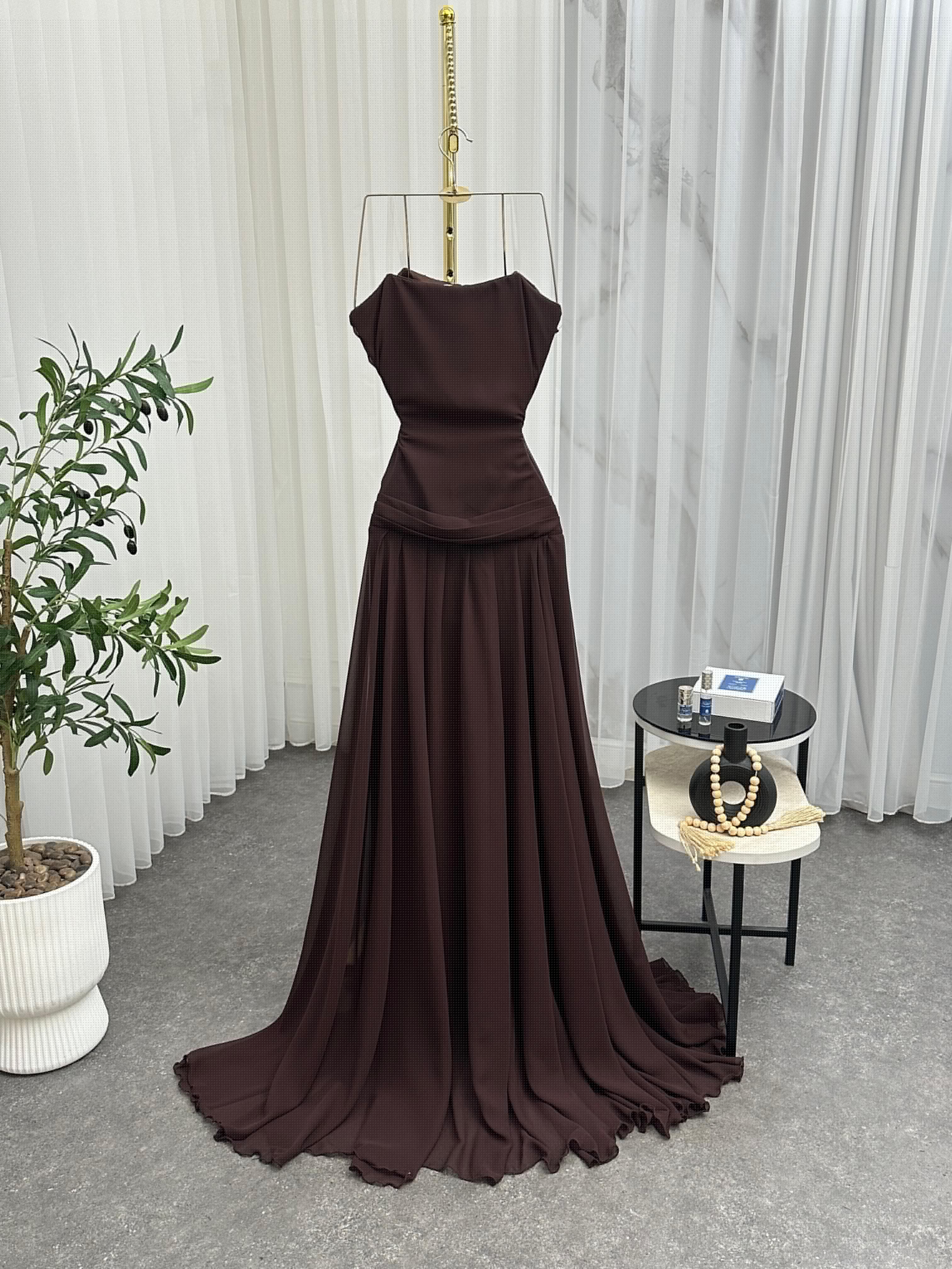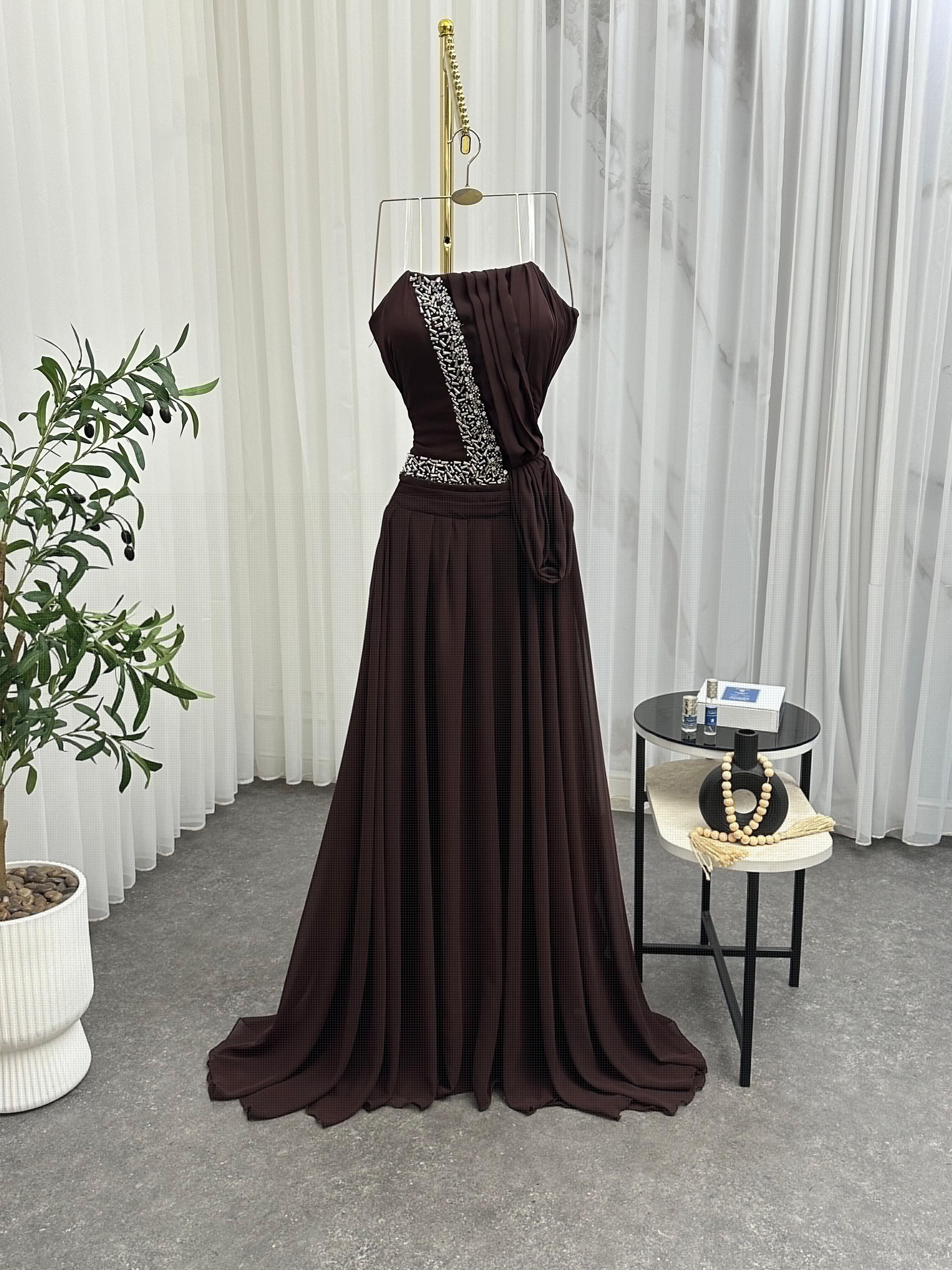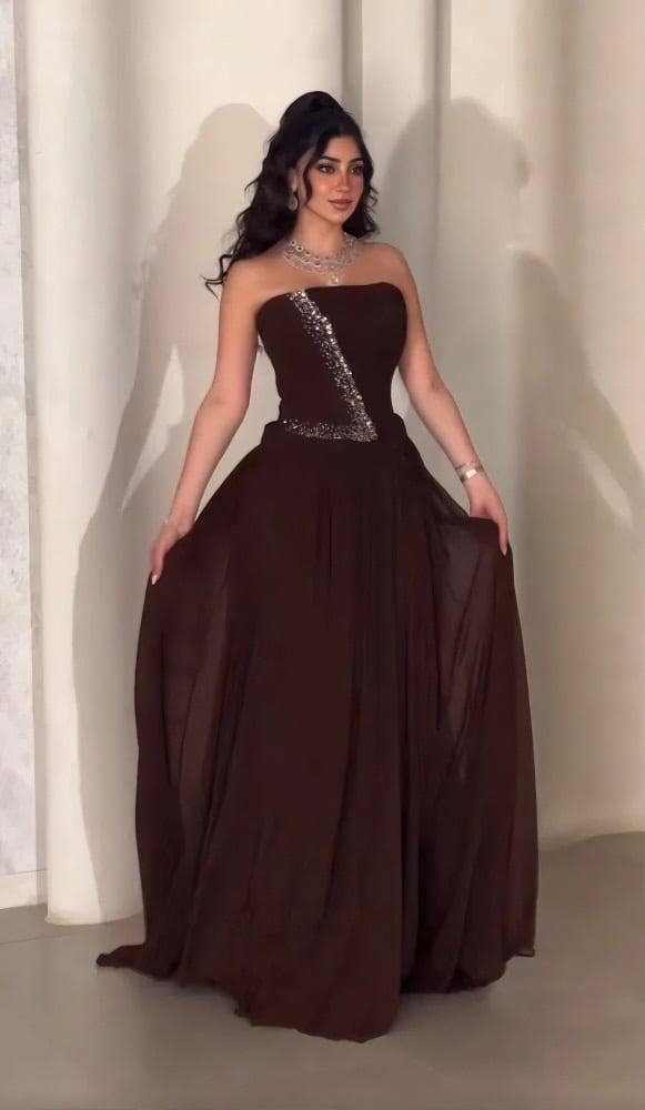 فستان سهرة فاخر باللون البني الغامق، يتميز بقصة صدر مستقيمة بدون أكتاف مع تطريز كريستالي أنيق يمتد بشكل مائل ليبرز الخصر ويضفي لمسة براقة. تنورته الواسعة الانسيابية تمنحك إطلالة ملكية جذابة، مثالية للسهرات الفاخرة وحفلات المساء.