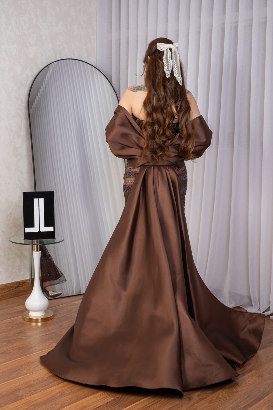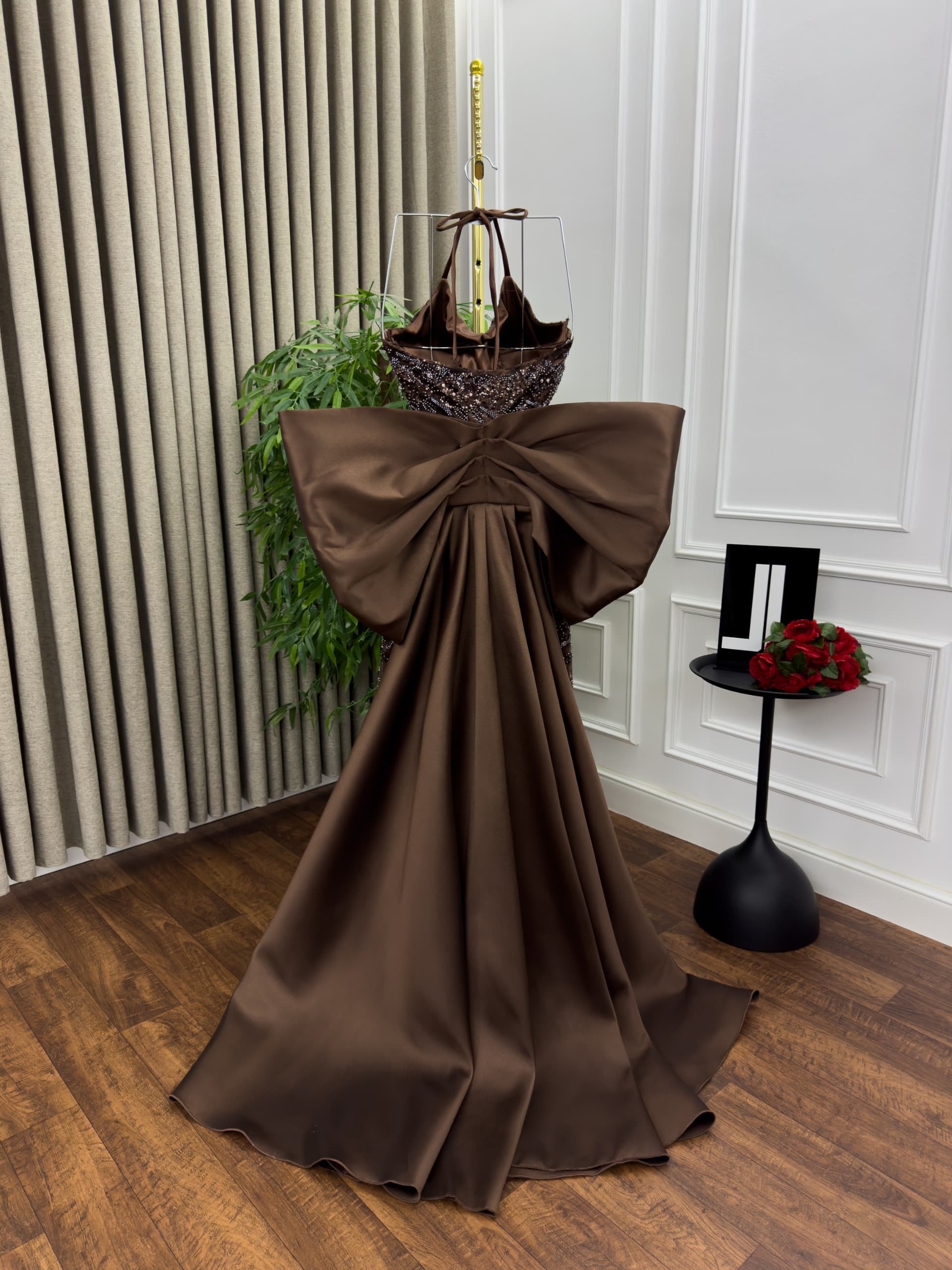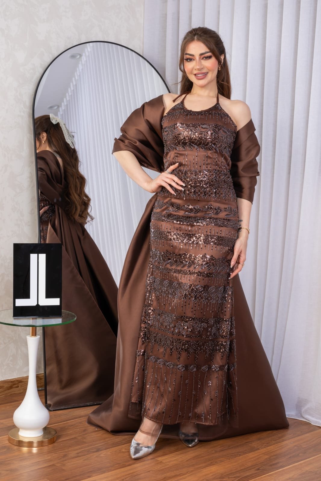 أبهري الجميع بإطلالة مترفة مع هذا الفستان البني الساحر، المصمم بذوق رفيع ليجمع بين الفخامة والرقي في كل تفصيلة. يأتي الفستان بقصة ناعمة انسيابية تبرز جمال القوام، مع ياقة هالتر أنيقة تكشف الكتفين بأسلوب أنثوي جذاب.