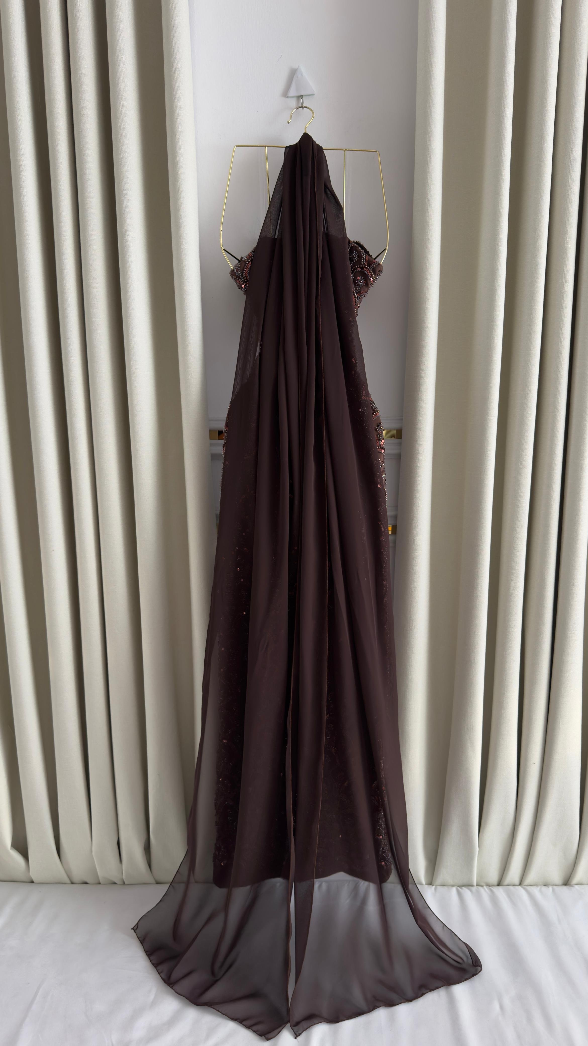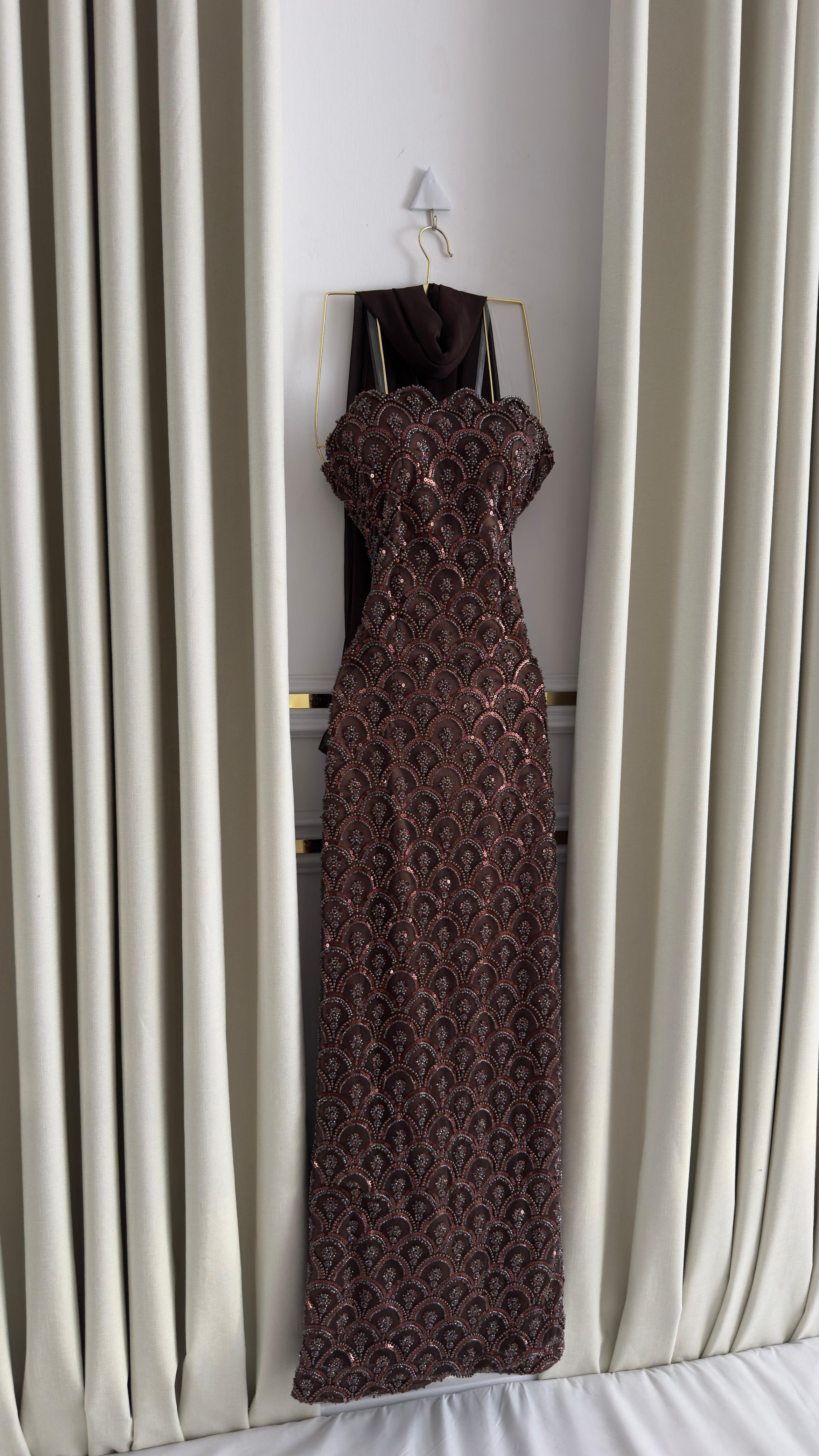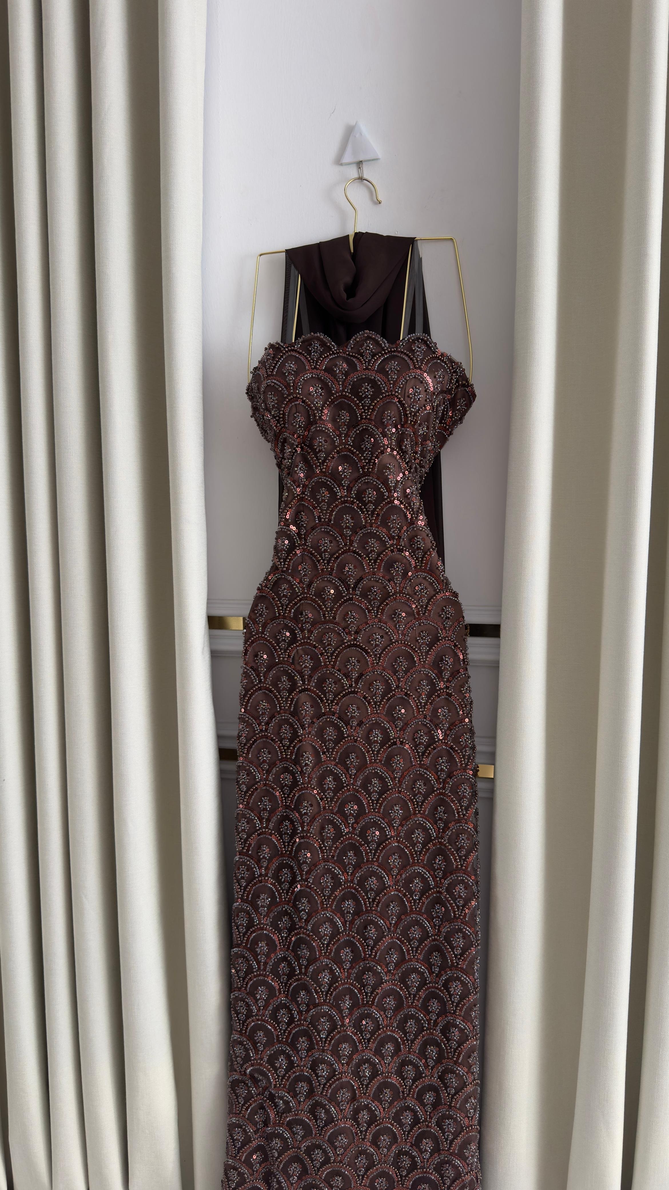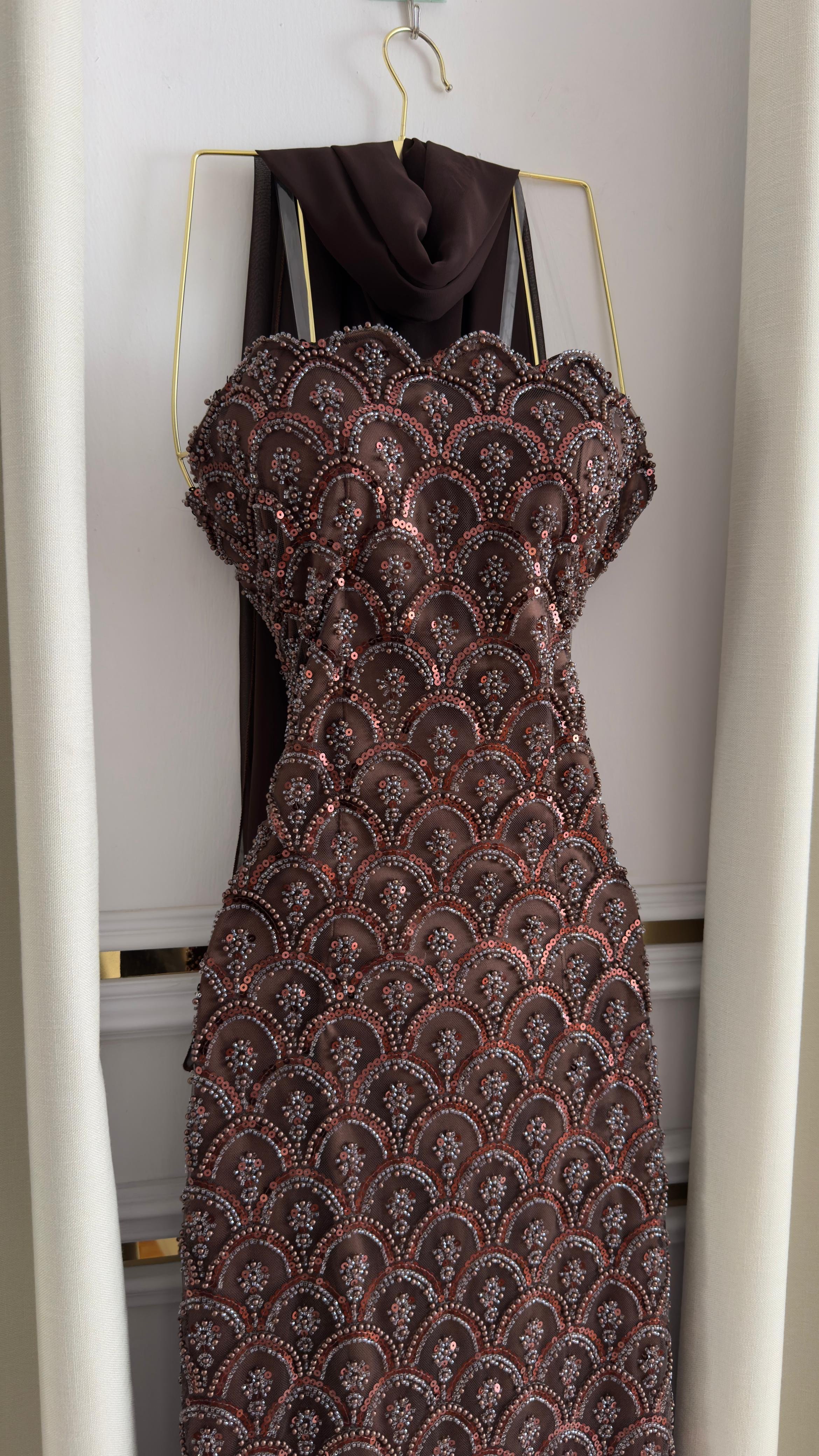 هذا الفستان البني المطرز يبرز بجمال تفاصيله البراقة التي تعكس الضوء برقي مبهر، مع قصّة مستقيمة تبرز أنوثة القوام. التطريزات المتناغمة تمنحه لمسة فاخرة مثالية للمناسبات المسائية أو حفلات السهرة.