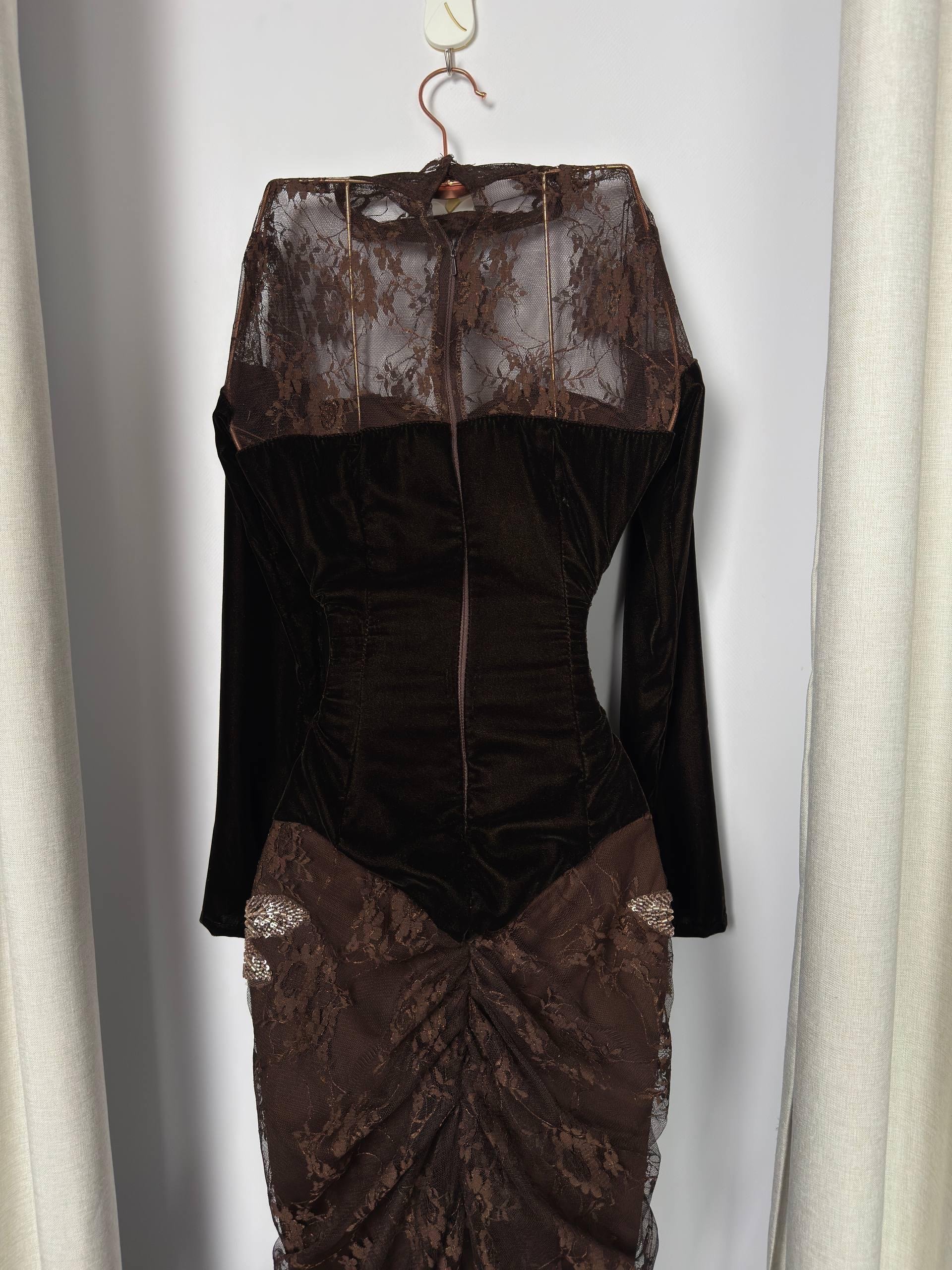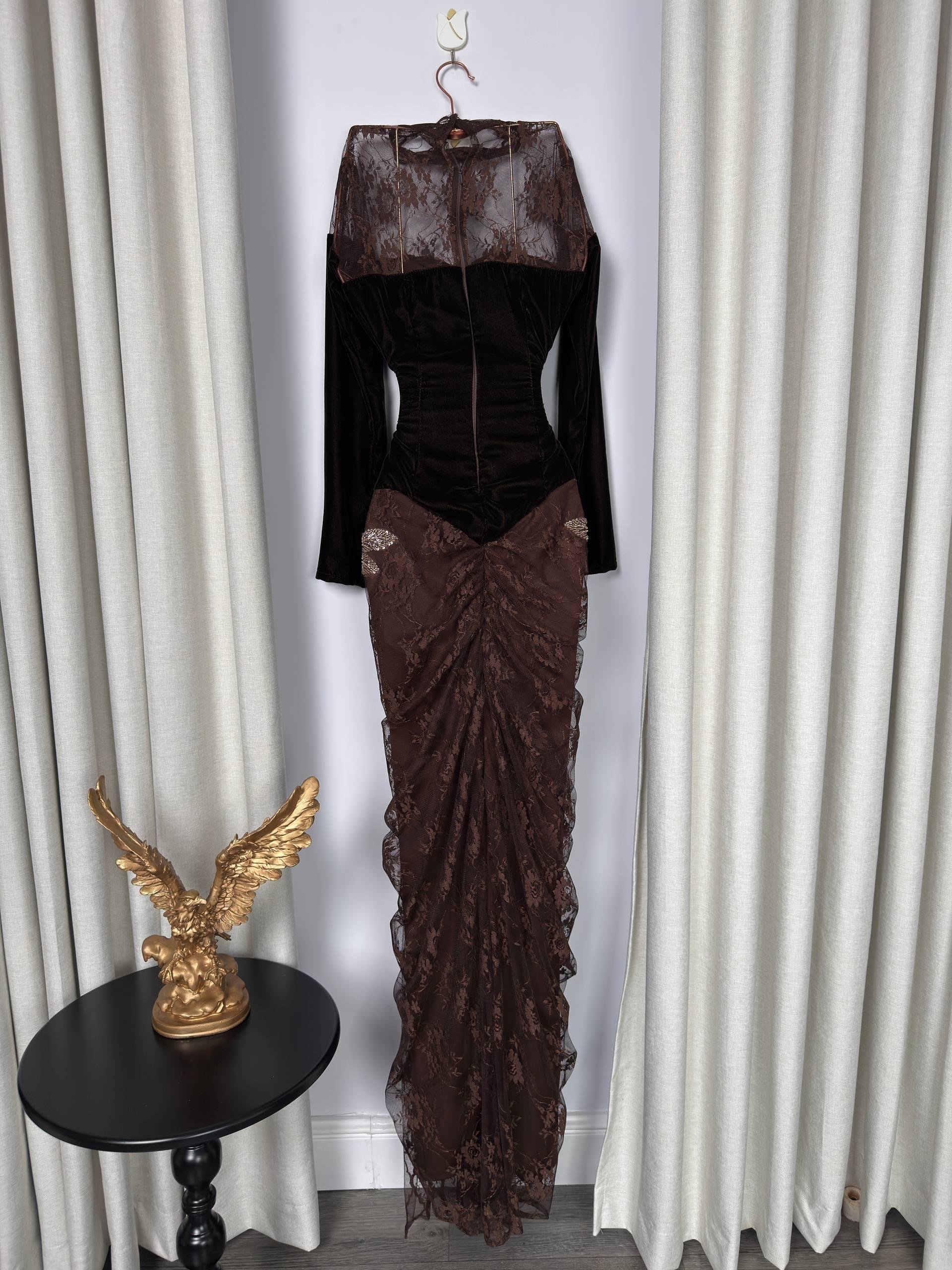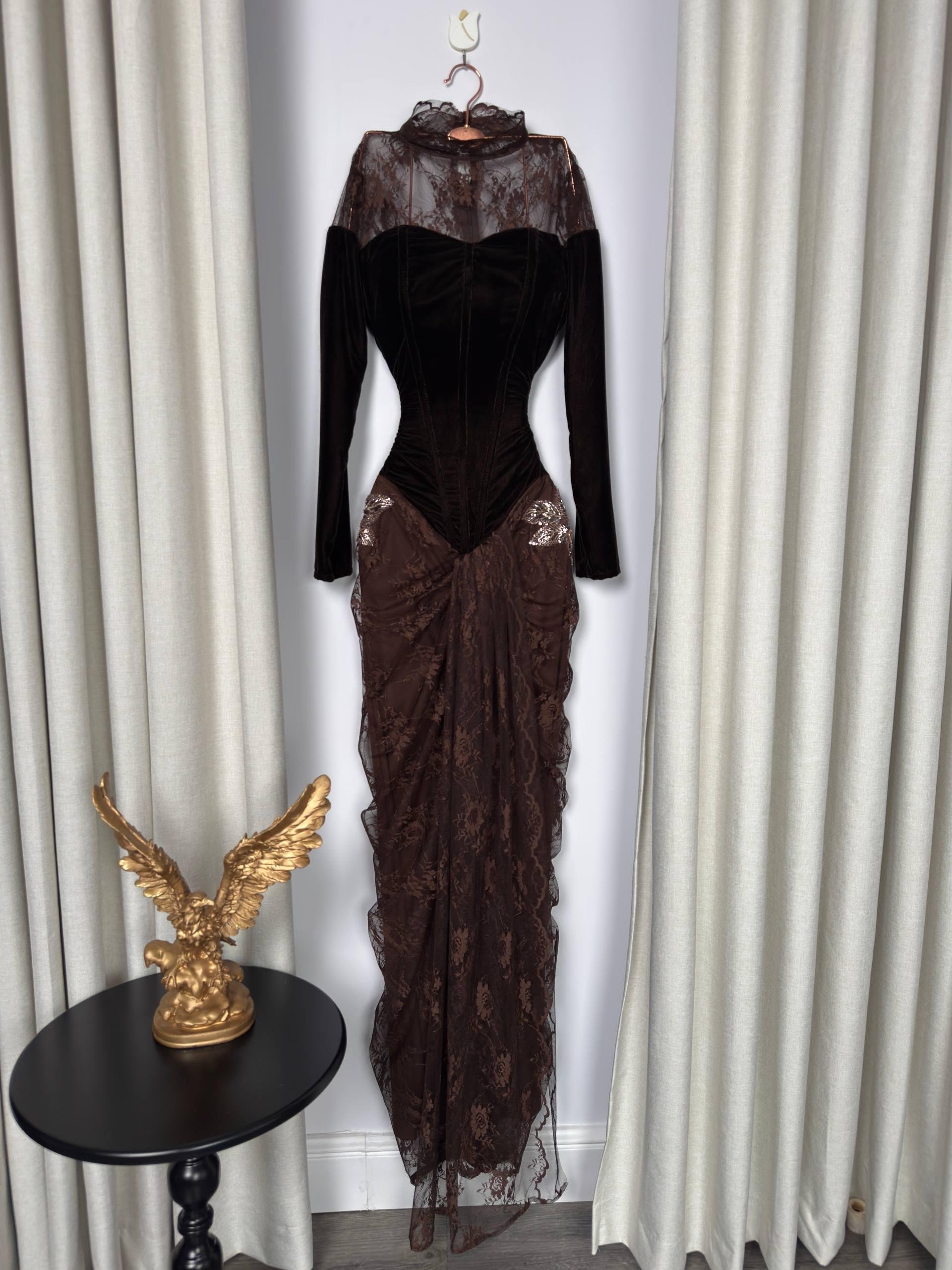 يجمع بين المخمل البني الفاخر الذي يعكس الدفء والترف، وبين توب دانتيل شفاف بأطراف ناعمة يُبرز العنق والكتفين بنعومة آسرة.