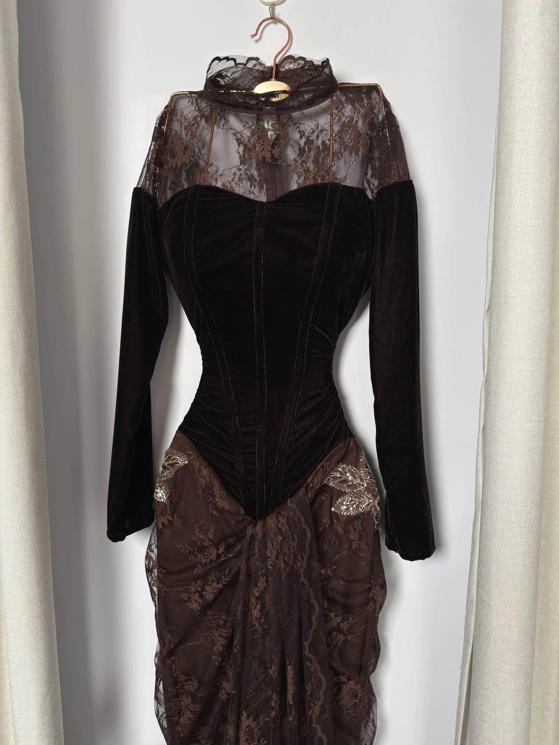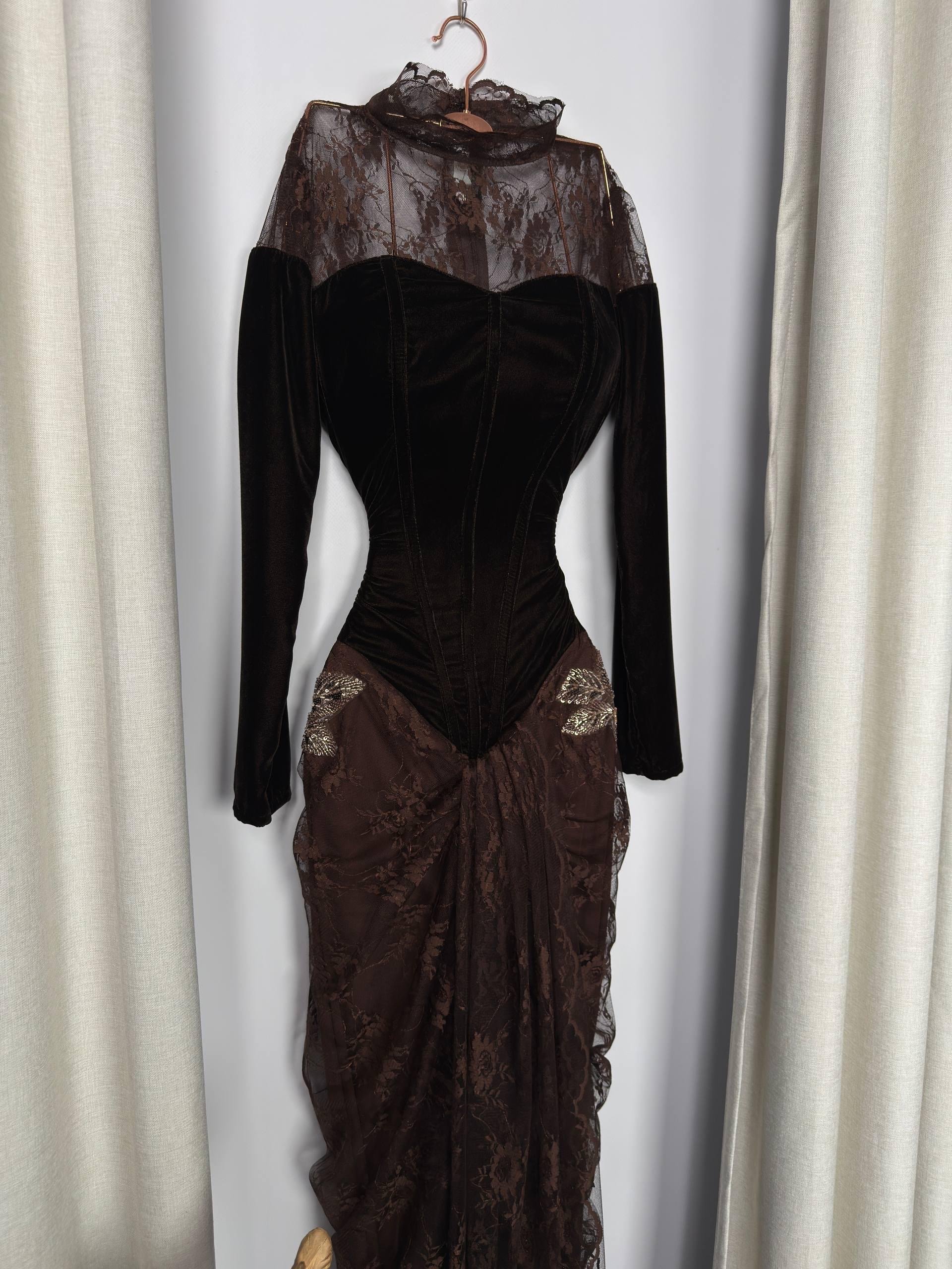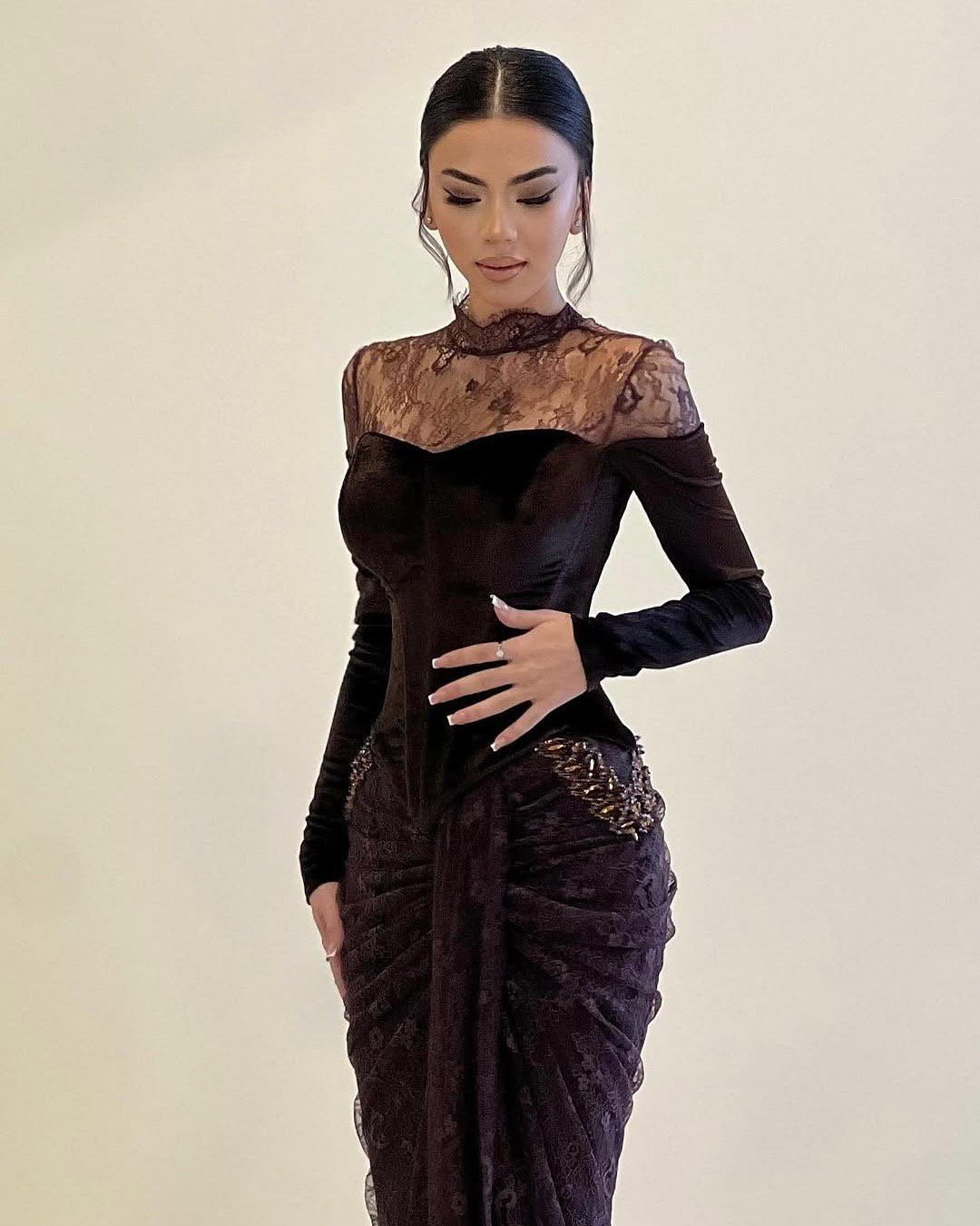يجمع بين المخمل البني الفاخر الذي يعكس الدفء والترف، وبين توب دانتيل شفاف بأطراف ناعمة يُبرز العنق والكتفين بنعومة آسرة.