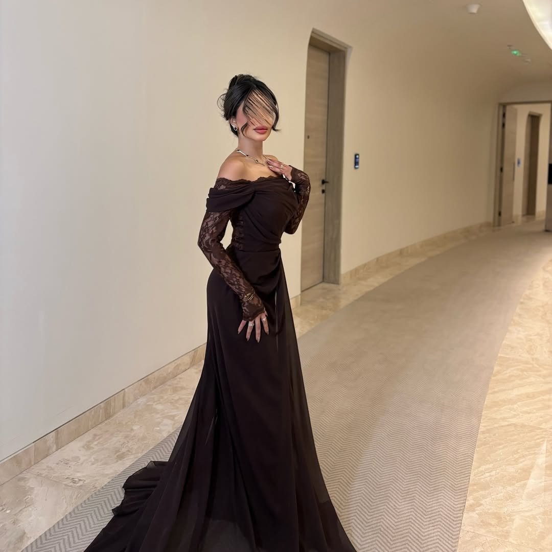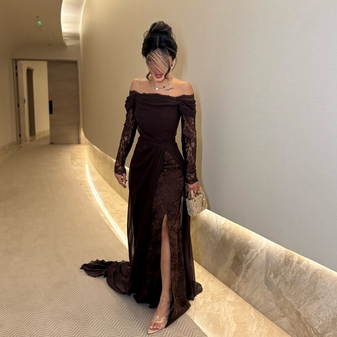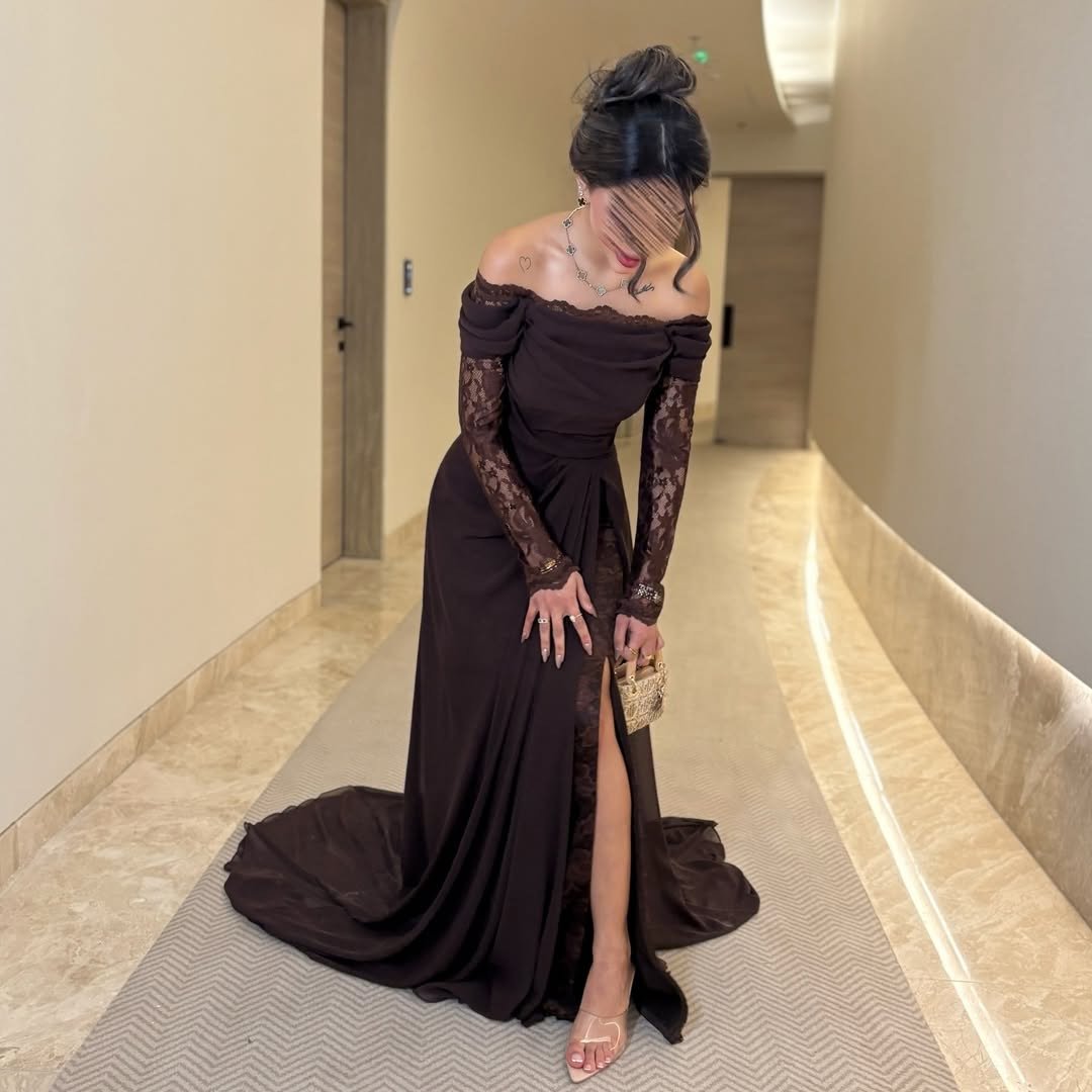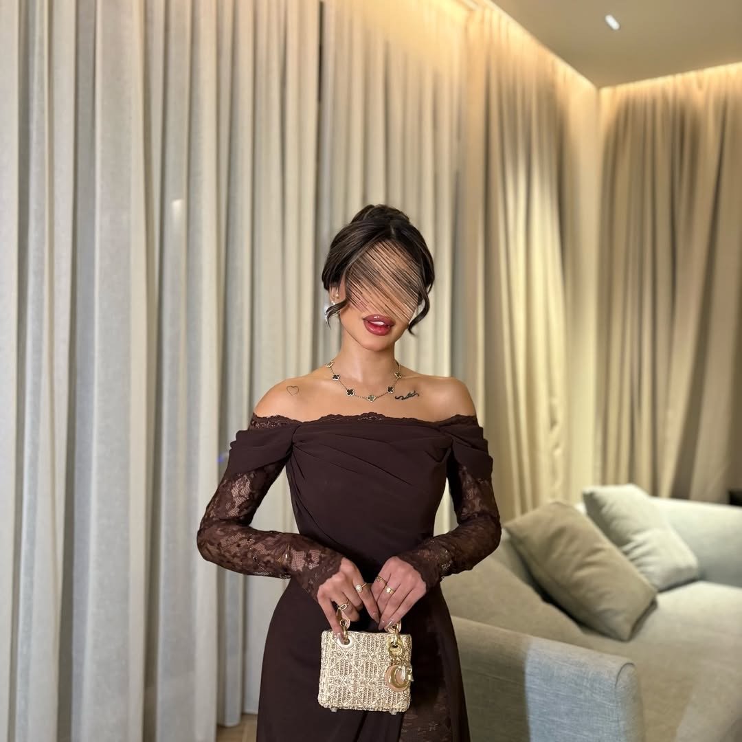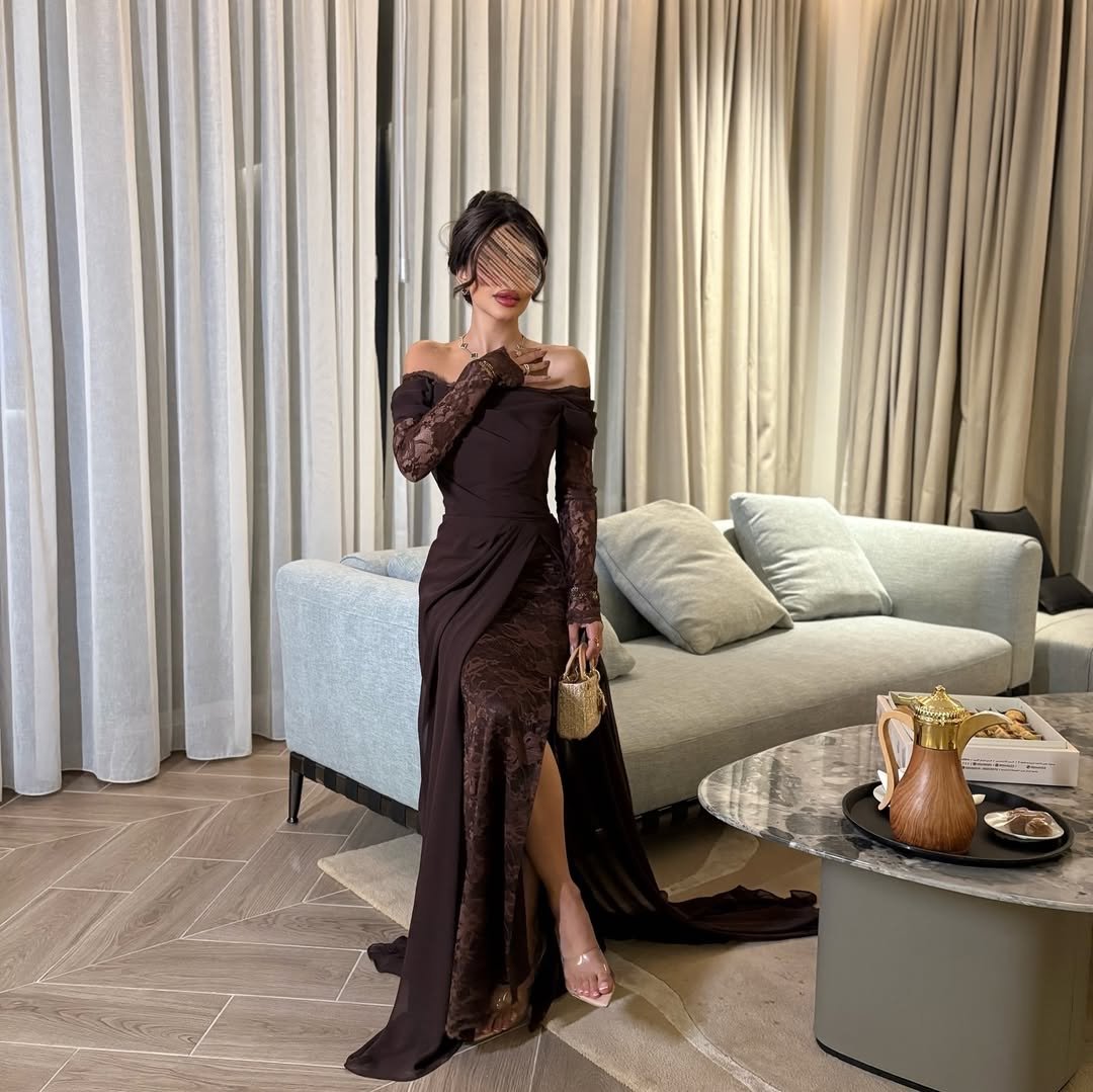 إطلالة فاخرة تخطف الأنظار مع هذا الفستان البني الراقي بتصميم أوف شولدر أنثوي يبرز جمال الأكتاف، مع أكمام طويلة من الدانتيل تضيف لمسة رومانسية ناعمة. يتميز الفستان بقصة مميزة مع شق جانبي أنيق يمنحك مظهراً أكثر جاذبية وانسيابية مع الذيل المتدفق.