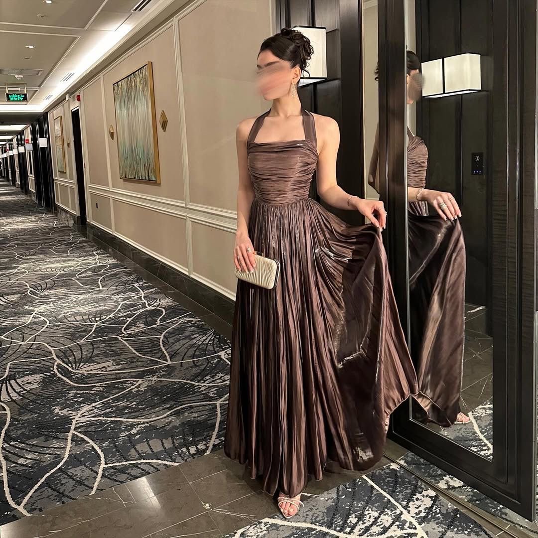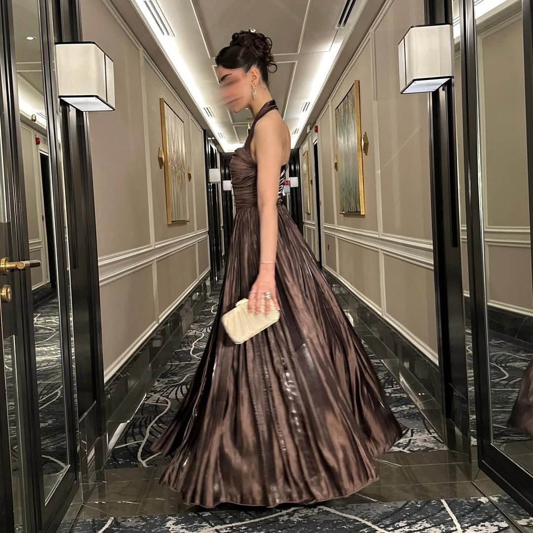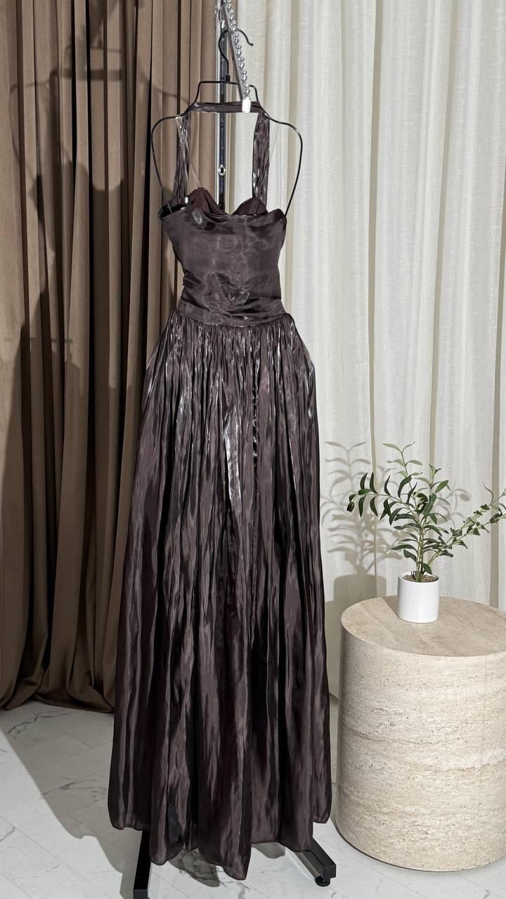 فستان سهرة فاخر باللون البني الغني، مصمم من قماش ساتان لامع يضفي لمسة ملكية ناعمة. يتميز بستايل هالتر أنثوي مع صدر مطوي وقصة خصر مشدودة، بينما تنورته الواسعة تضيف انسيابية ساحرة في الحركة. إطلالة مثالية للسهرات الفاخرة والمناسبات الخاصة.