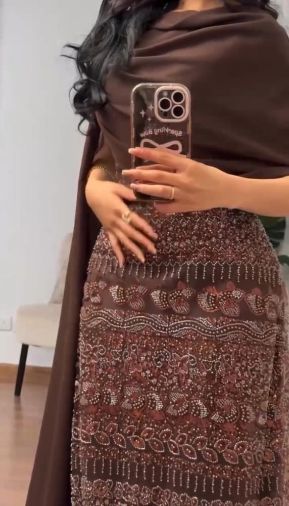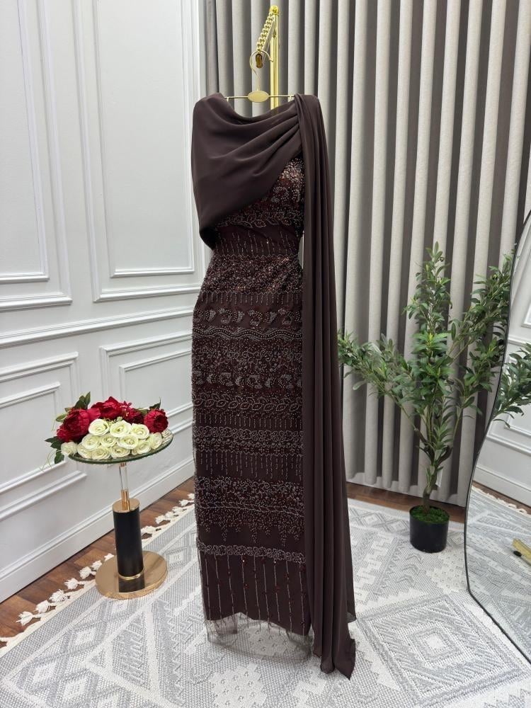 فستان سهرة فاخر باللون البني البراق يزدان بتطريز متقن يضيف لمسة فخامة ورقي. يتميز بتصميم ضيق يحدد القوام بأناقة مع شال جانبي انسيابي يمنح إطلالة أنثوية فاخرة. مزيج مثالي بين الكلاسيكية والعصرية، ما يجعله الخيار الأمثل للسهرات والمناسبات الخاصة.