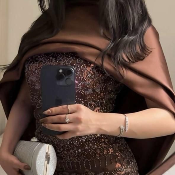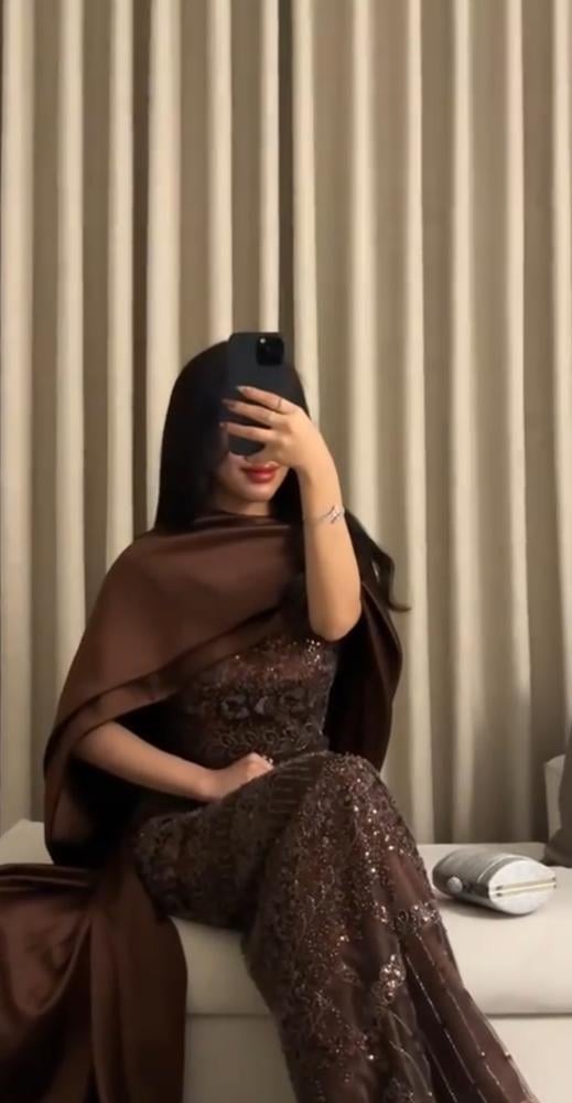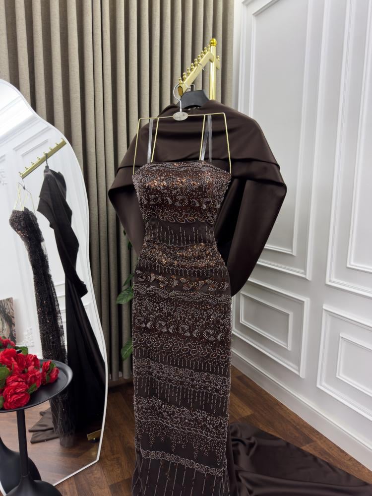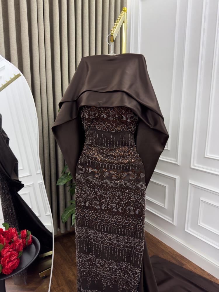 فستان سهرة راقٍ باللون البني البراق، يزدان بتطريز متقن يضفي لمسة من الفخامة والتميز. يتميز بقصة ضيقة تبرز القوام برقي، مع شال طويل منسدل يضيف لمسة ملكية وانسيابية ساحرة. مزيج مثالي بين الأناقة الكلاسيكية واللمسات العصرية، ليكون الخيار الأمثل في السهرات الراقية والمناسبات الخاصة.