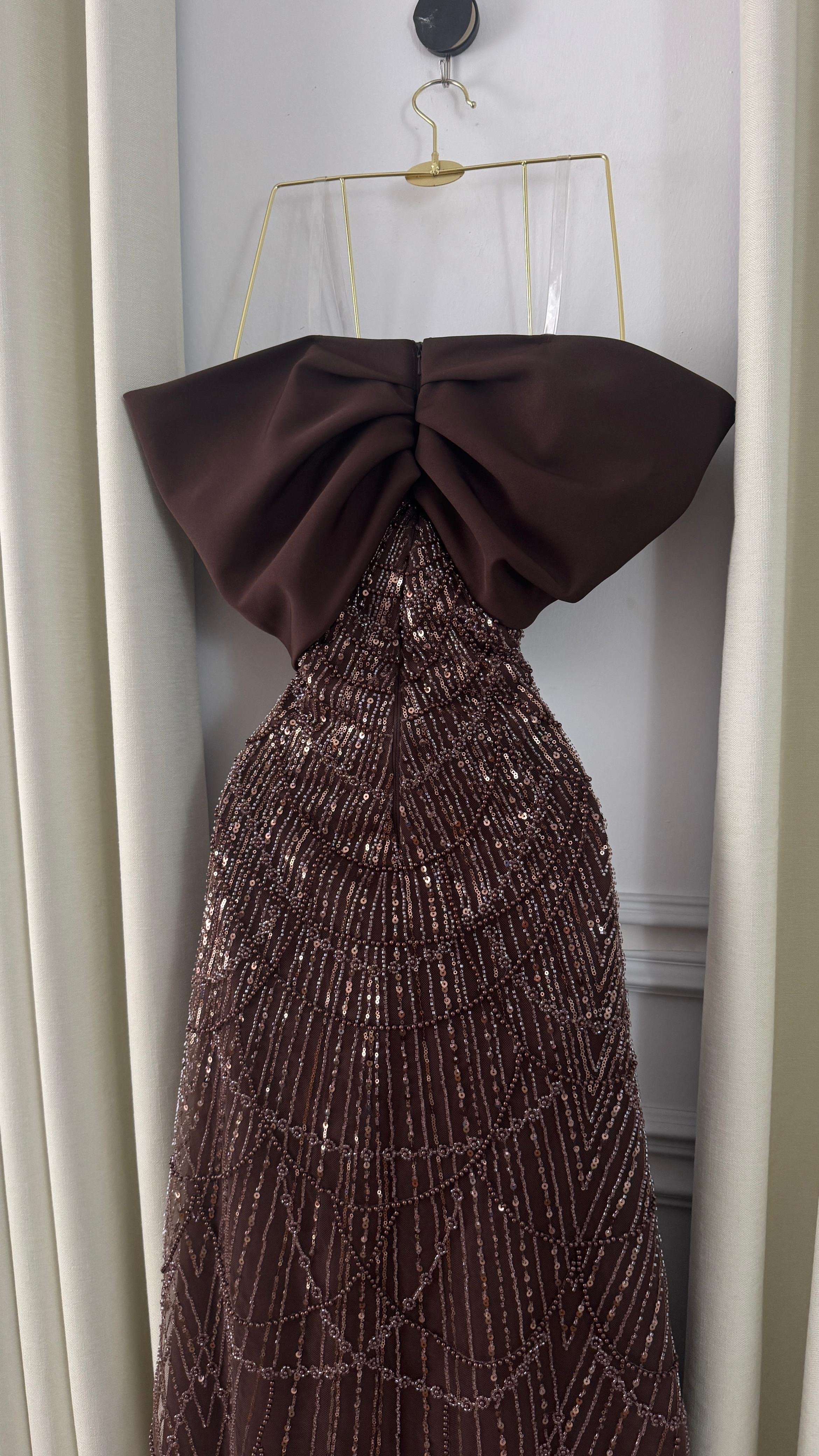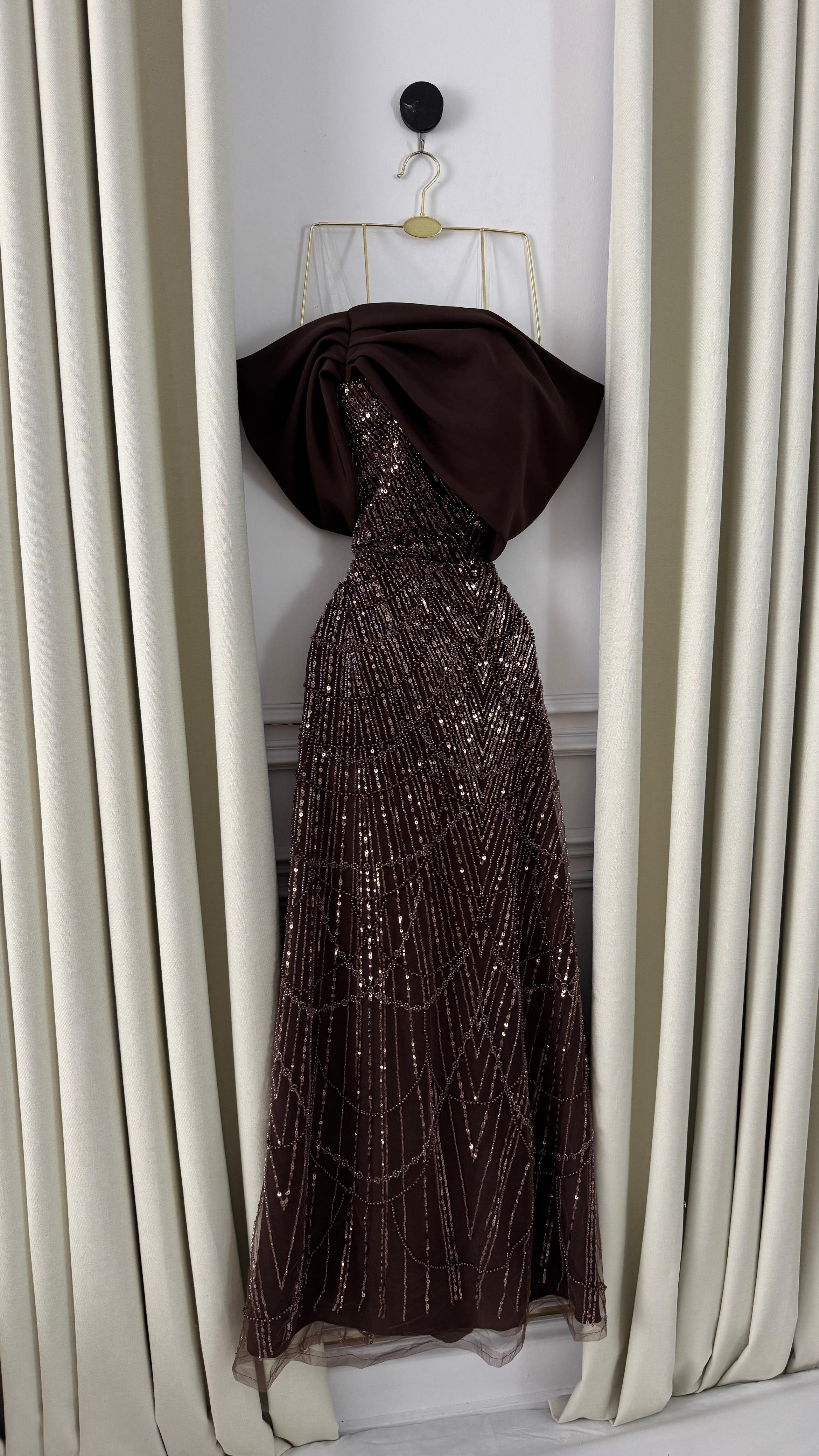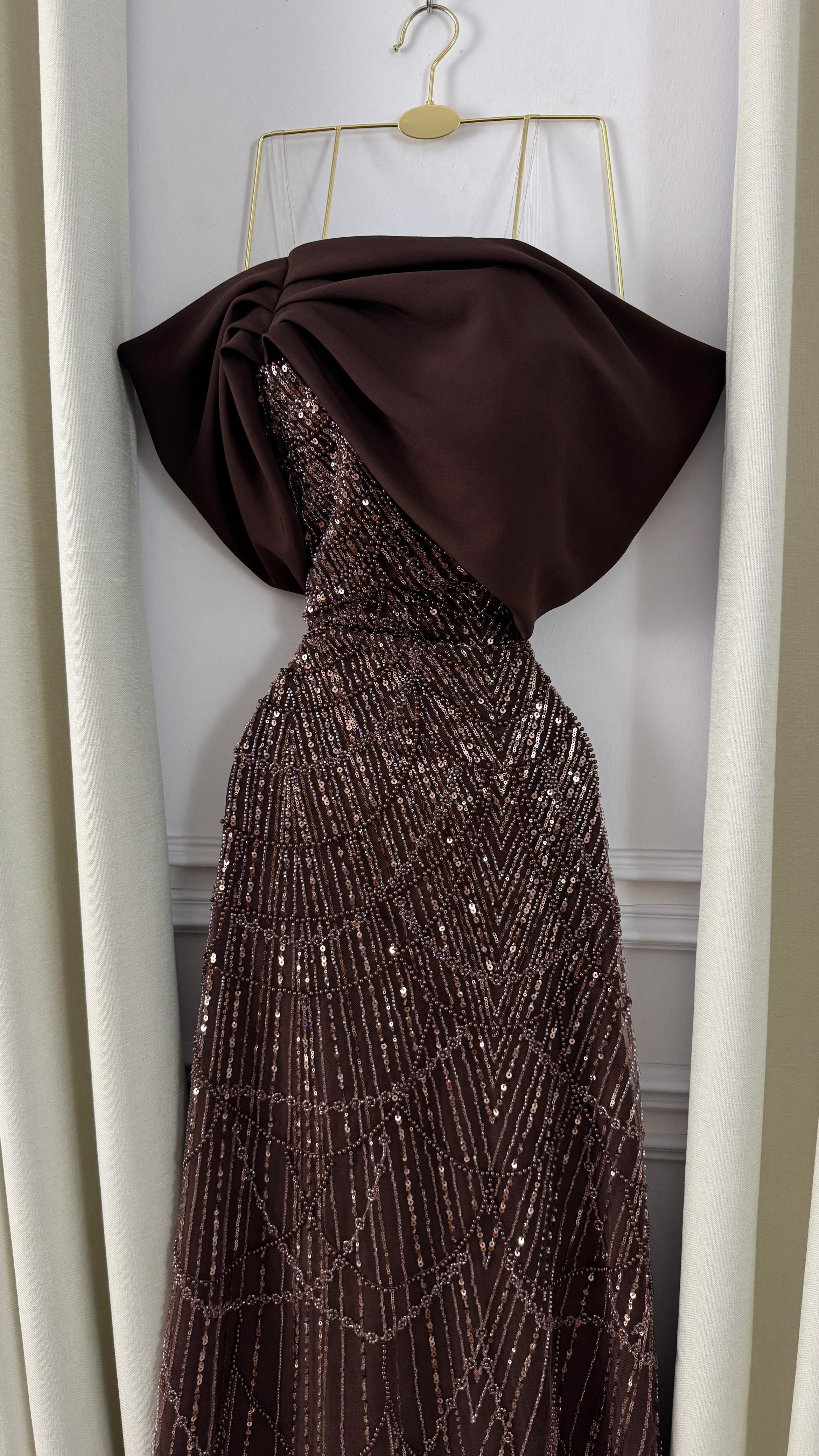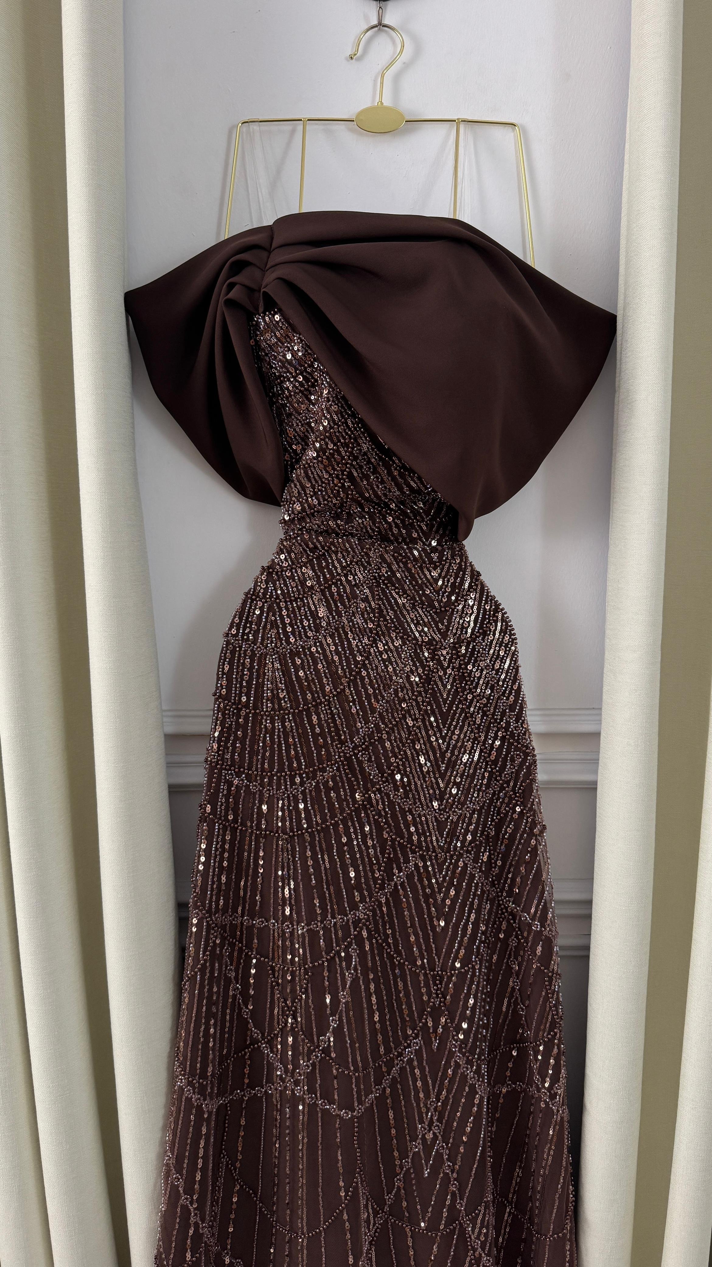 فستان سهرة ساحر باللون البني الداكن، مصمم بروح عصرية تجمع بين الفخامة والجاذبية.