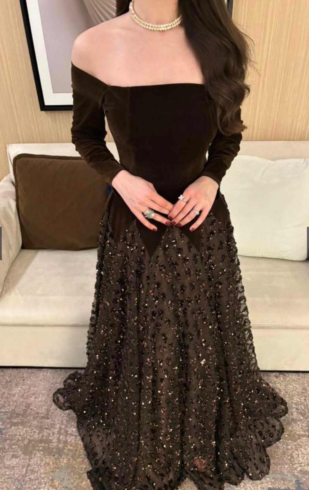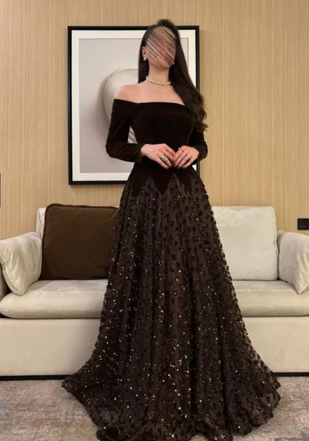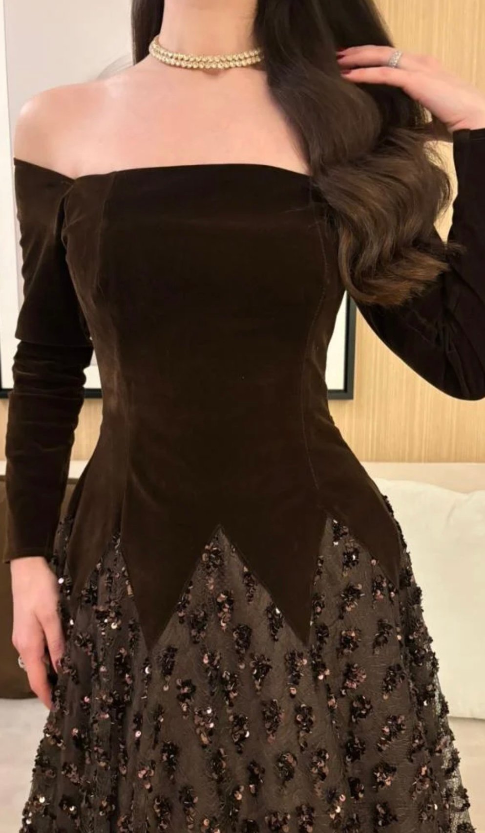 فستان سهرة بلون بني مخملي يعكس دفء الفخامة ورقي التفاصيل.