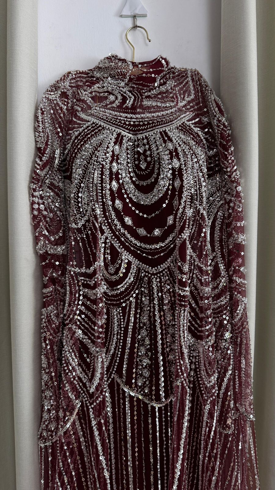 فستان عنابي ملكي مرصع بالكامل بالكريستال والخرز الفضي اللامع. تصميم طويل مع ياقة عالية وأكمام شفافة لمظهر ساحر يخطف الأنظار في كل مناسبة راقية.