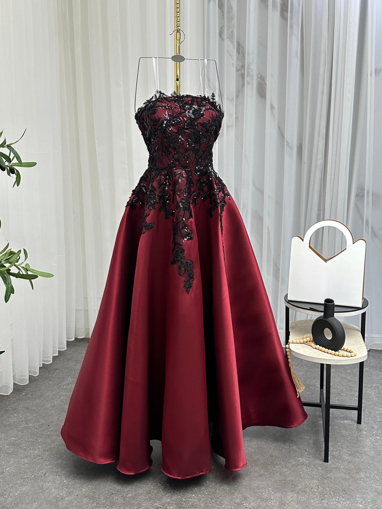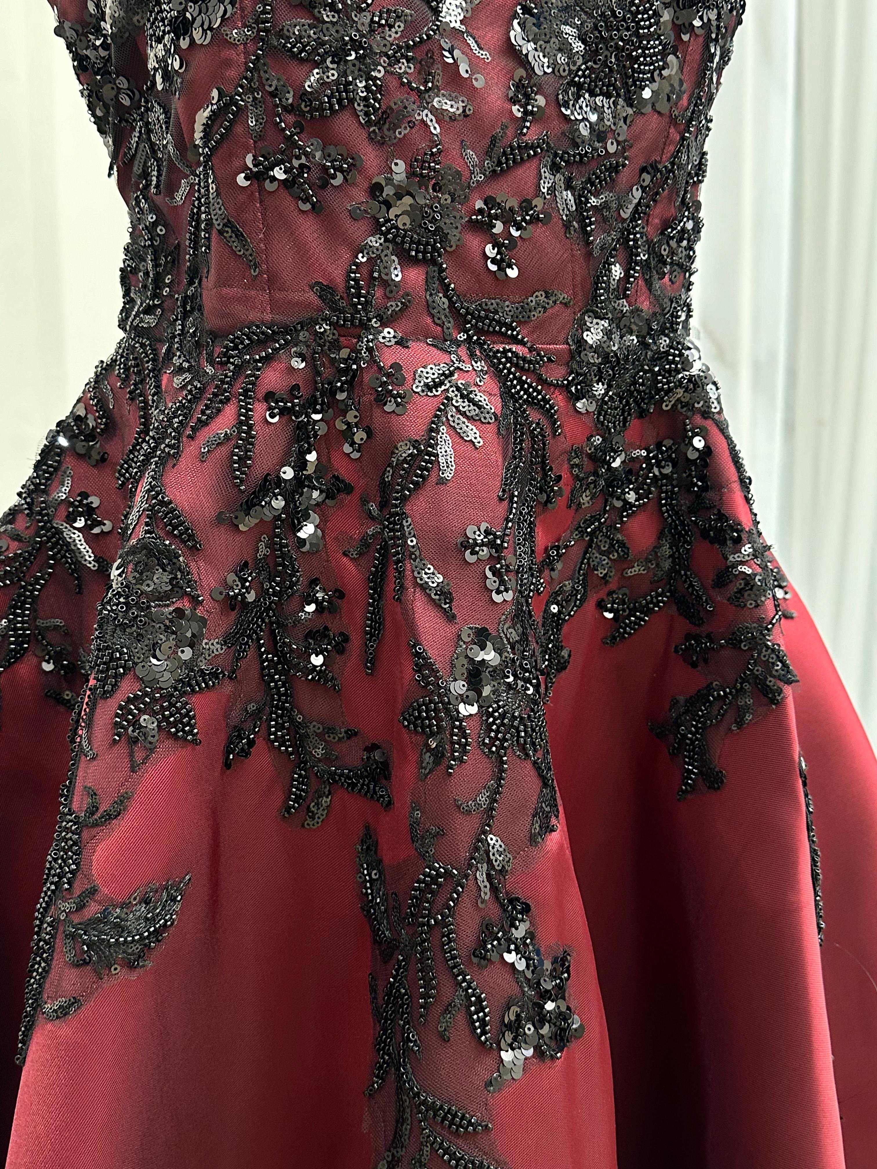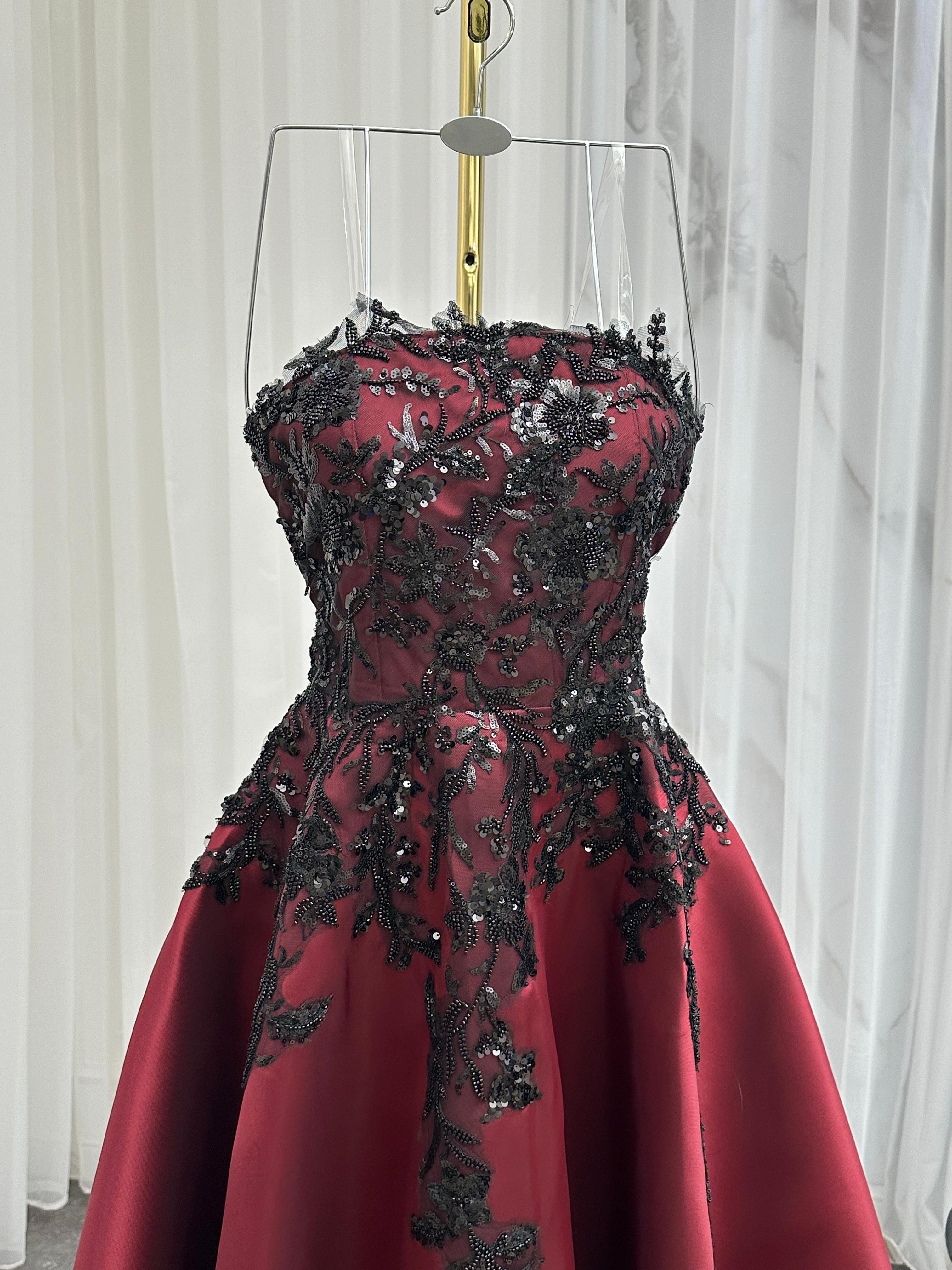 القصة بدون أكمام وبصدر على شكل قلب تعزز جمالية القوام، فيما يبرز التباين بين البورغندي العميق والتطريز الأسود لمسة من الرقي والجاذبية. الفستان مثالي للحفلات الرسمية، حفلات الخطوبة أو المناسبات الفاخرة التي تتطلب حضورًا مميزًا.