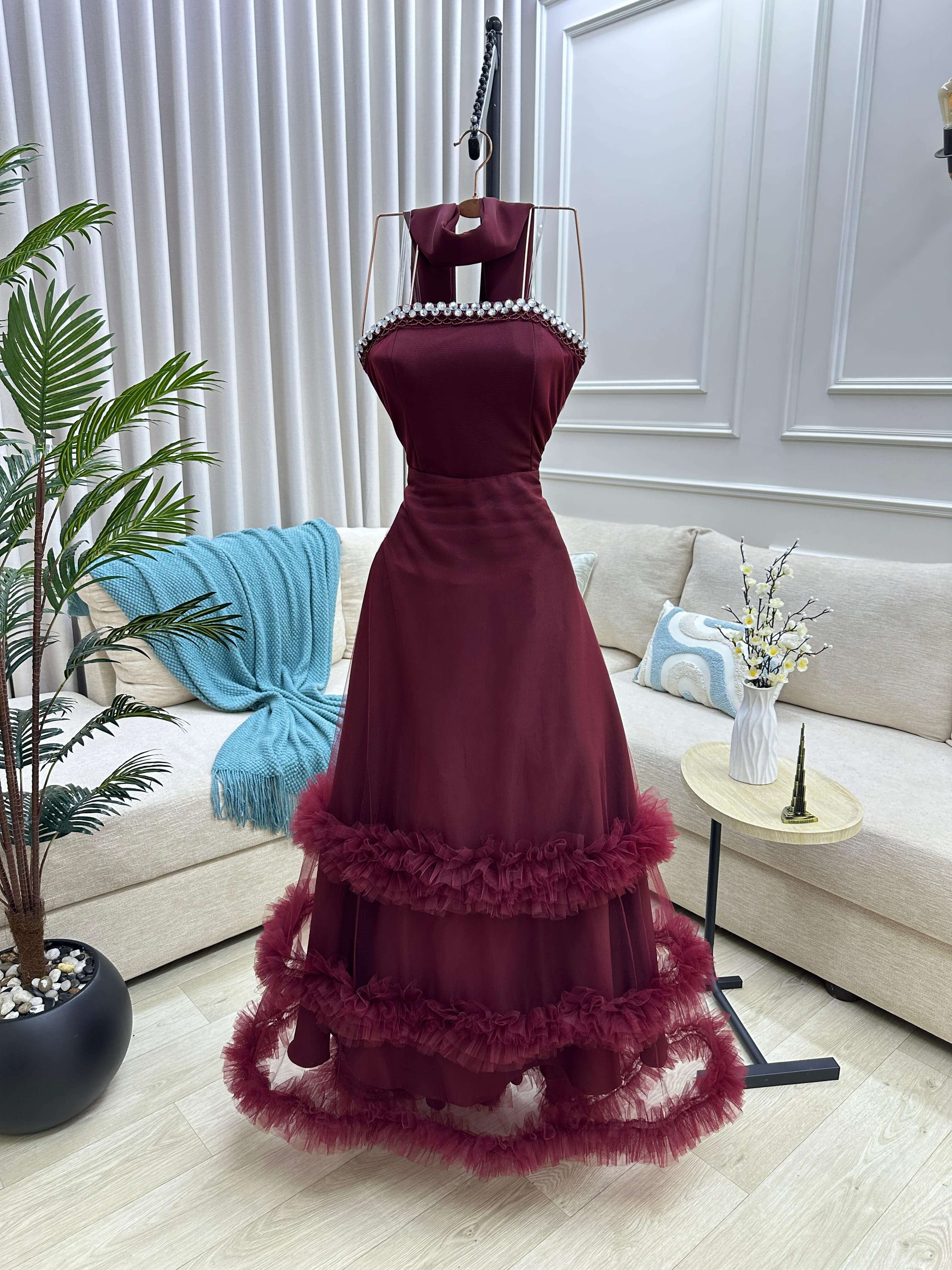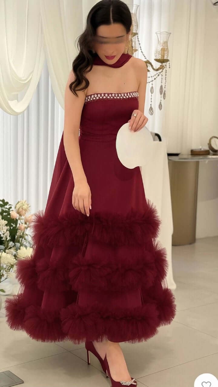 تألقي بجاذبية وفخامة مع هذا الفستان العنابي الساحر المصمم بدون أكمام، مع تطريز كريستالي أنيق يزين خط الصدر، وقصة ضيقة من الأعلى تنسدل إلى تنورة واسعة مزينة بكشكش طبقي فاخر يمنح حجمًا وأناقة استثنائية. مثالي لحفلات الزفاف، الخطوبة، والسهرات الكبرى. نسقيه مع أقراط لامعة وحقيبة كلاتش معدنية لإطلالة مكتملة.