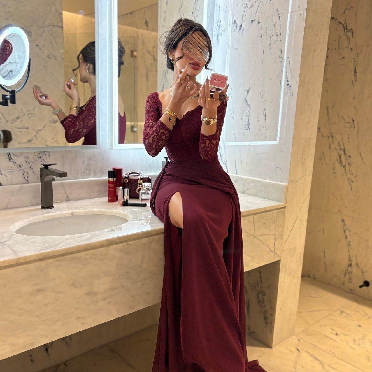 هذا الفستان الطويل باللون البورغندي الداكن يجمع بين الأناقة والفخامة. الجزء العلوي مصنوع من دانتيل راقٍ بأكمام طويلة يضيف لمسة كلاسيكية ساحرة، بينما ينساب القماش الناعم بانسيابية ليعكس أنوثة مميزة. الشق الجانبي العالي يمنح إطلالة جريئة وعصرية، مع ذيل ممتد يضفي حضورًا ملكيًا.