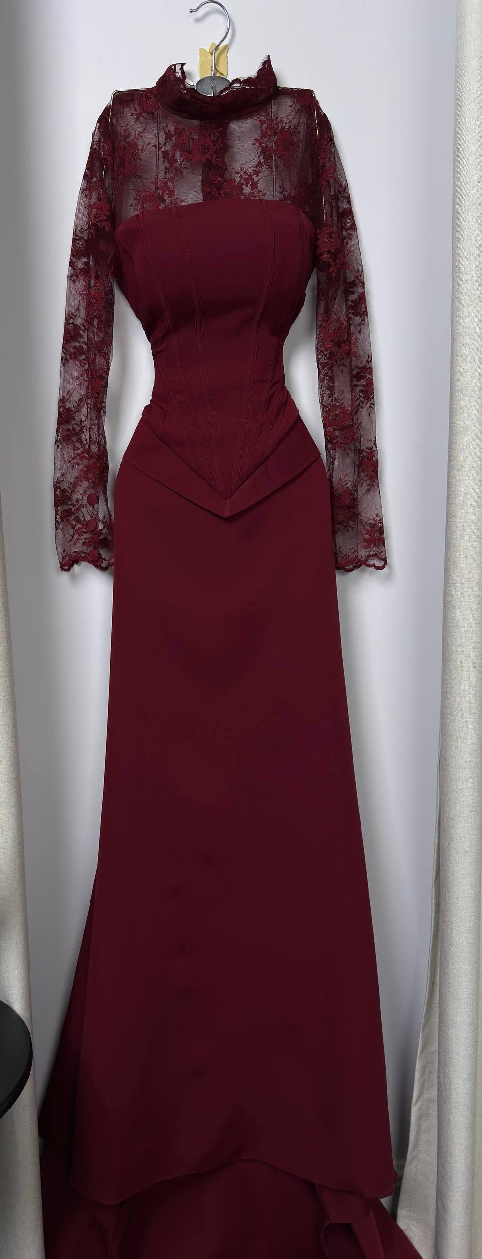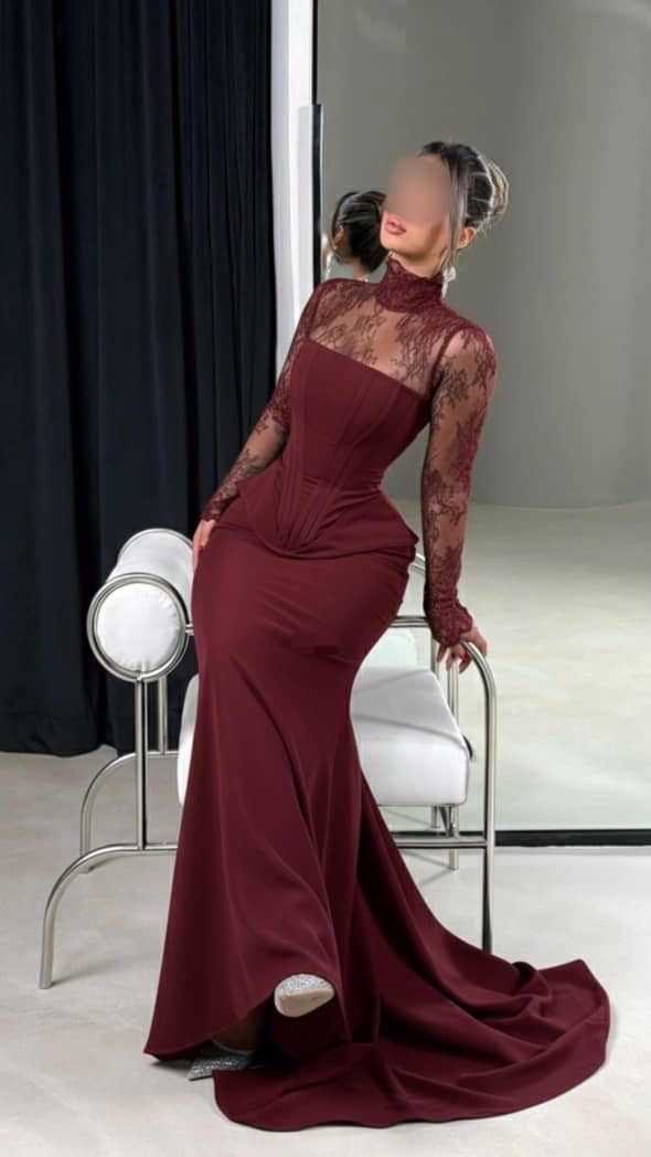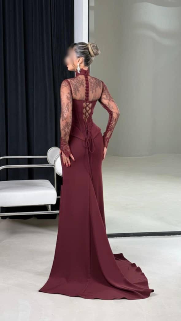 فستان سهرة عنابي يجمع بين قوة اللون وأناقة التفاصيل.