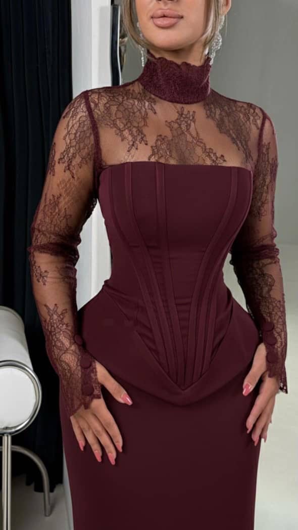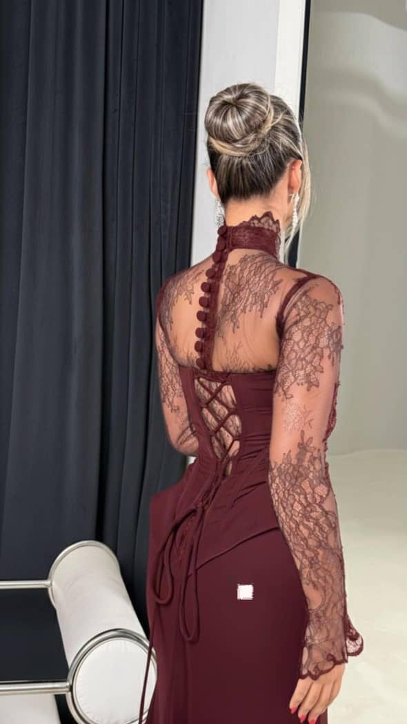 يأتي بصدريّة دانتيل راقية مع ياقة عالية تضيف لمسة كلاسيكية ساحرة، بينما يبرز الكورسيه المنحوت جمال الخصر ويمنح التصميم شكلاً أنثويًا واضحًا.