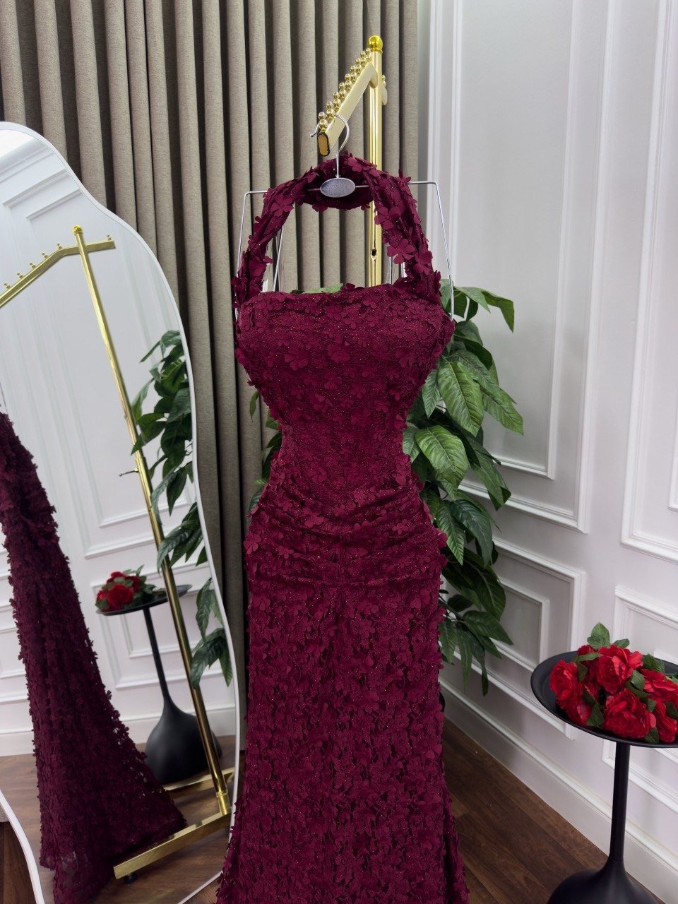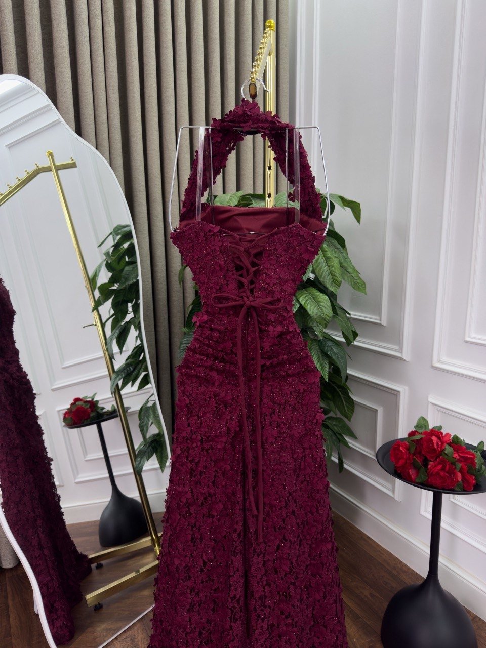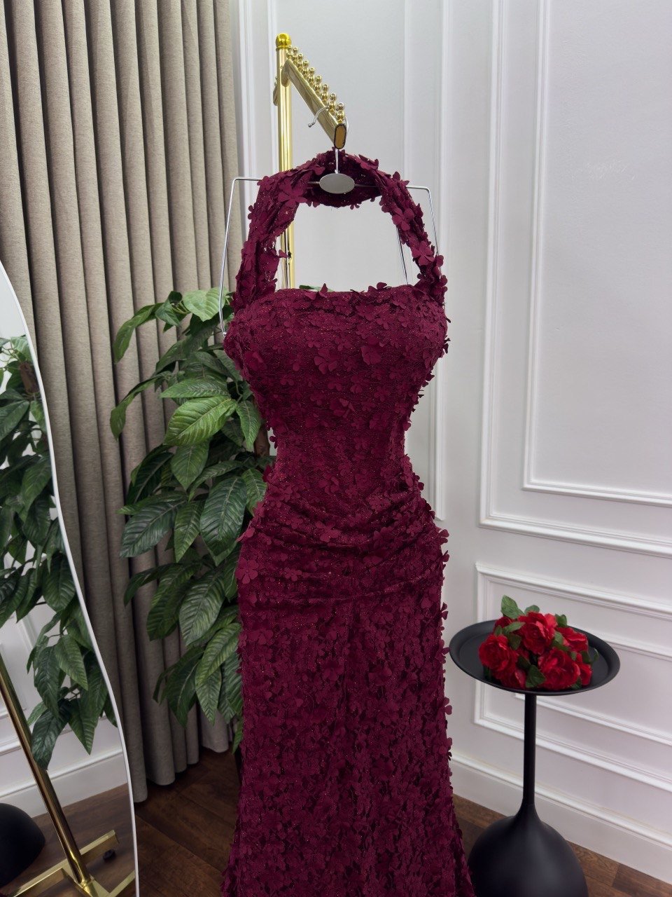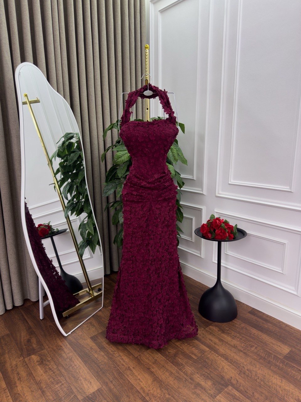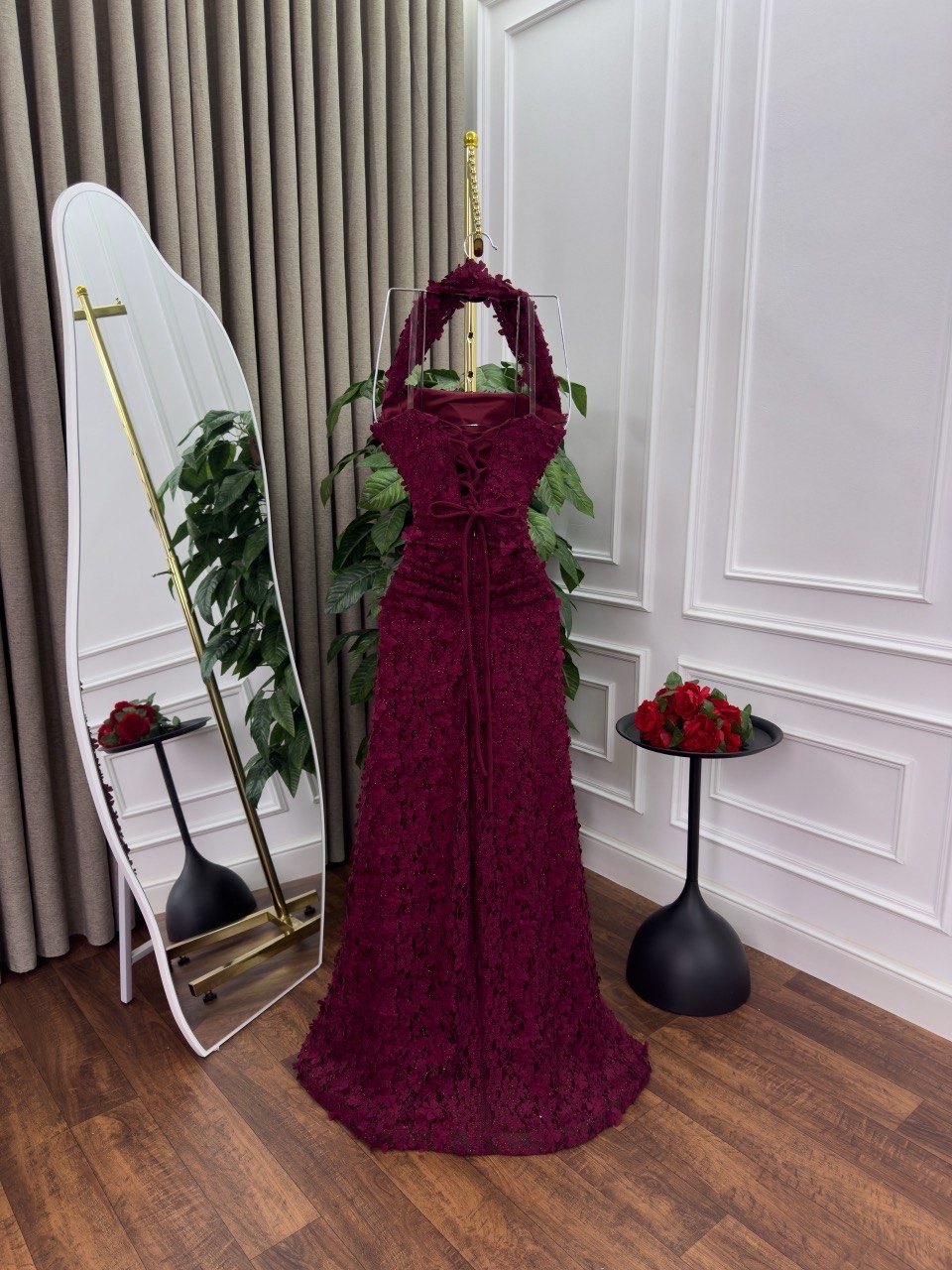 فستان سهرة فاخر باللون العنابي الجذاب، مصنوع من قماش الدانتيل المطرز بتفاصيل دقيقة تعكس الفخامة والرقي. يتميز بتصميم ضيق يحدد الخصر ويبرز أنوثة القوام، مع ياقة أنيقة تربط حول الرقبة تضفي لمسة ملكية جذابة. هذا الفستان خيار مثالي للسهرات، حفلات الخطوبة والمناسبات التي تحتاجين فيها إلى إطلالة مميزة تترك أثرًا لا يُنسى.