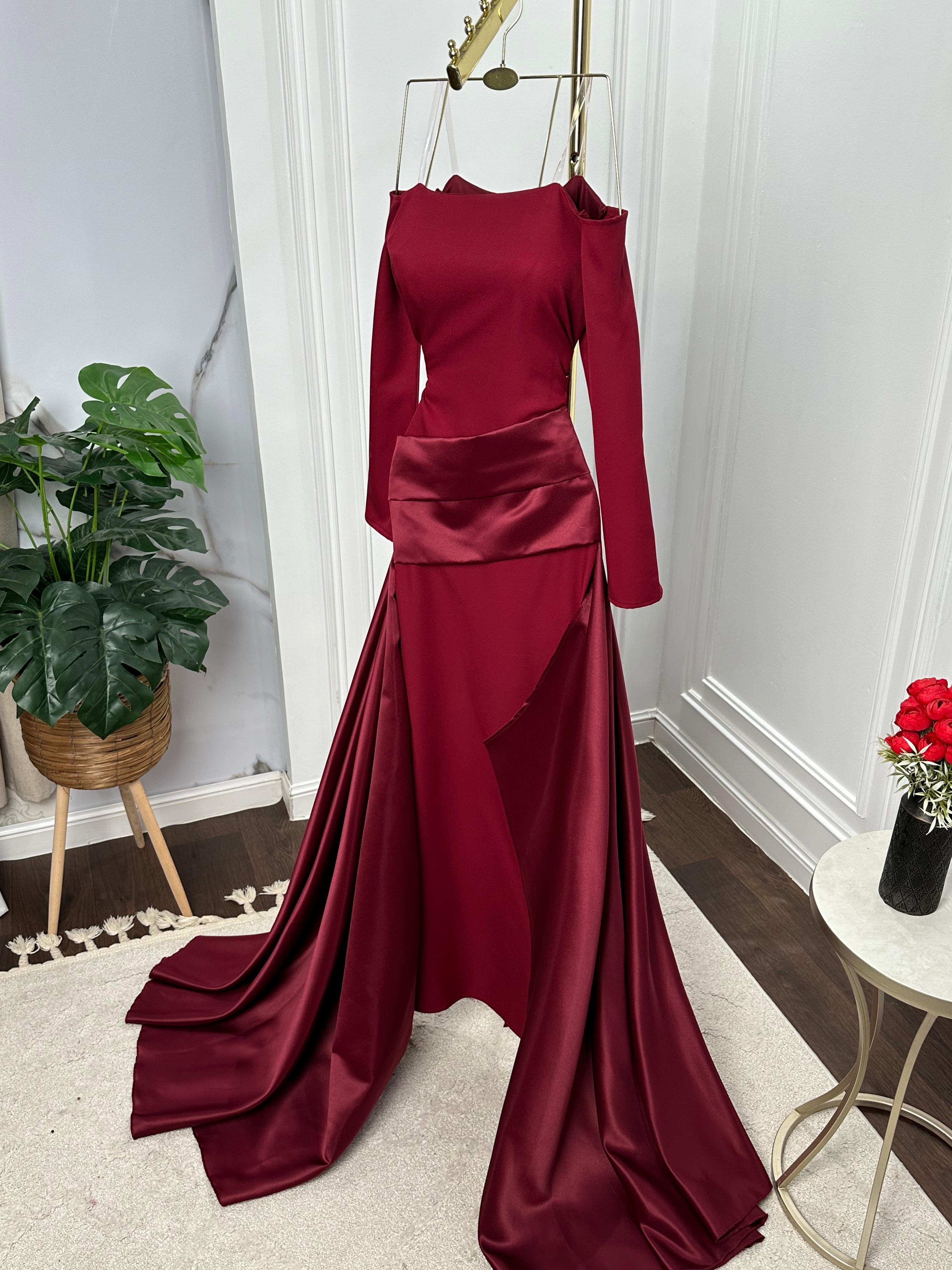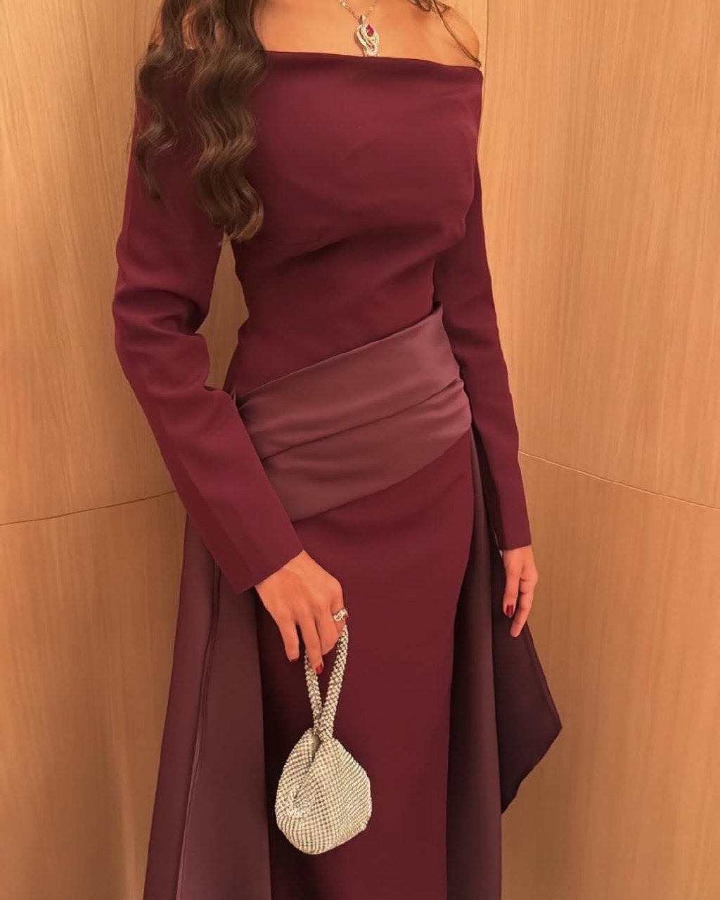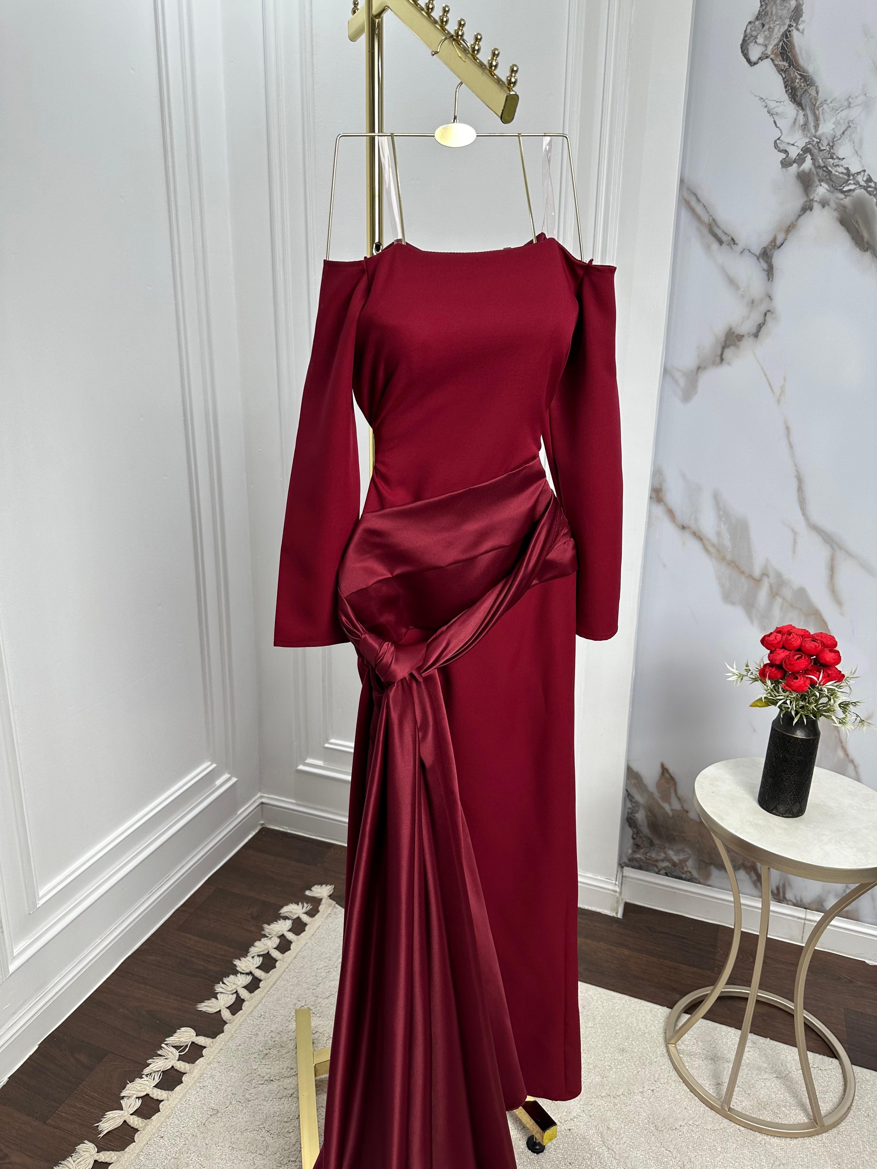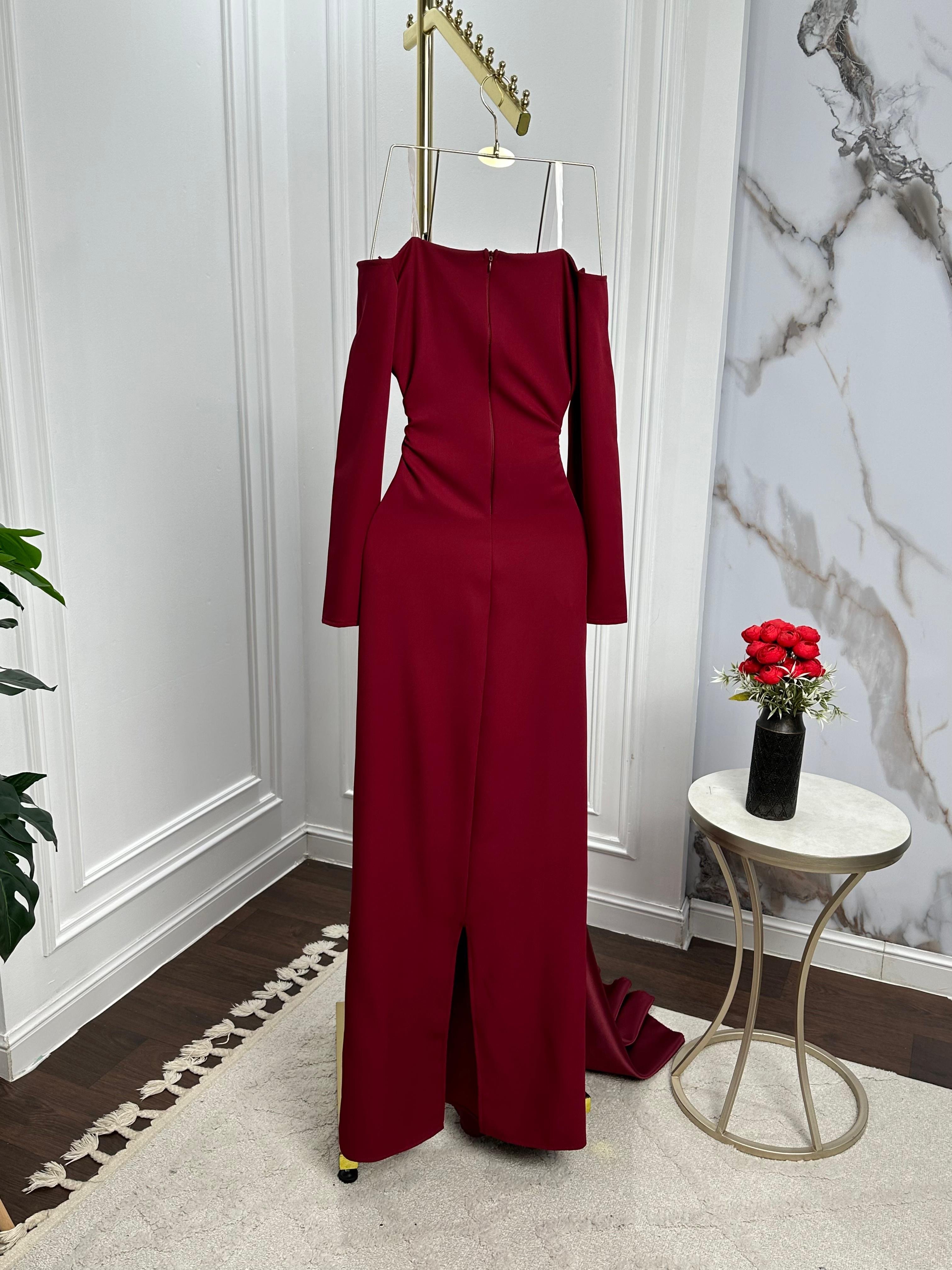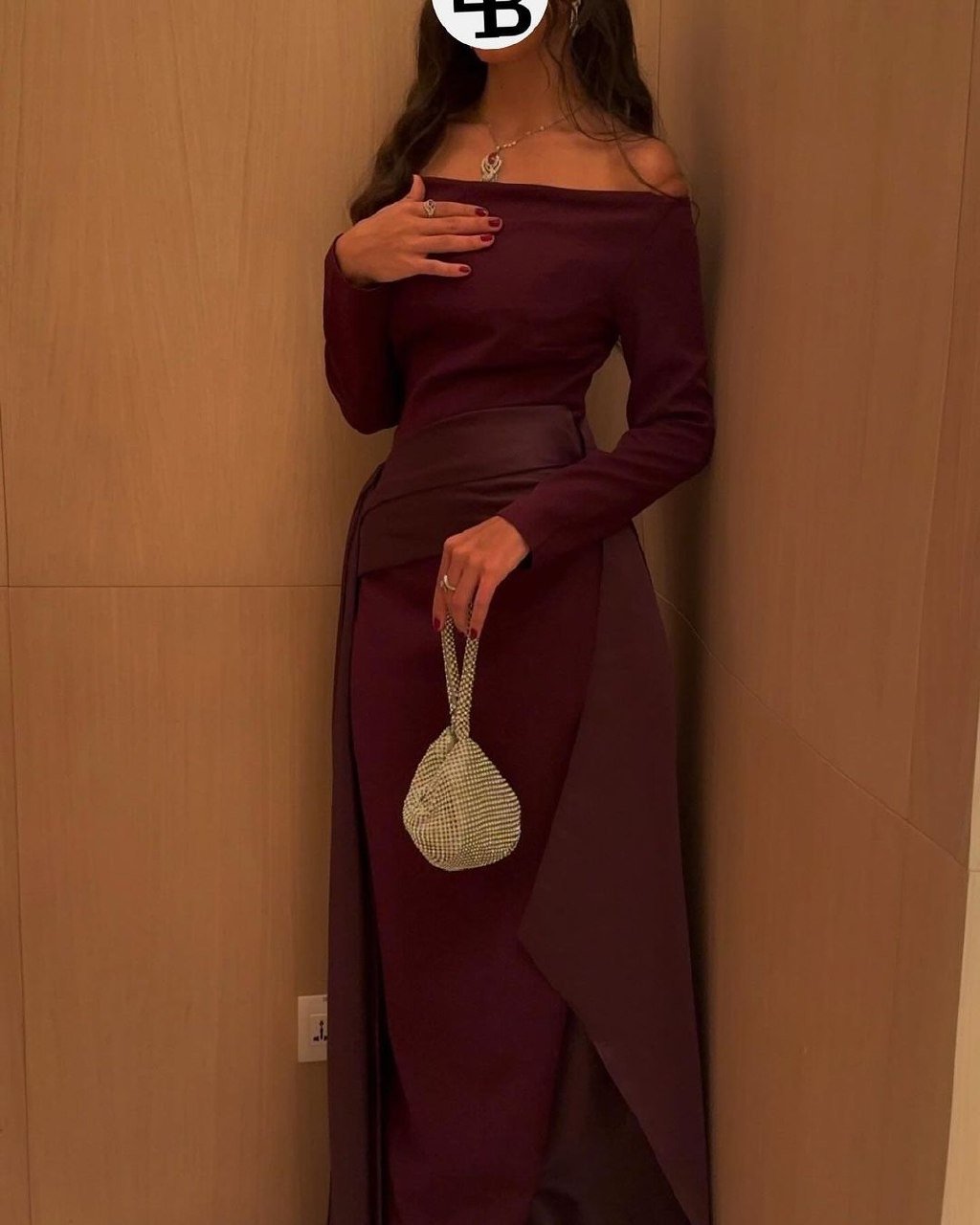 .أبهري الجميع بإطلالة ملوكية لا تُنسى مع هذا الفستان الفاخر بلونه الخمري العميق وتصميمه الراقي. يتميز الفستان بقصة “أوف شولدر” جذابة تبرز جمال الرقبة والكتفين، مع أكمام طويلة تضيف لمسة من الرقي.