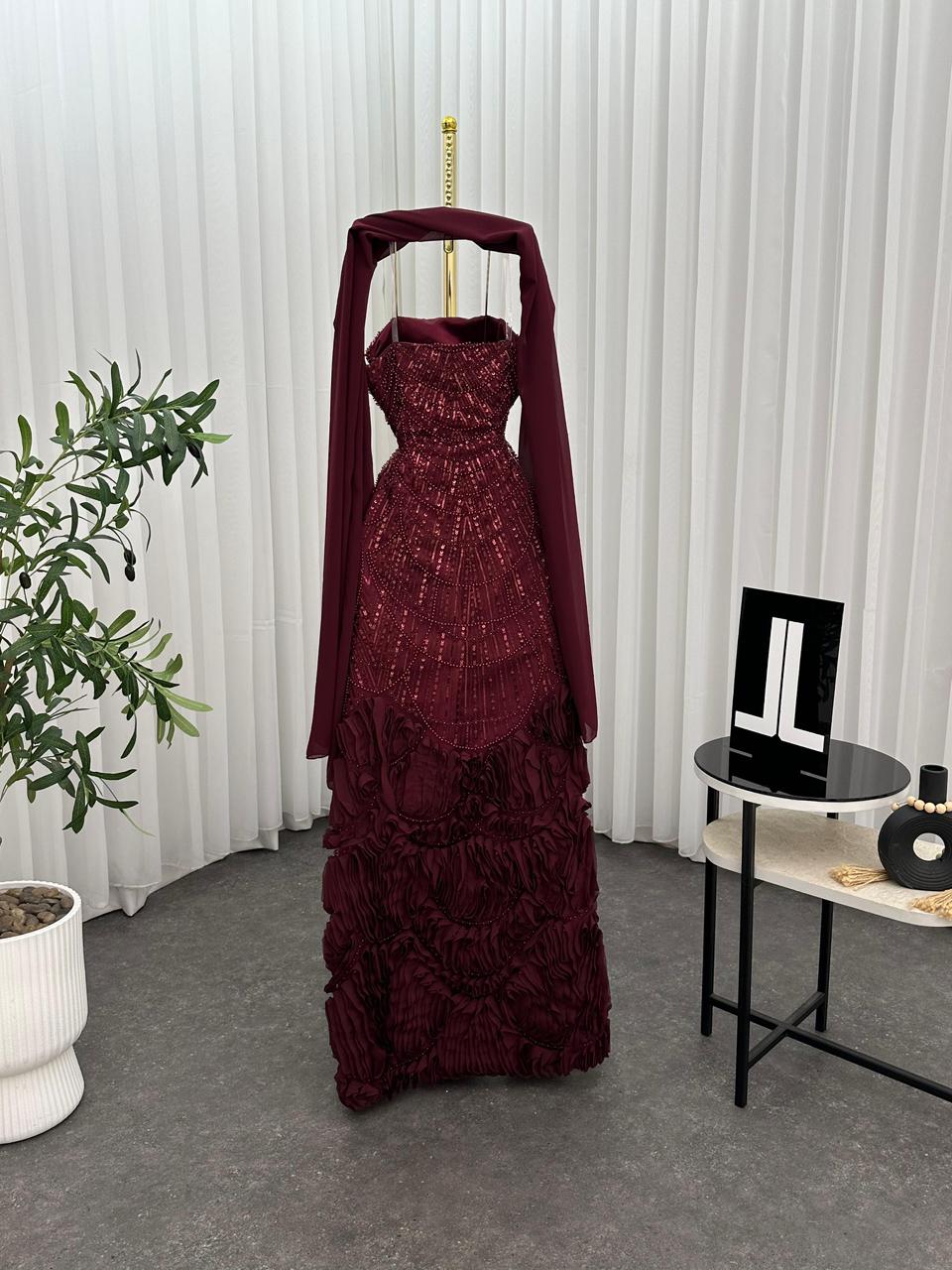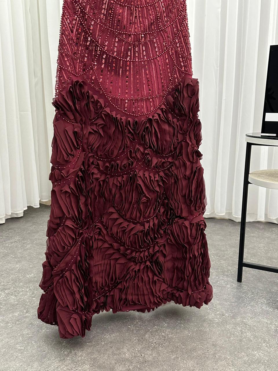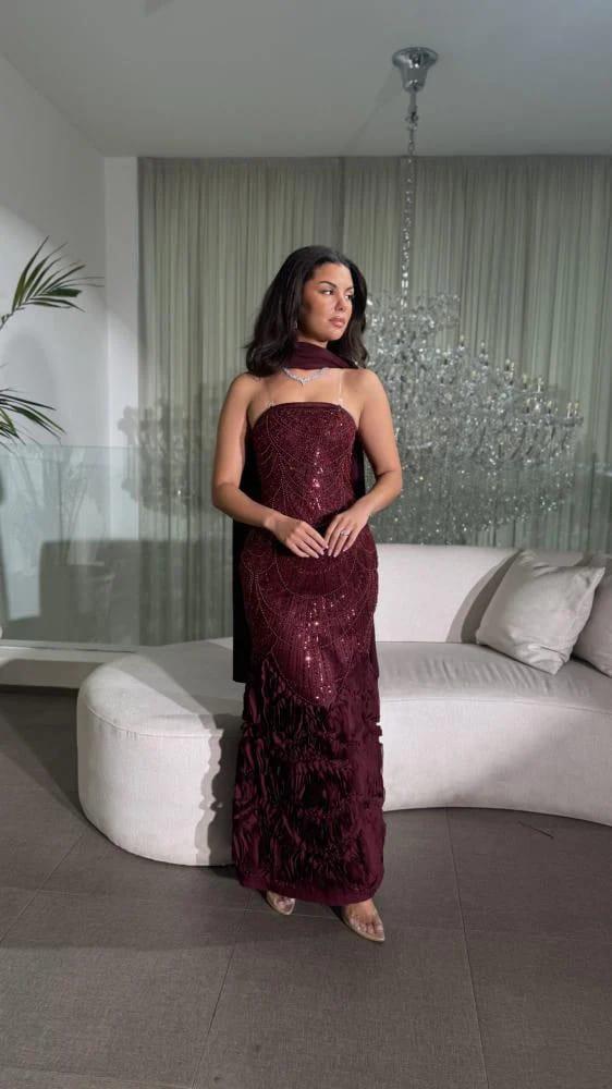 استعدي لتكوني محط الأنظار مع هذا الفستان العنابي الفخم، المصمم بتفاصيل دقيقة من الترتر والكريستالات التي تنسدل بتناسق لامع يضفي فخامة ملكية. قصة ضيقة بدون أكمام تعزز من تناسق الجسم، بينما تضيف الشراشيب السفلية لمسة درامية ناعمة وأنيقة. خيار مثالي لإطلالة جريئة وفاخرة في أهم مناسباتك.
