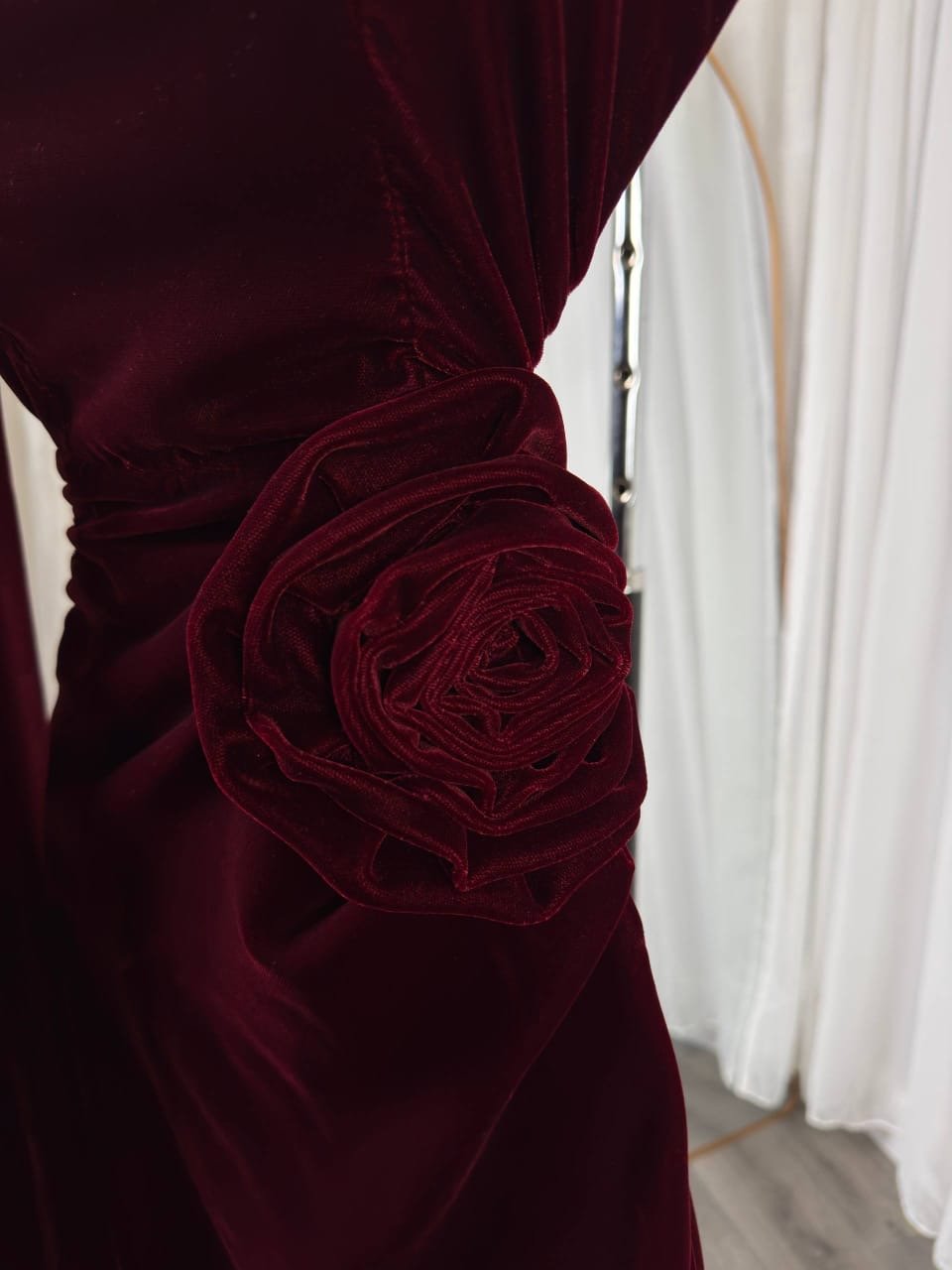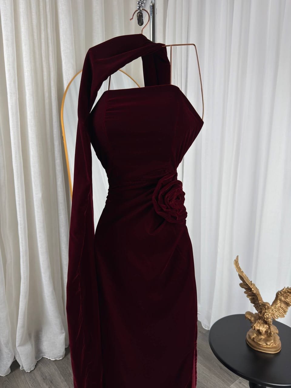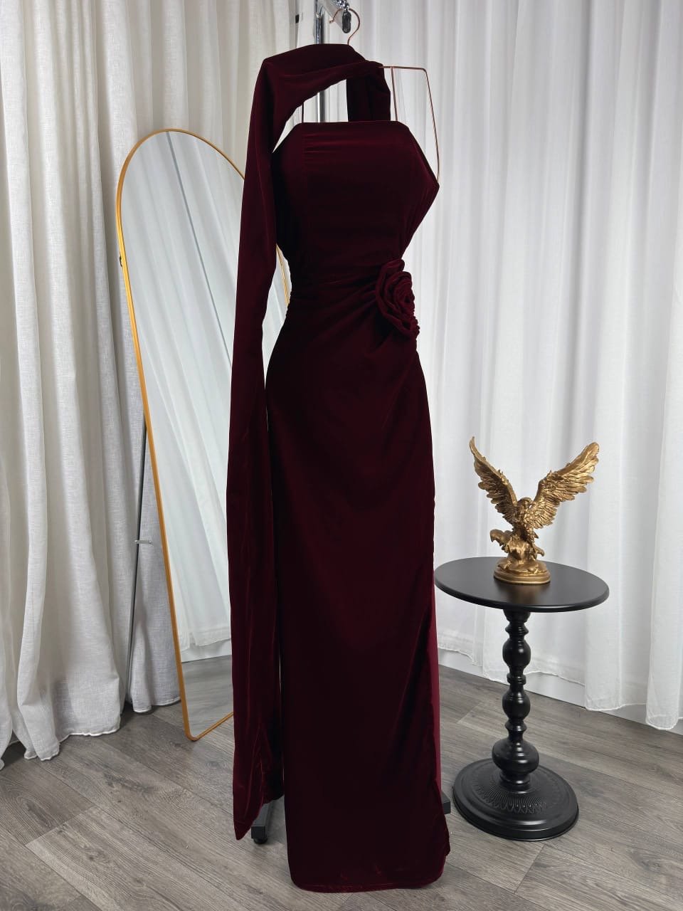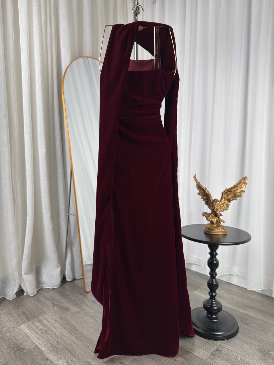 فستان سهرة فاخر من المخمل الناعم بلونه العنّابي العميق الذي يعكس فخامة الشتاء وأناقة المساء.