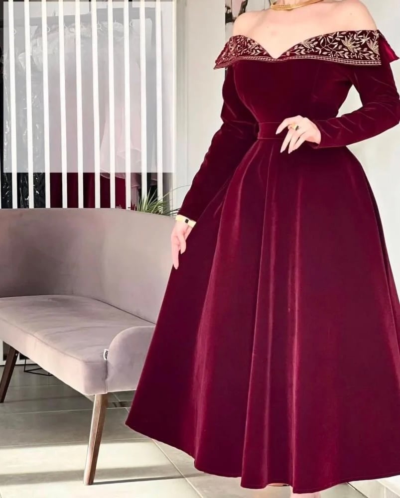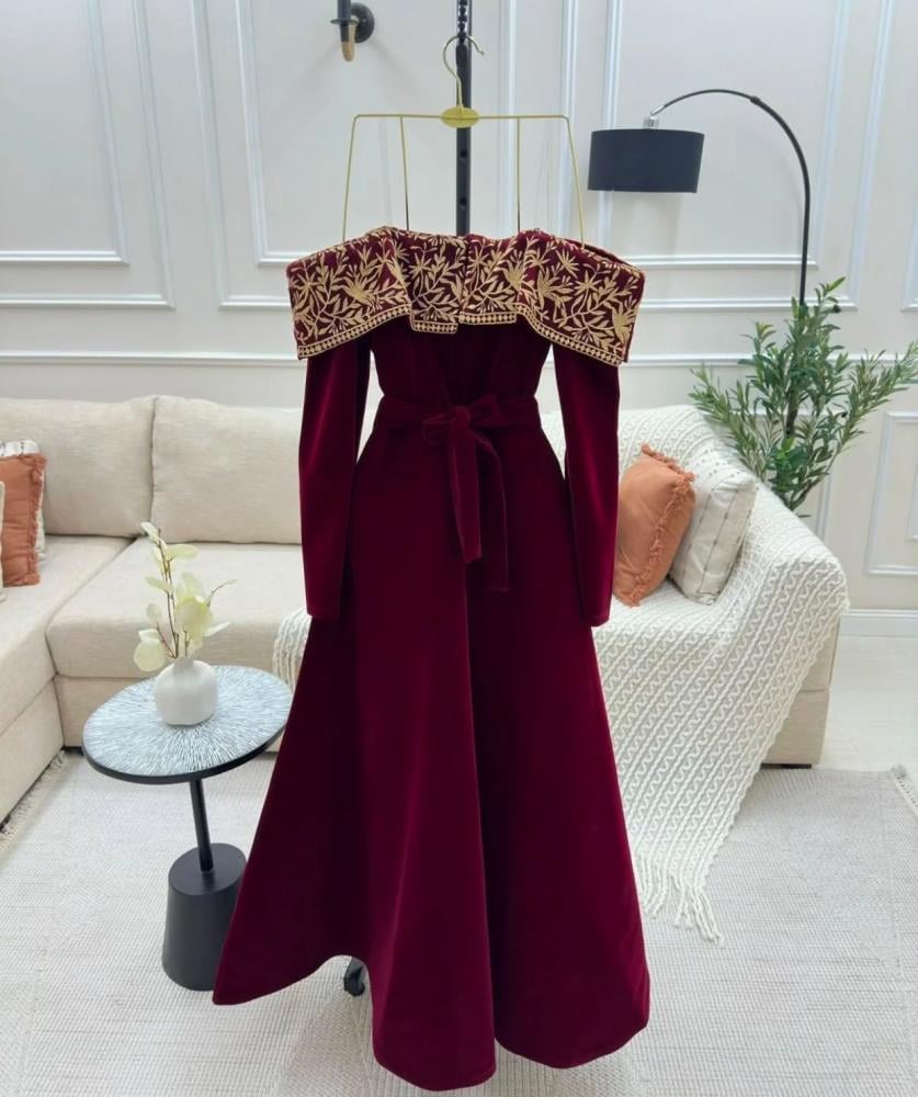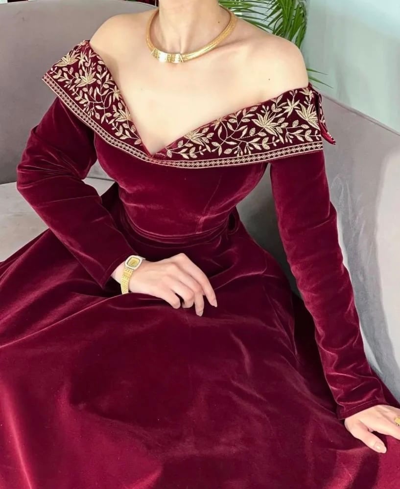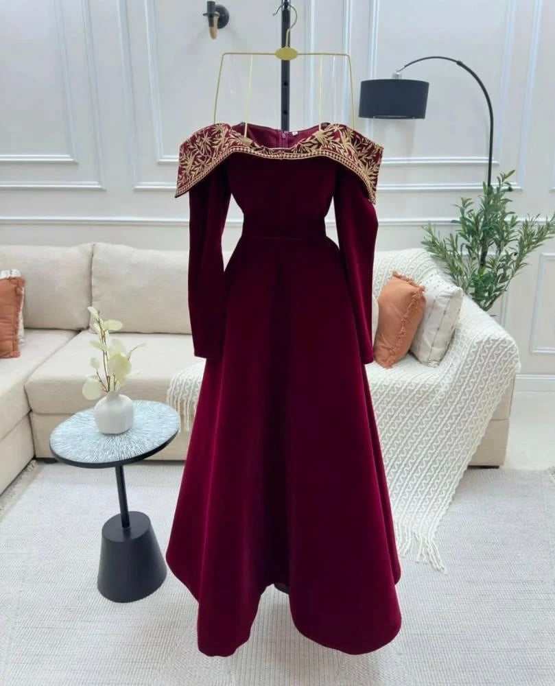 فستان مخملي بلون عنّابي عميق، مزيّن بتطريز ذهبي فاخر على الأكتاف بتصميم عريض يعطي هالة ملكية جميلة حول الوجه.
