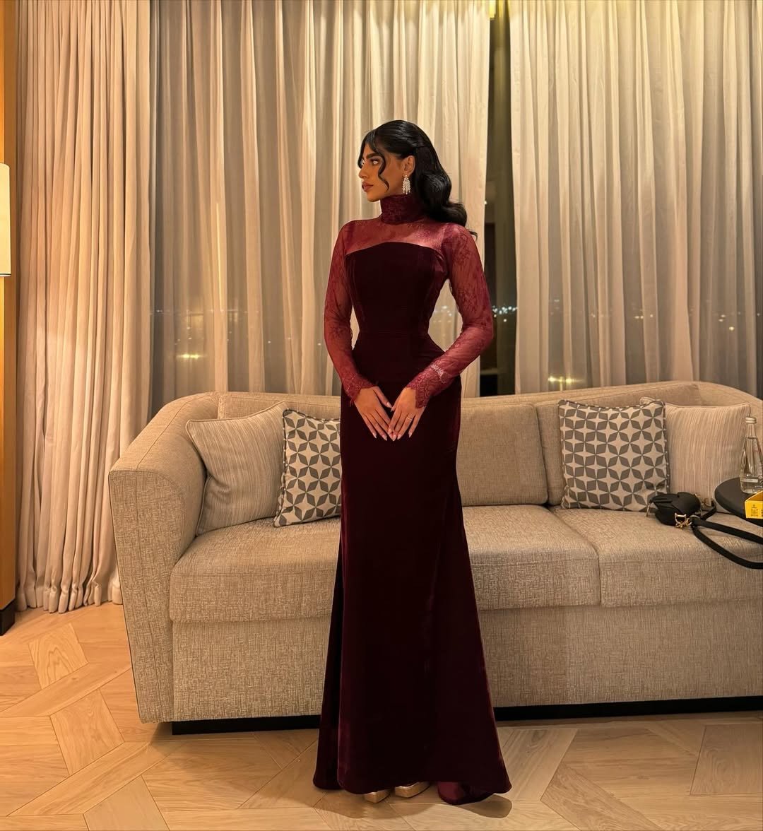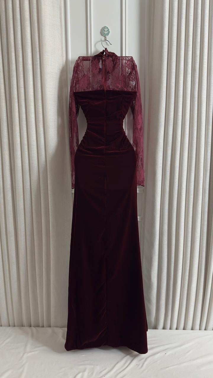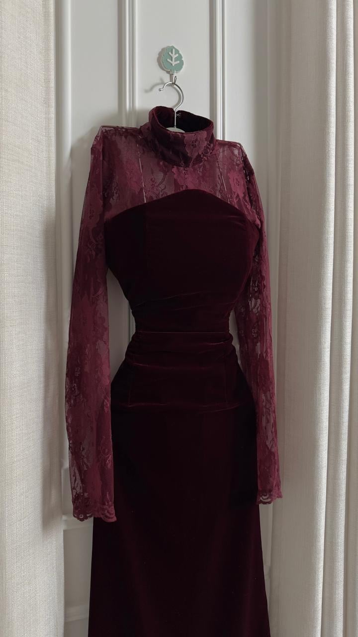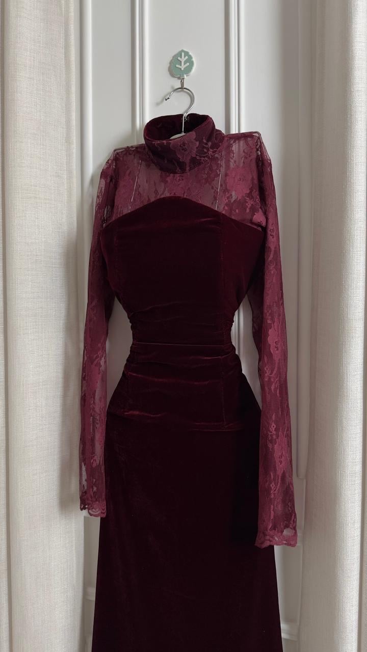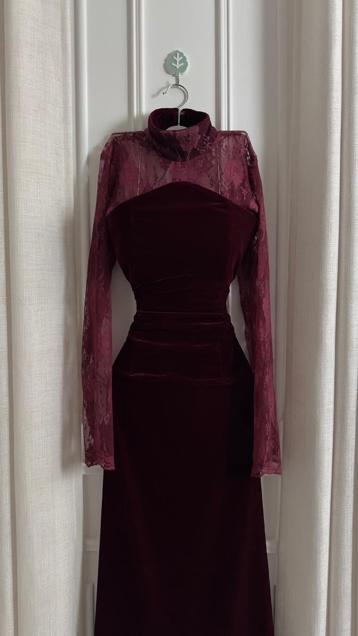 المخمل يعطيه عمق وفخامة ما تحتاج أي شرح، والدانتيل الناعم حول الأكمام والياقة يضيف لمسة أنثوية راقية بدون ما يفقد التصميم هيبته.