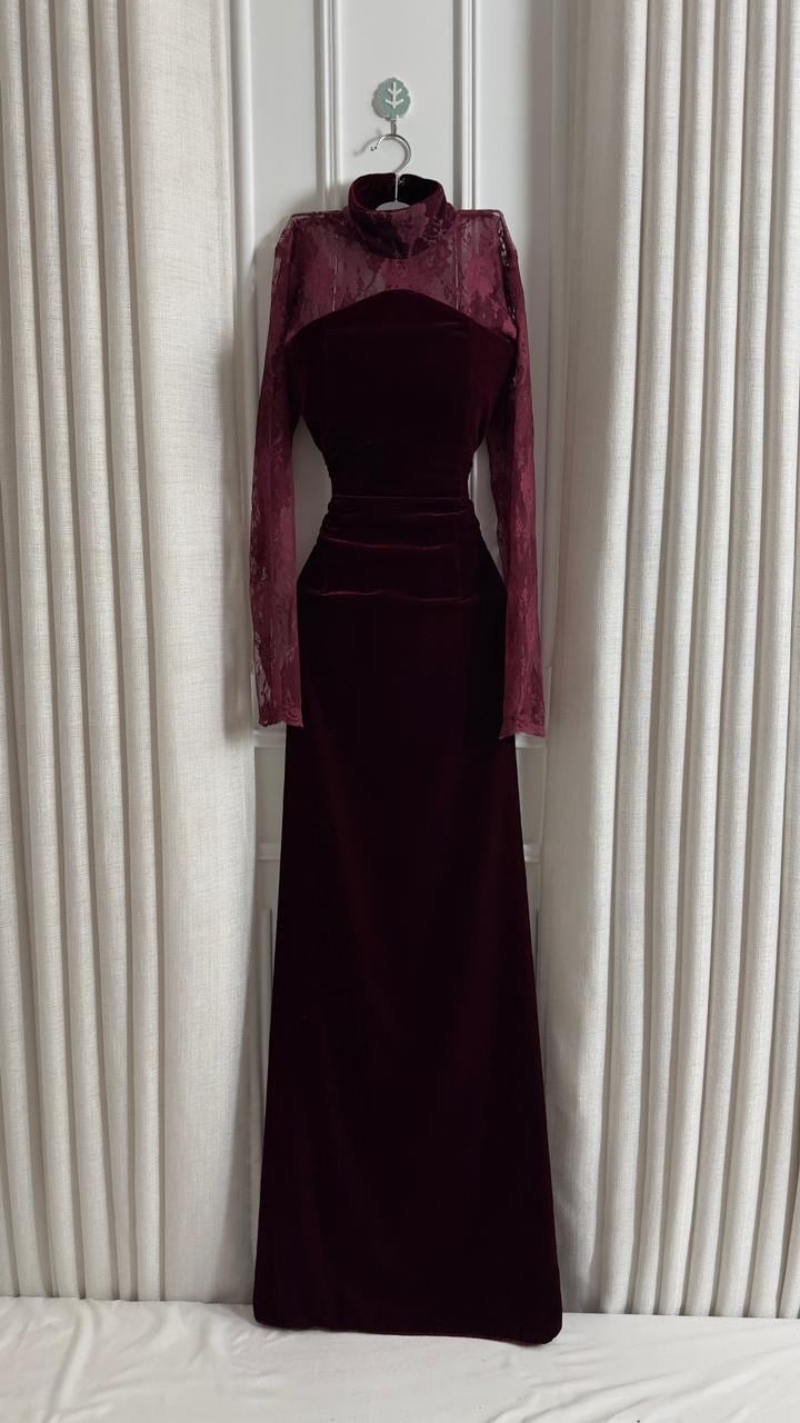 فستان خمري ينبض وقار.