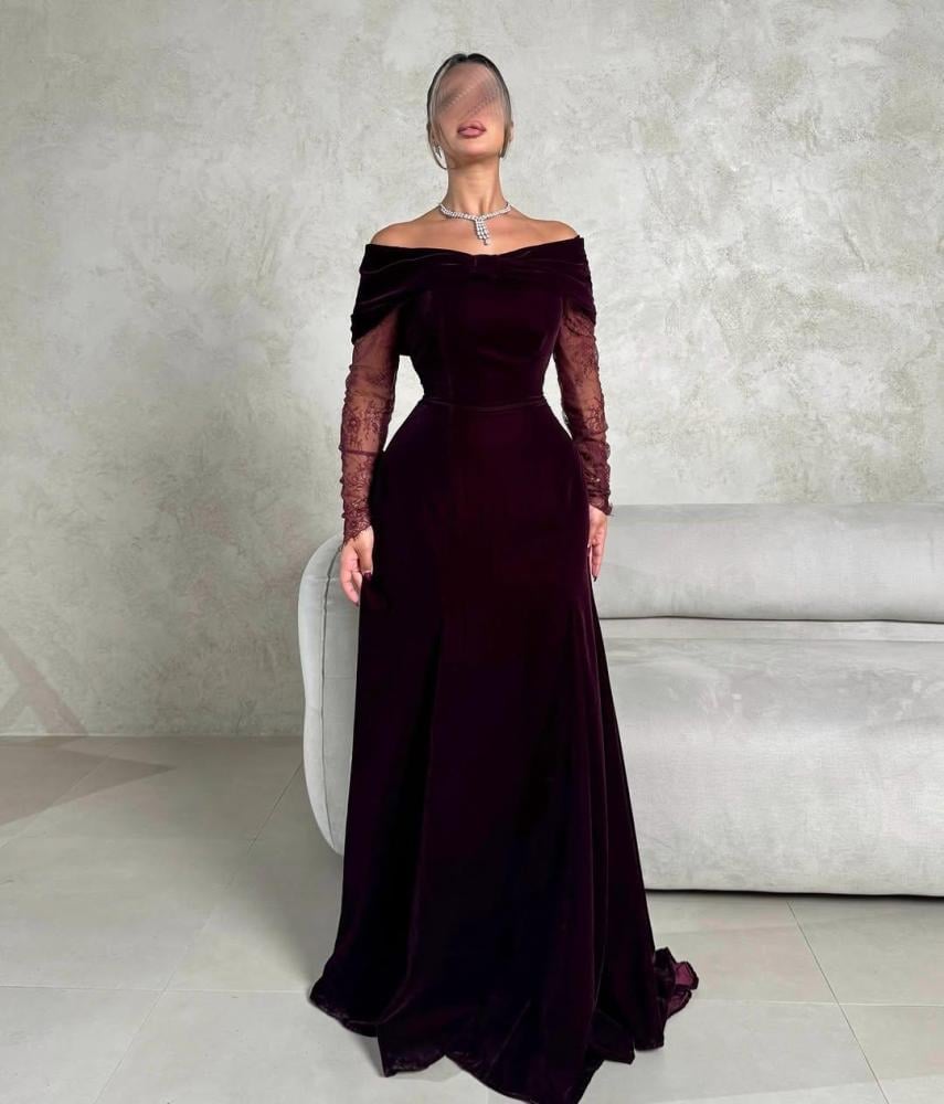 فستان عنّابي فاخر مصنوع من قماش المخمل الفخم الذي يضفي عمقًا ولونًا غنيًا تحت الإضاءة.