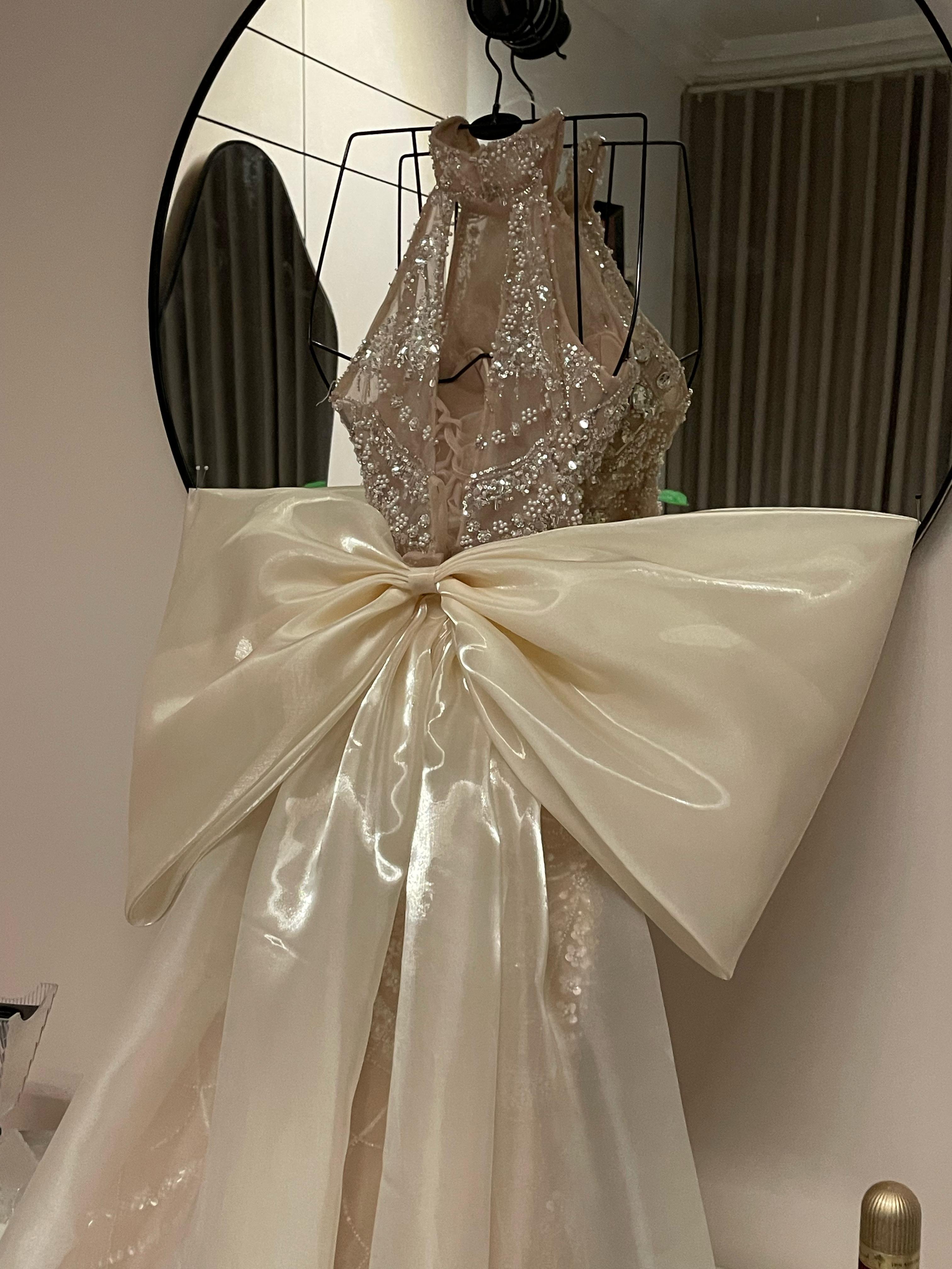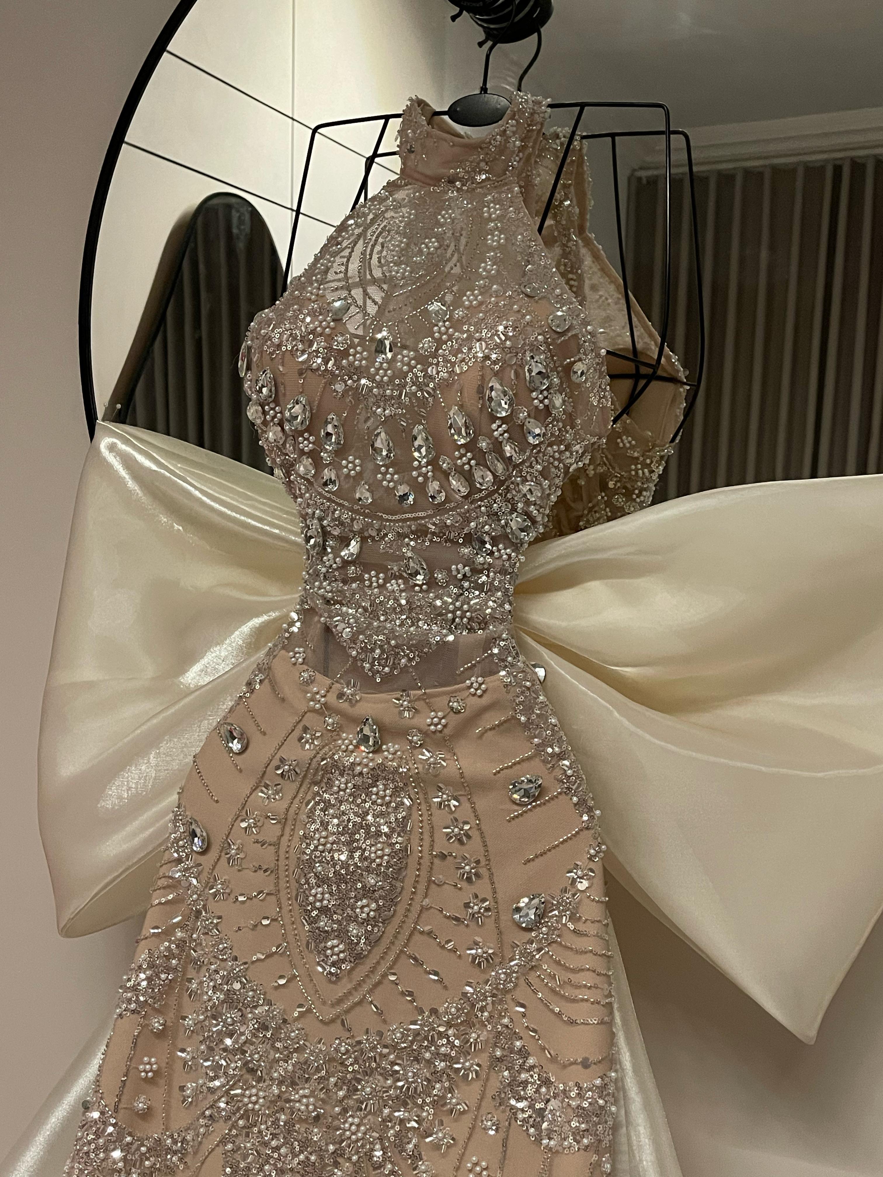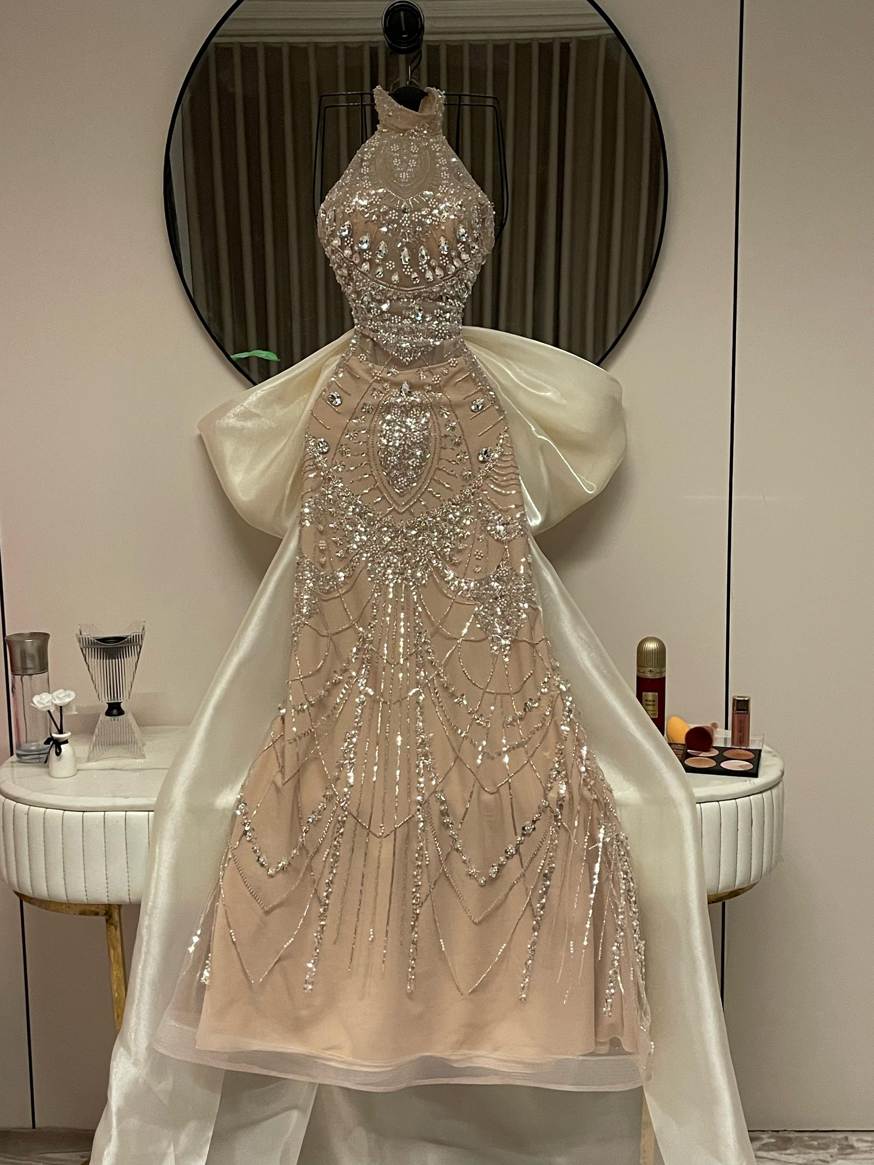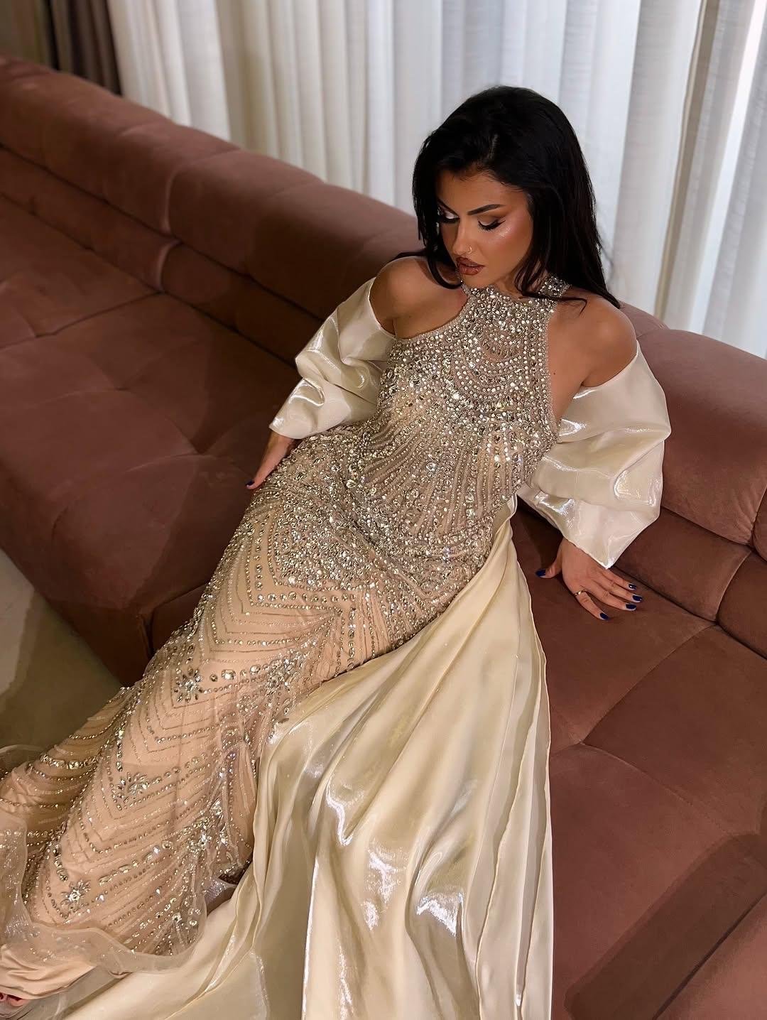 فستان شامباني فاخر يفيض بالفخامة والأنوثة الراقية.