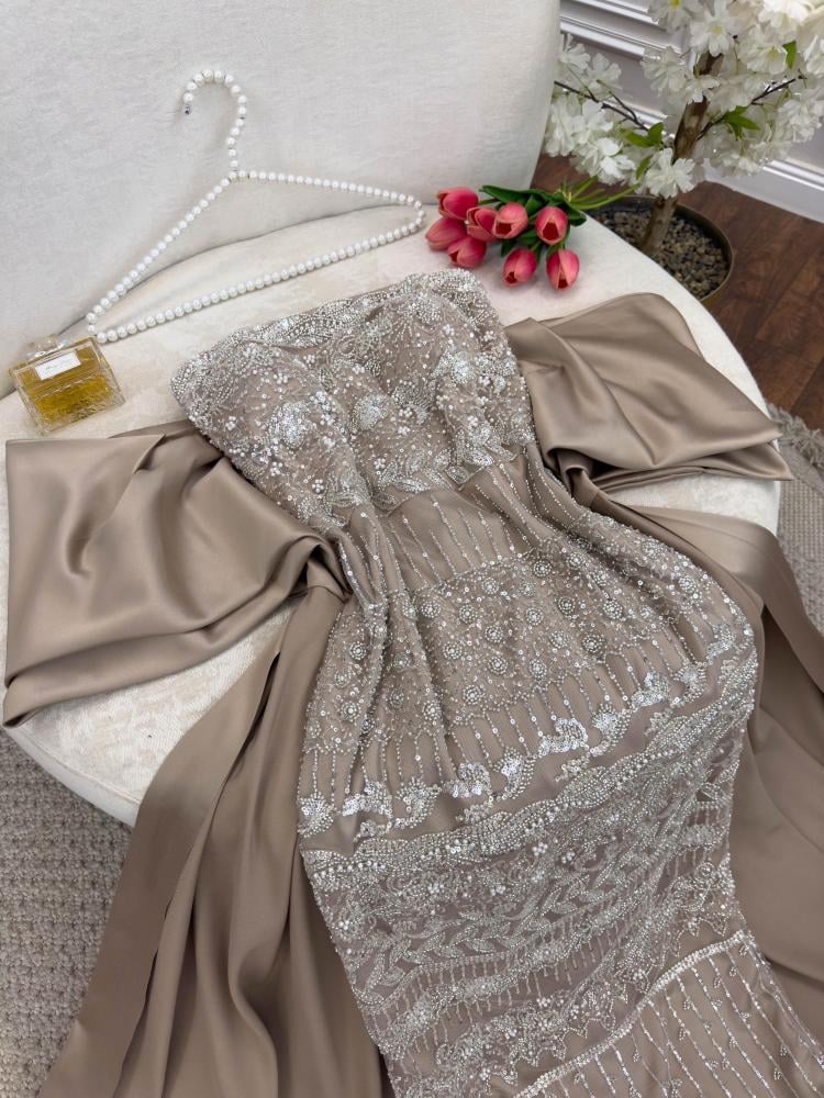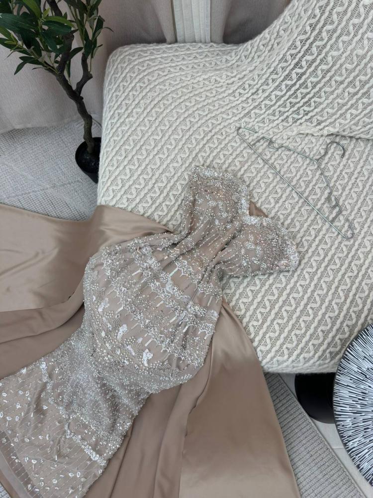 فستان سهرة شامبين راقٍ بتصميم مطرز بالكريستال والخرز المتلألئ ليمنحك إطلالة مبهرة في أجواء المساء. يتميز بذيل واسع انسيابي يضفي لمسة ملكية آسرة، مع قصة ضيقة تبرز جمال القوام ورقّة الخصر. الفستان مثالي لحفلات الزفاف، السهرات الرسمية، والظهور المتألق في المناسبات الخاصة.