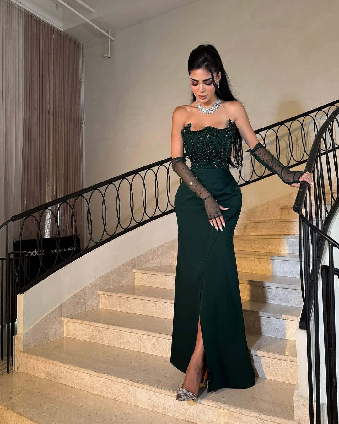 تألقي بإطلالة ملكية مع هذا الفستان الأخضر الداكن الفخم، المصمم بقصة ضيقة وبديكور مطرز بالخرز اللامع على منطقة الصدر ليعكس الفخامة والرقي. يتميز بفتحة أمامية أنيقة وقماش انسيابي يضفي لمسة من الجاذبية، مع قفازات شبكية طويلة مرصعة بالخرز تضيف لمسة عصرية راقية. مثالي للسهرات الكبرى وحفلات الزفاف والخطوبة. نسقيه مع عقد لامع وحقيبة كلاتش معدنية لإطلالة متكاملة.